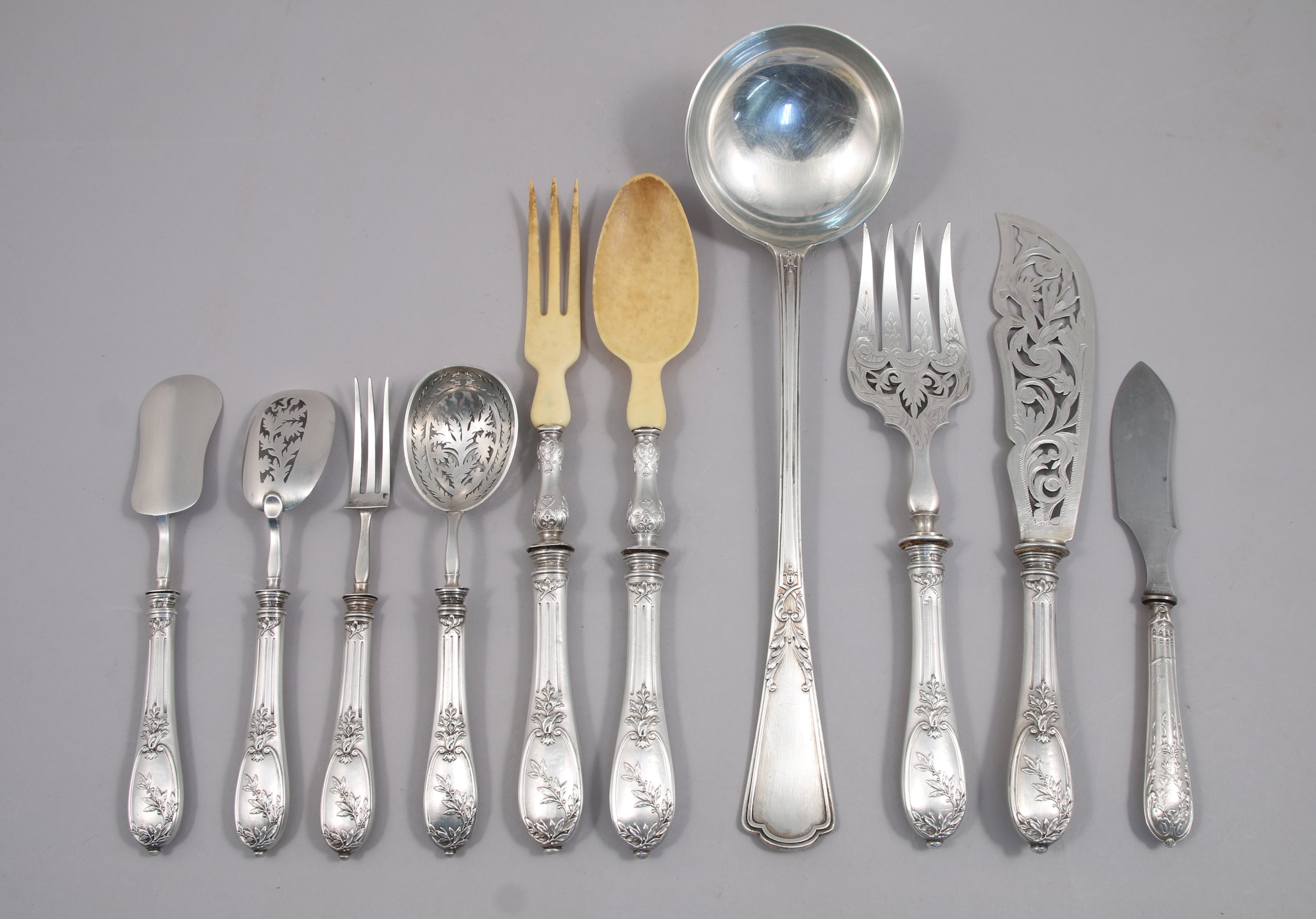 MÉNAGÈRE en argent de 136 pièces richement décorées de feuillages et fleurs, monogramées en applique "HL" comprenant: