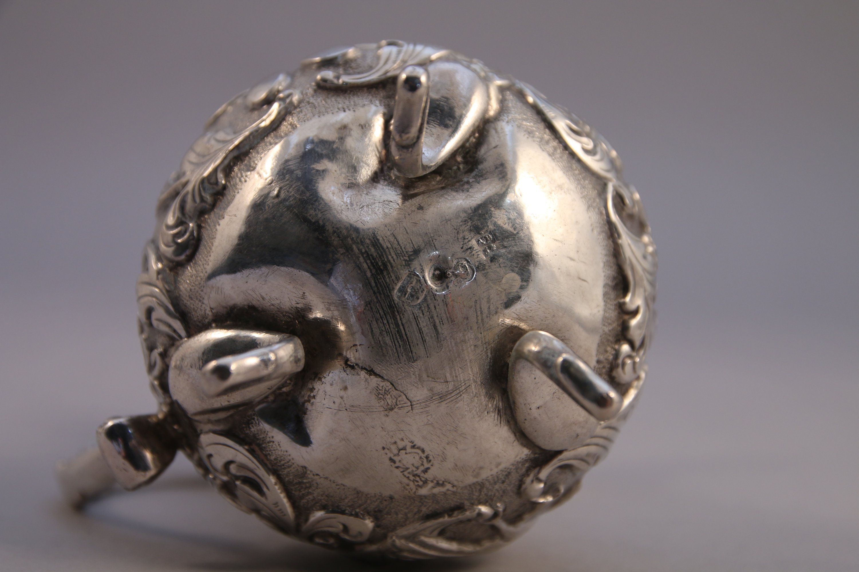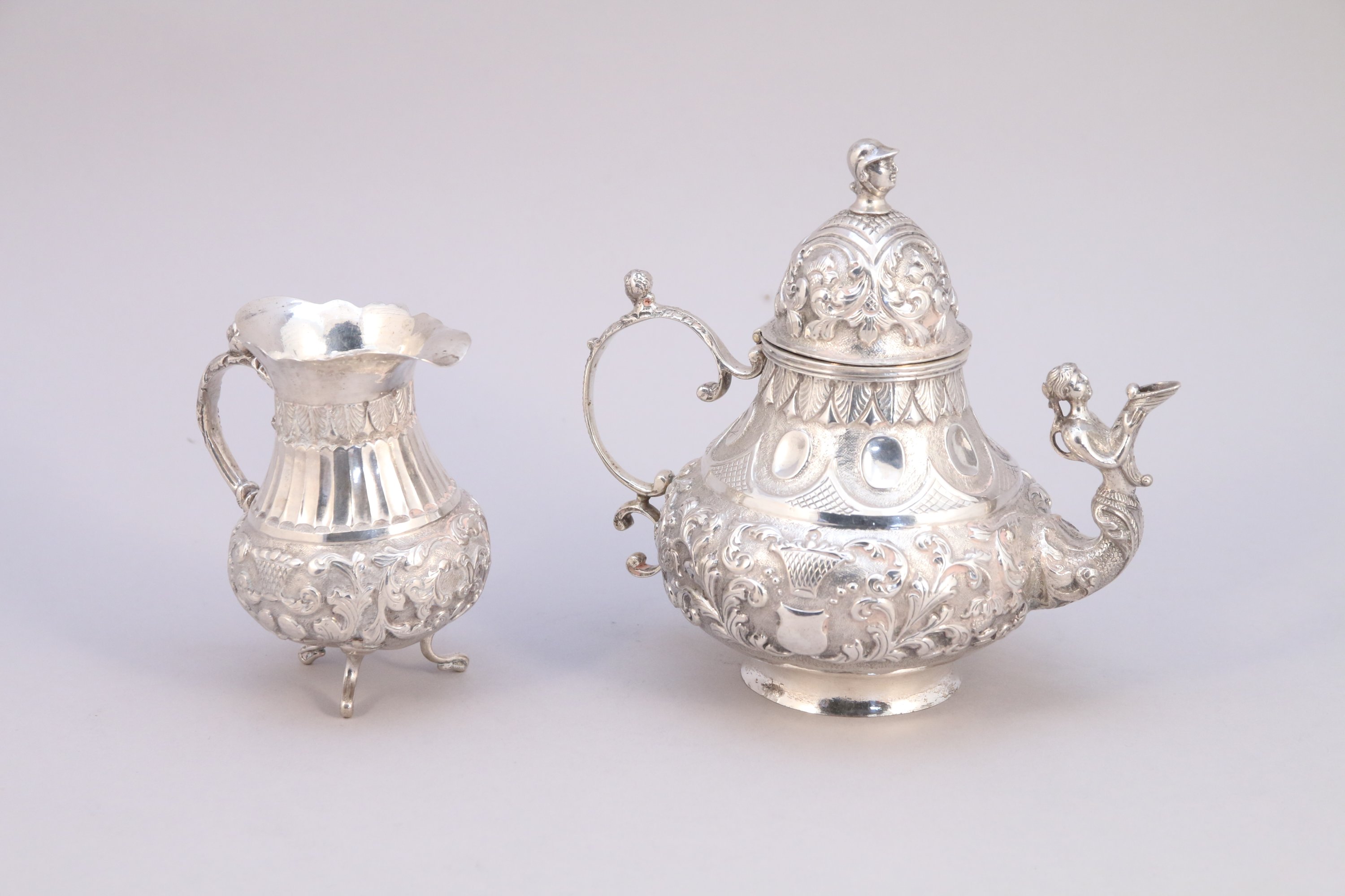 THÉIÈRE à panse surbaissée et un POT à LAIT en argent. Riche décor au repoussé de rinceaux, canaux feuillagés, figure féminine casquée en fretel. buste féminin à la corne d'abondance en bec verseur. Le pot à lait reposant sur un piétement tripode.