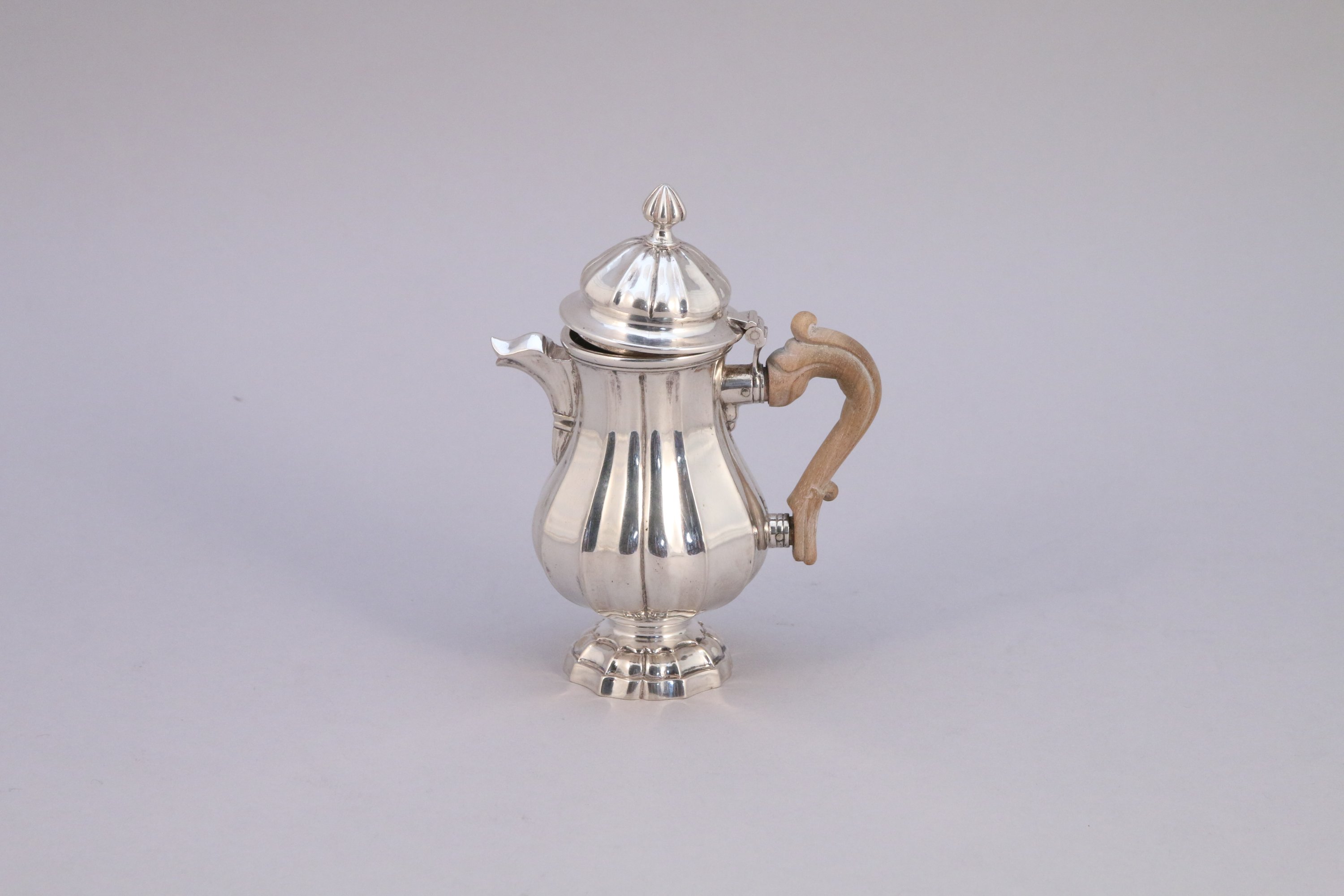 Petite CAFETIÈRE égoïste en argent de forme balustre à côtés pincés. Anse en bois.