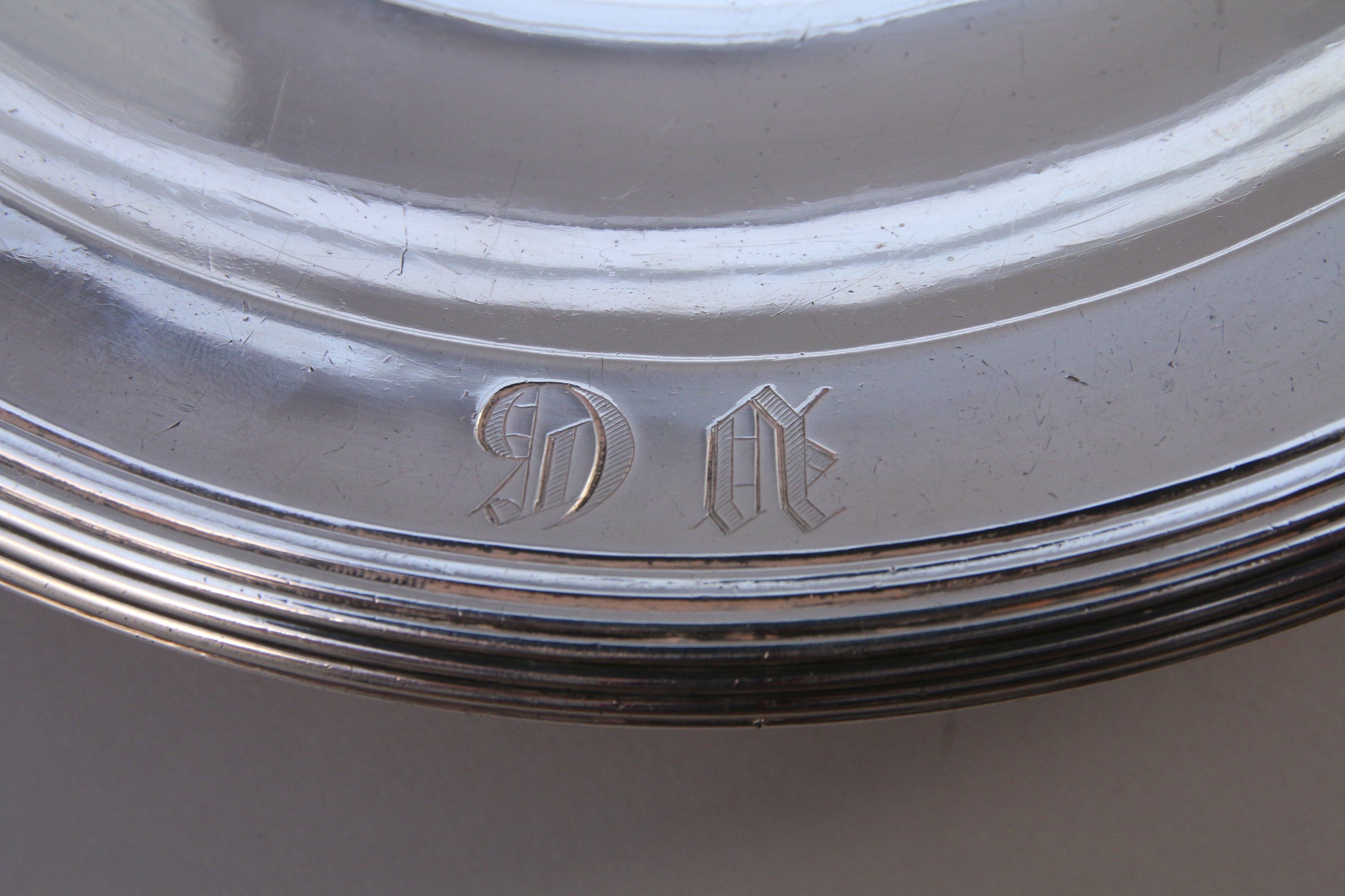 PLAT LÉGUMIER en argent de forme circulaire à décor de filets. Chiffré "DA?".