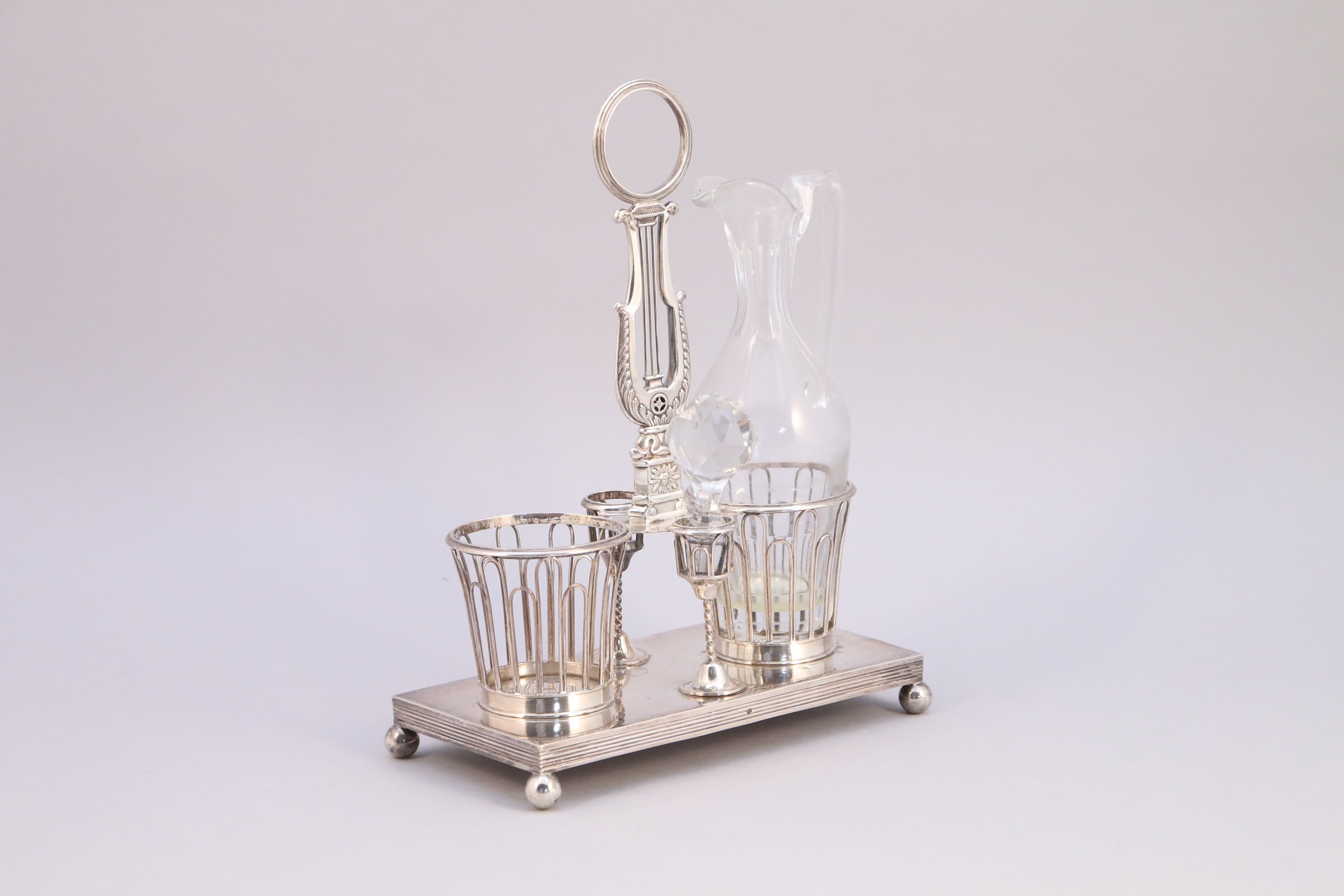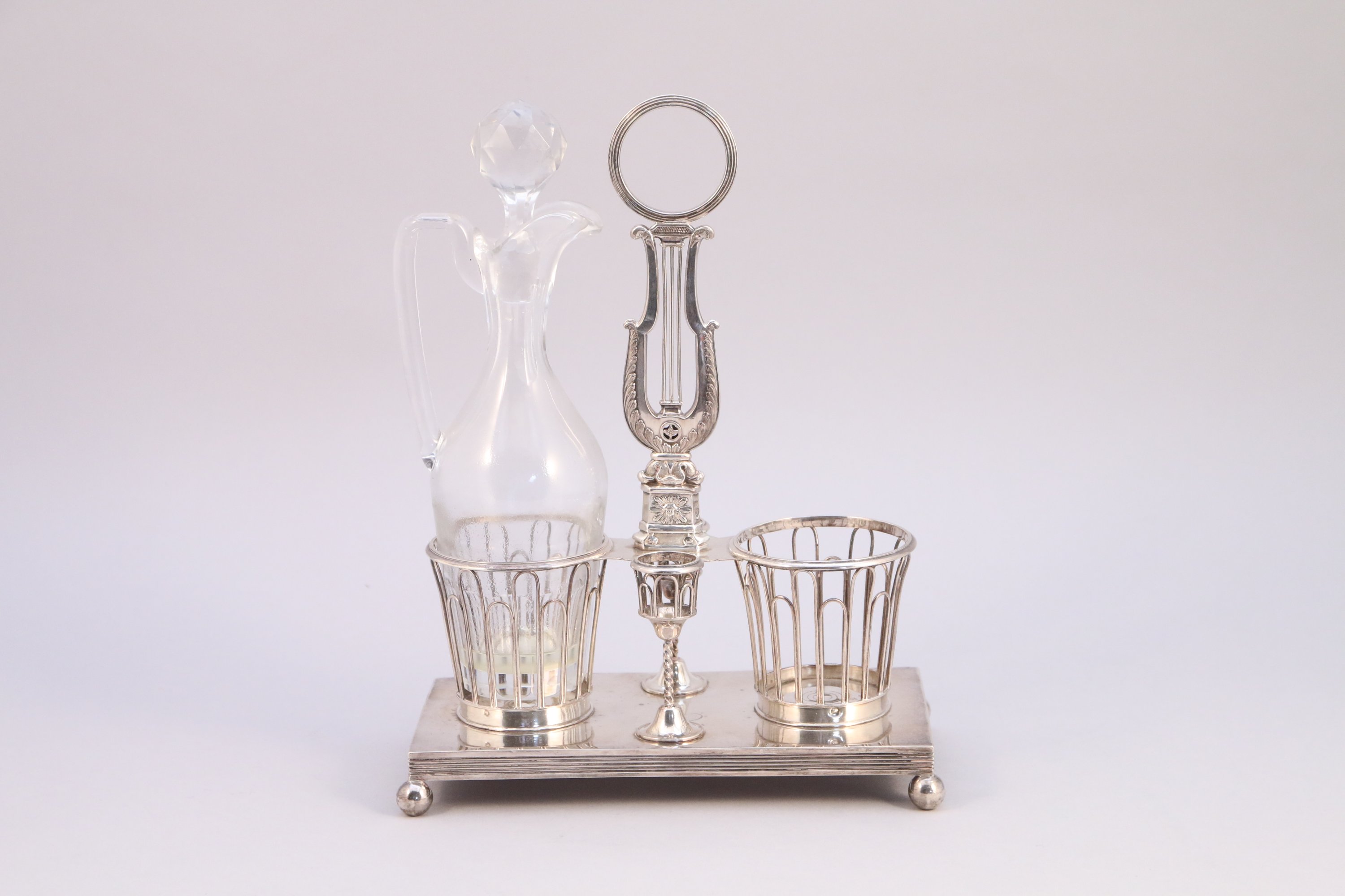 SUPPORT à HUILIER et VINAIGRIER en argent de forme lyre, la base rectangulaire reposant sur quatre pieds boule, la main de prise surmontée d'un anneau.
