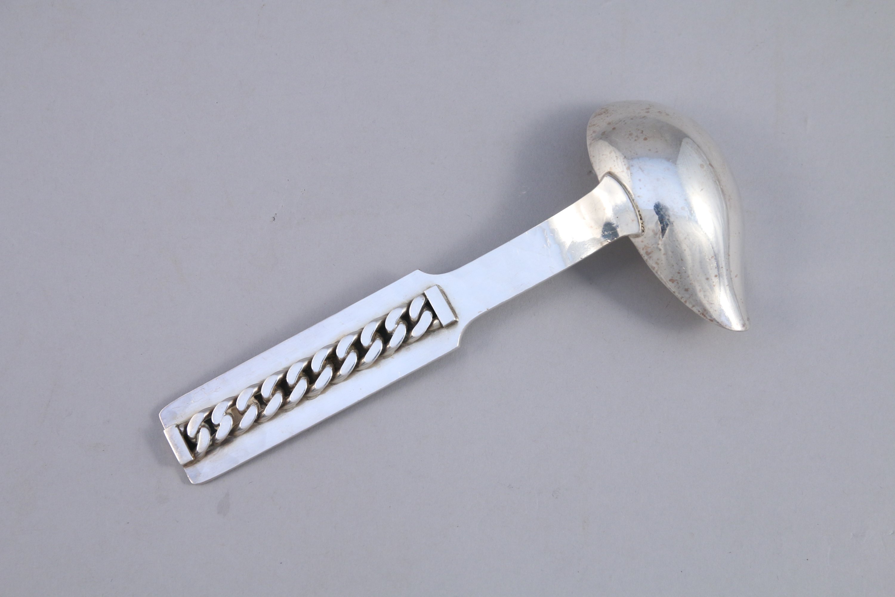 Cuiller à sauce en métal argenté partiellement martelé. Ornée d'une application de frise de gourmette. Signée "J DESPRÉS".