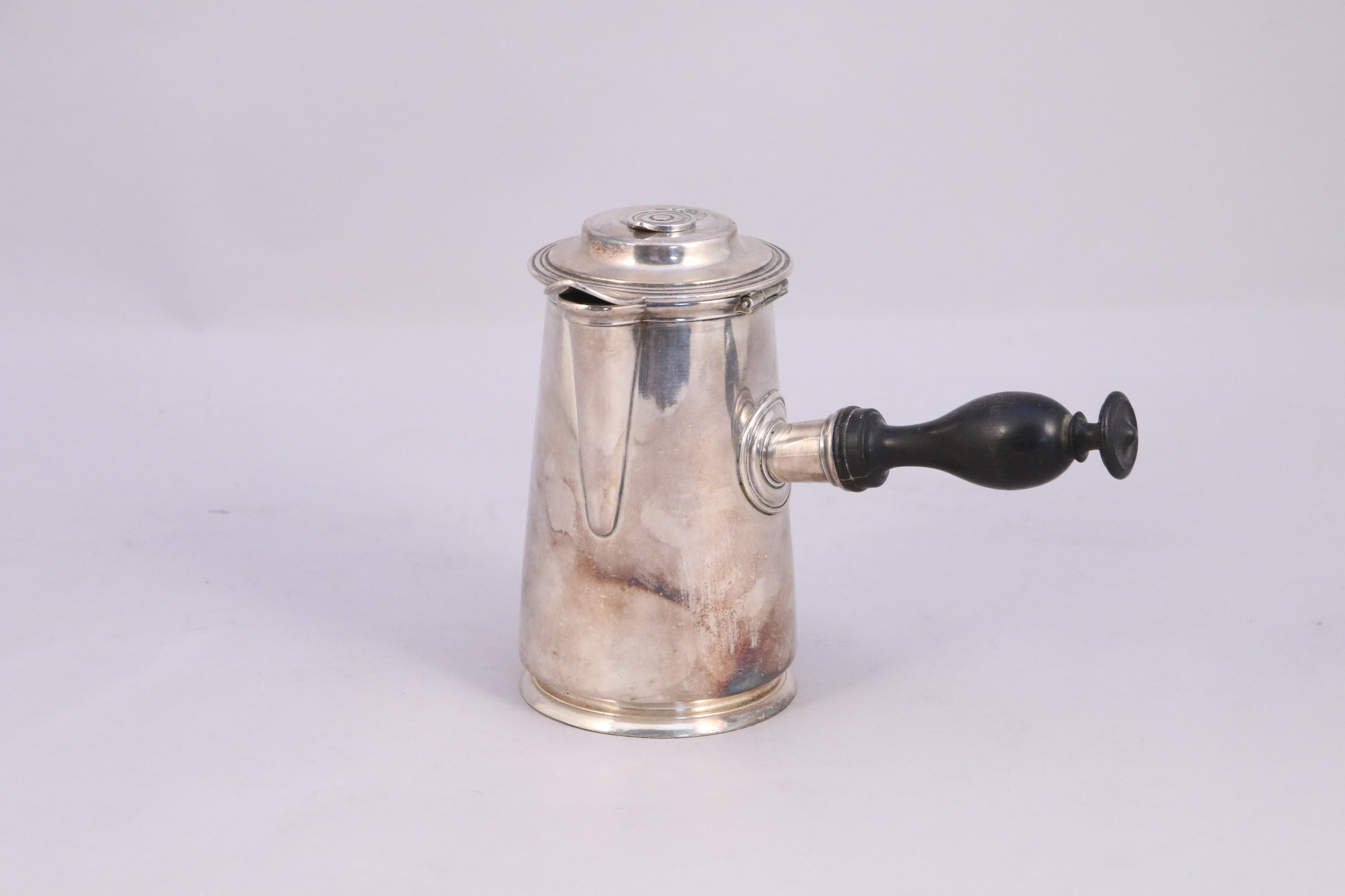 CHRISTOFLE. CHOCOLATIÈRE en métal argenté, de fome tronconique, manche latéral en bois tourné noir. panse gravée d'un monogramme "LV" surmonté d'une couronne de comtale.