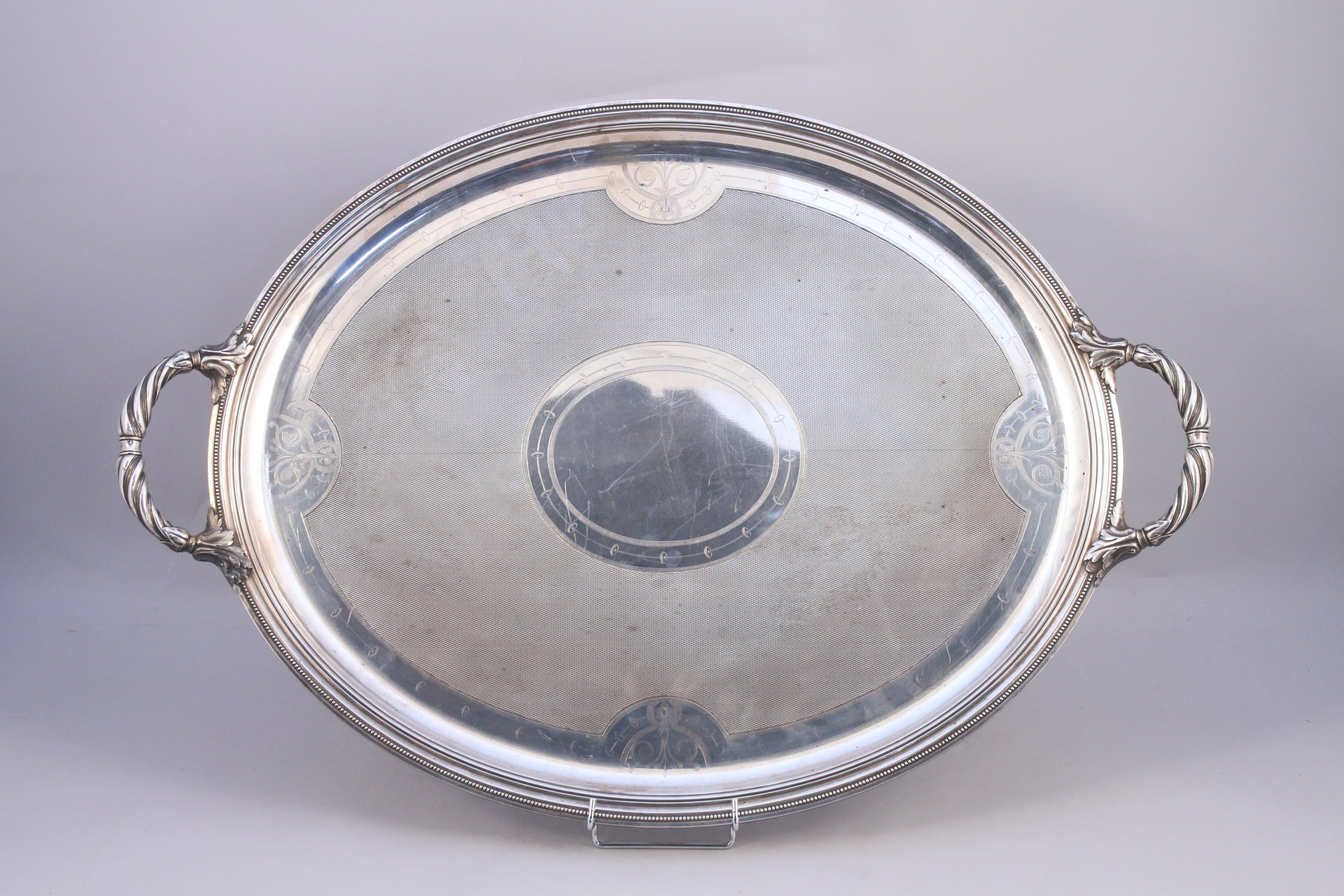 CHRISTOFLE. GRAND PLATEAU ovale en métal argenté, les anses torses feuillagées, le fond guilloché encadré de fleurettes à enroulements et au centre d'un médaillon ovale, le bord souligné de perles.