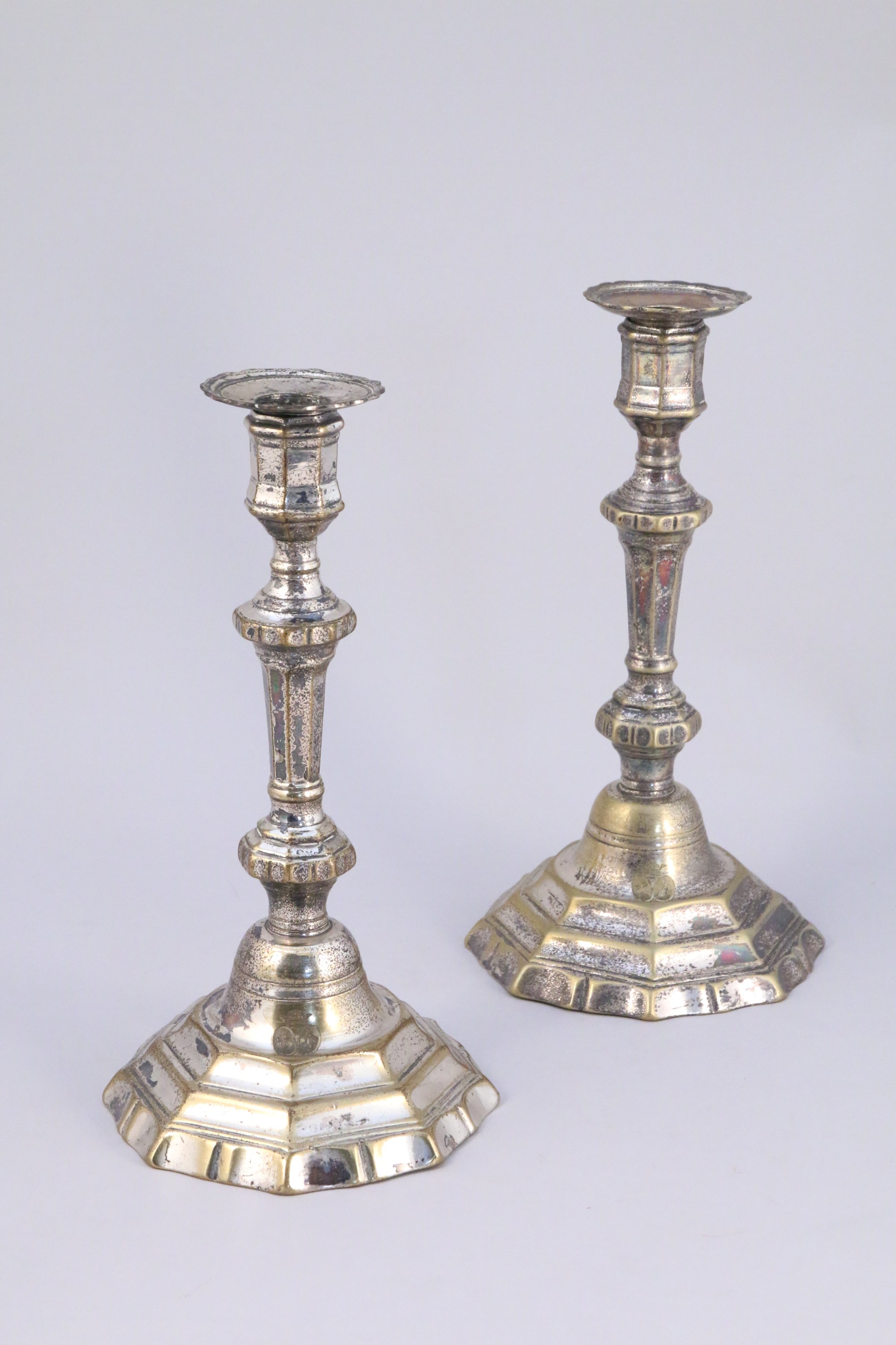 PAIRE de FLAMBEAUX en métal argenté reposant sur une base à contours, le fût à pans et moulures supportant un binet. La base gravée d'armoiries d'alliances surmontées d'une couronne de marquis. Bobèches.