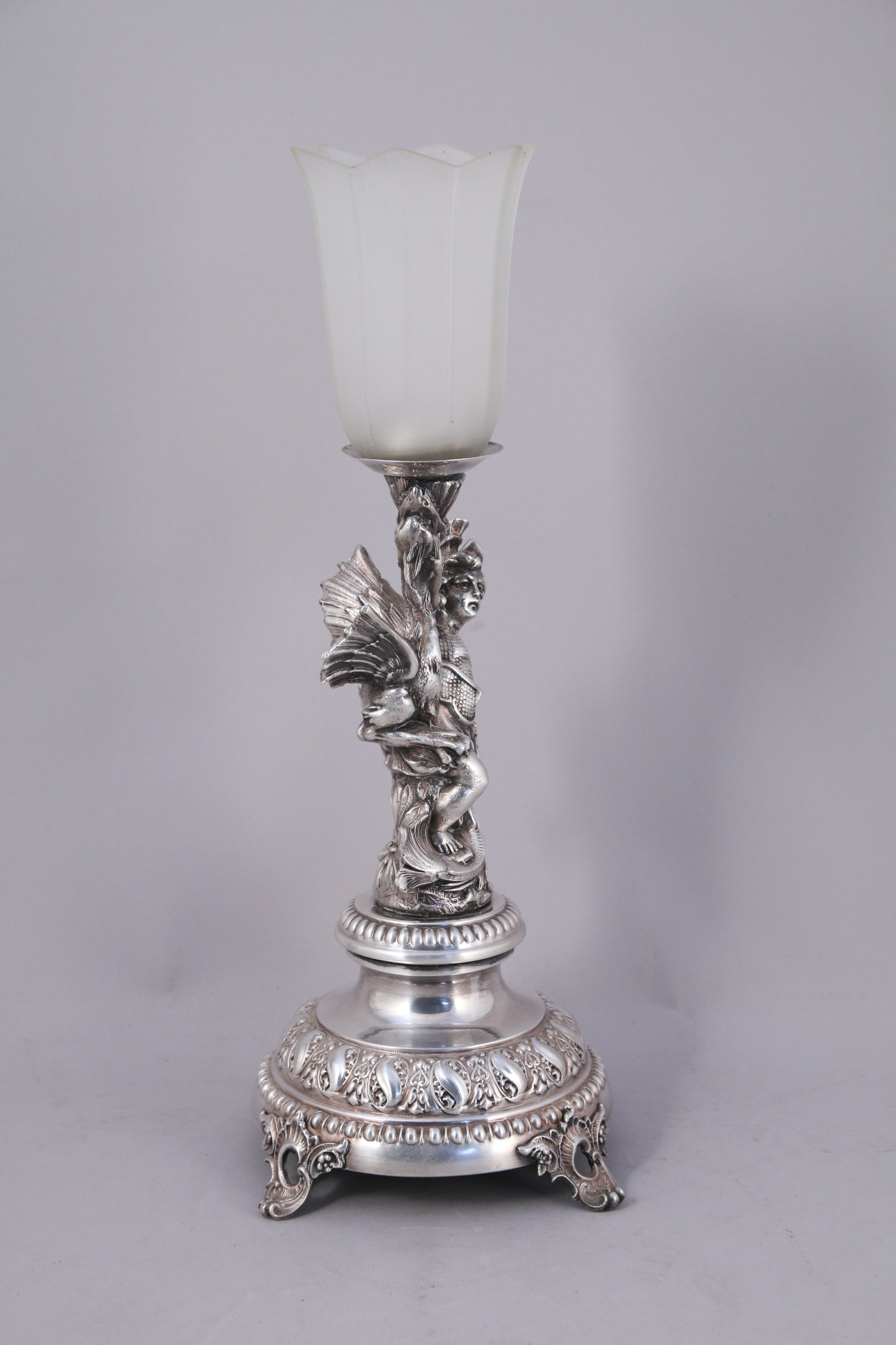 SUEDE. SURTOUT en métal argenté figurant un guerrier combatant une chimère en rond de bosse, surmonté d'une tulipe en verre. Reposant sur une base quadripoe à doucine à décor repoussé de godrons et d'un frise de raie de coeur s'alternant avec un motif de flamme.