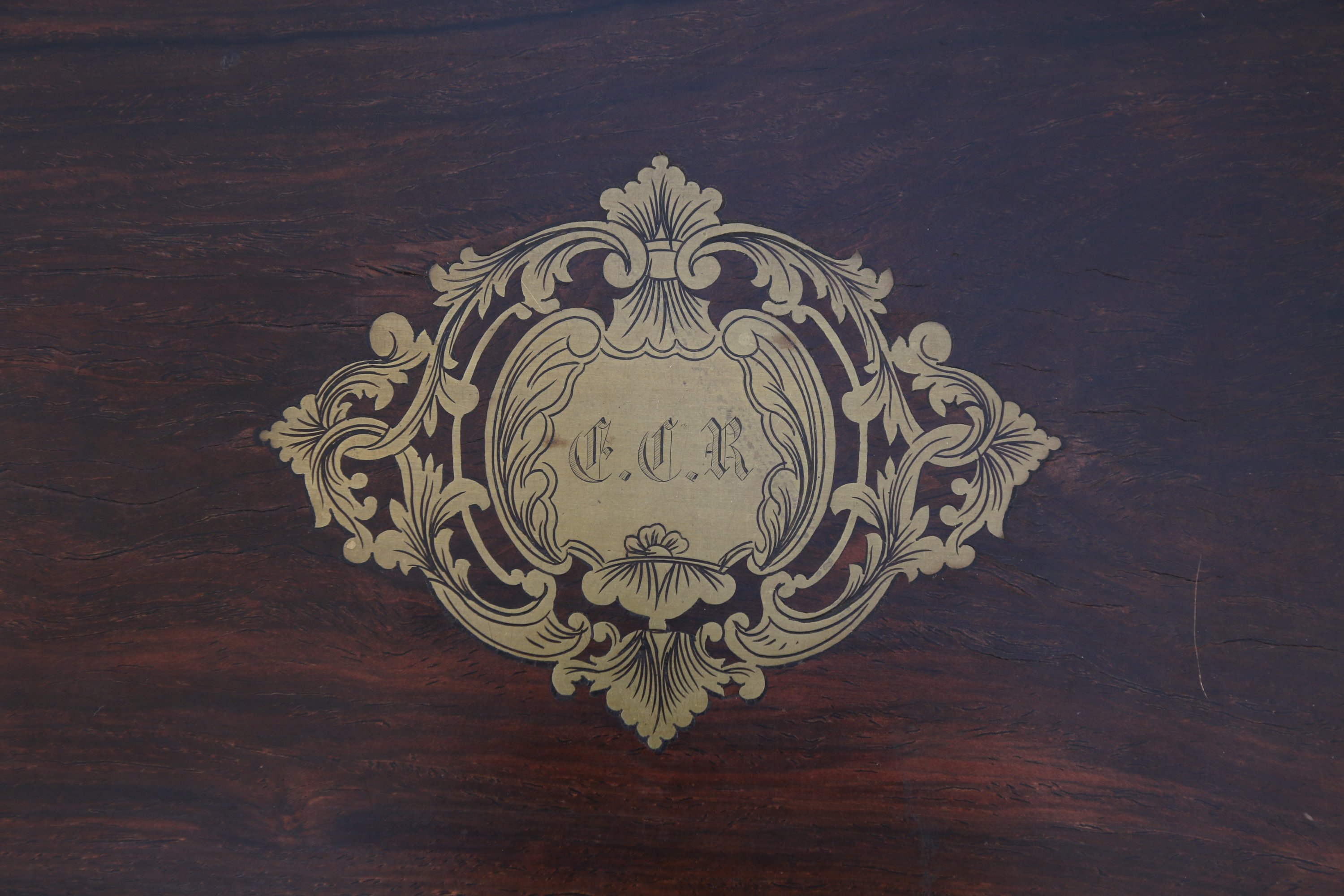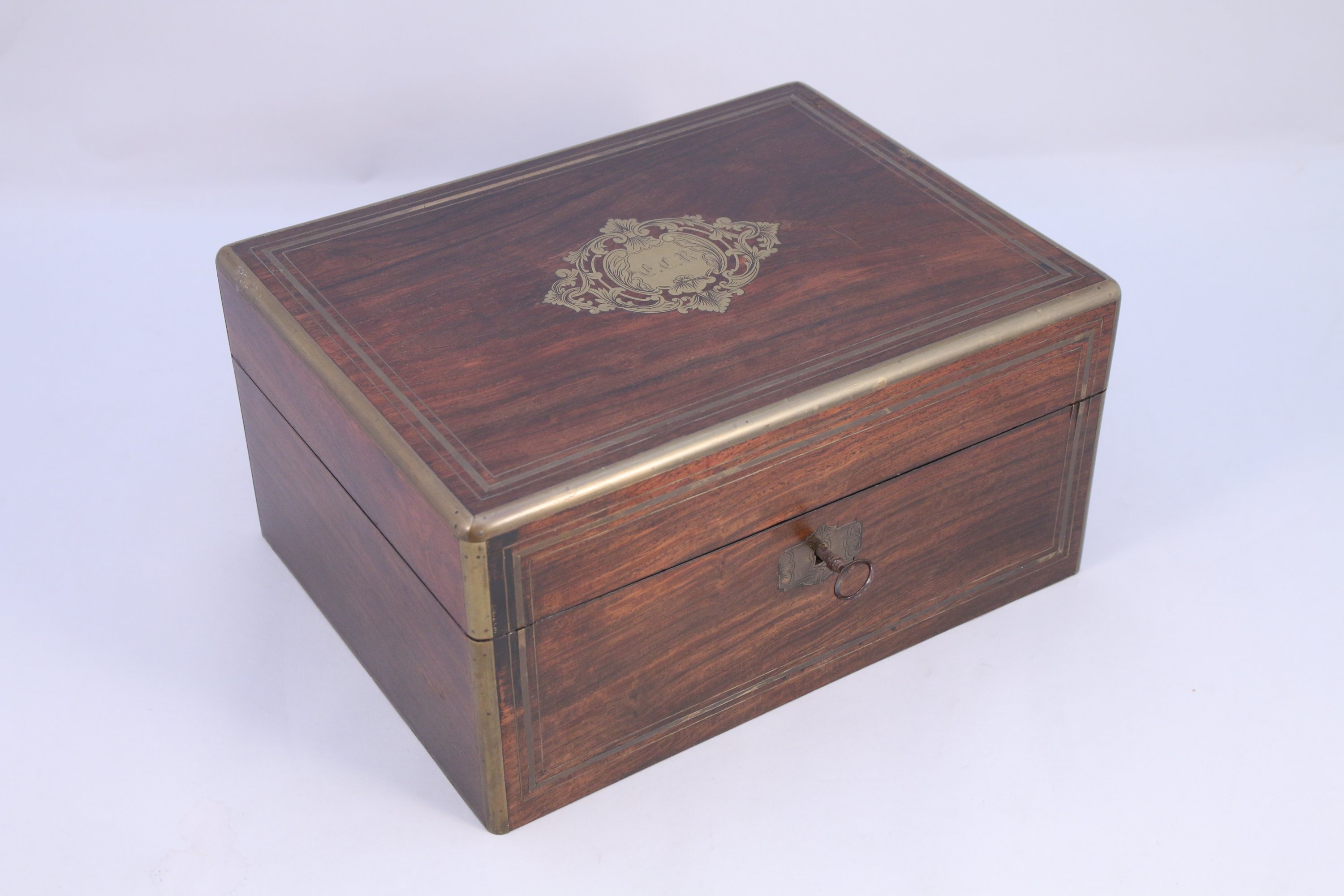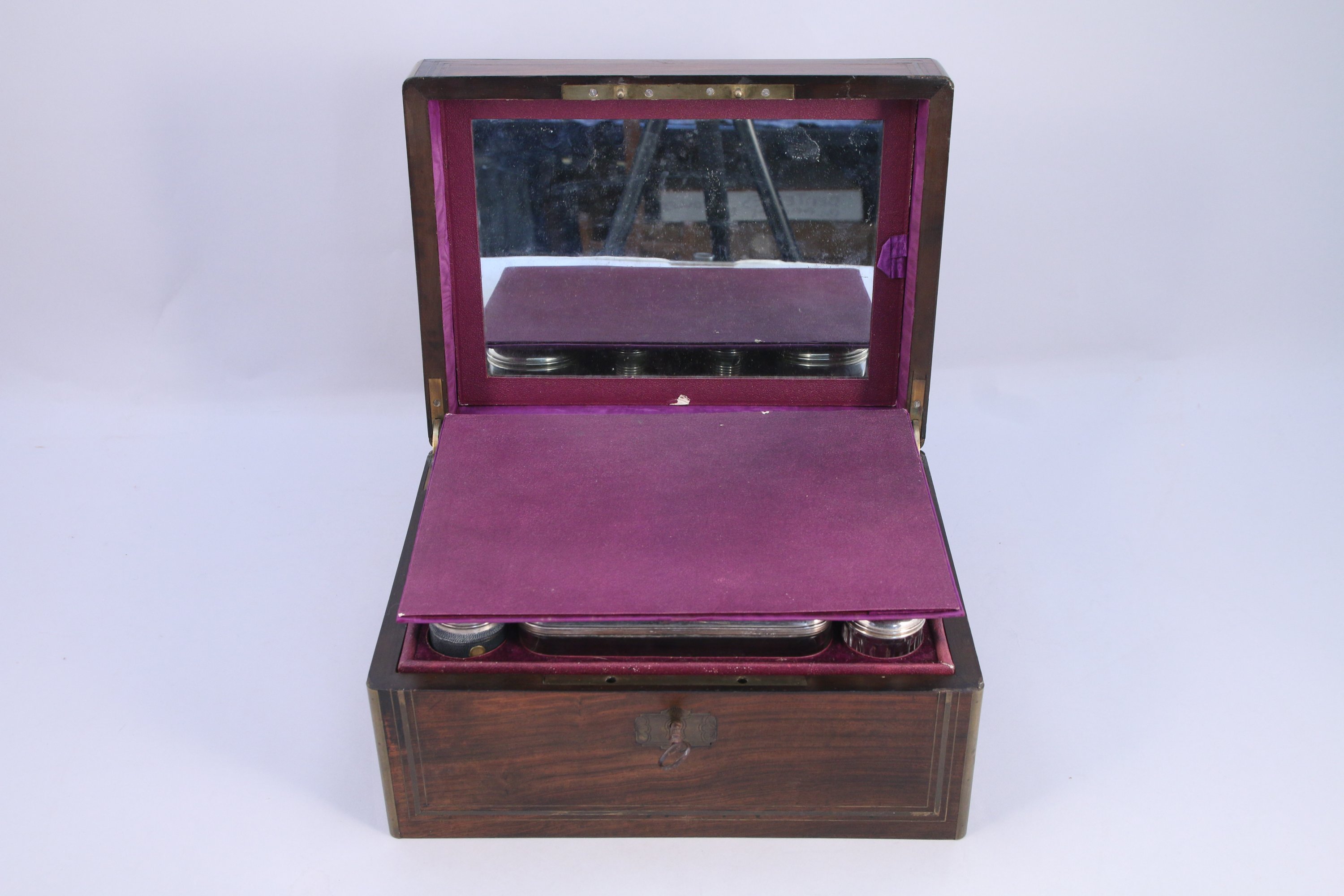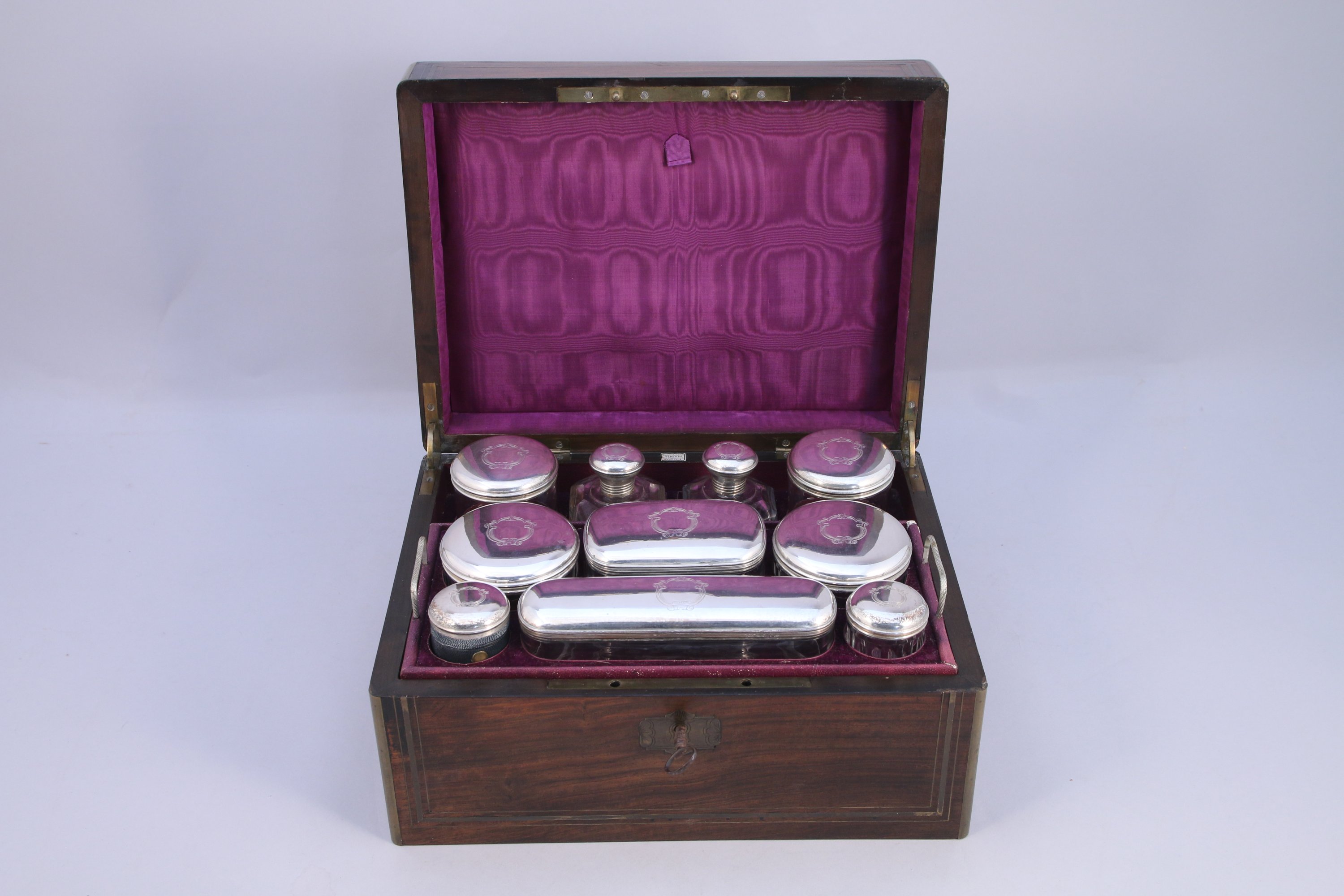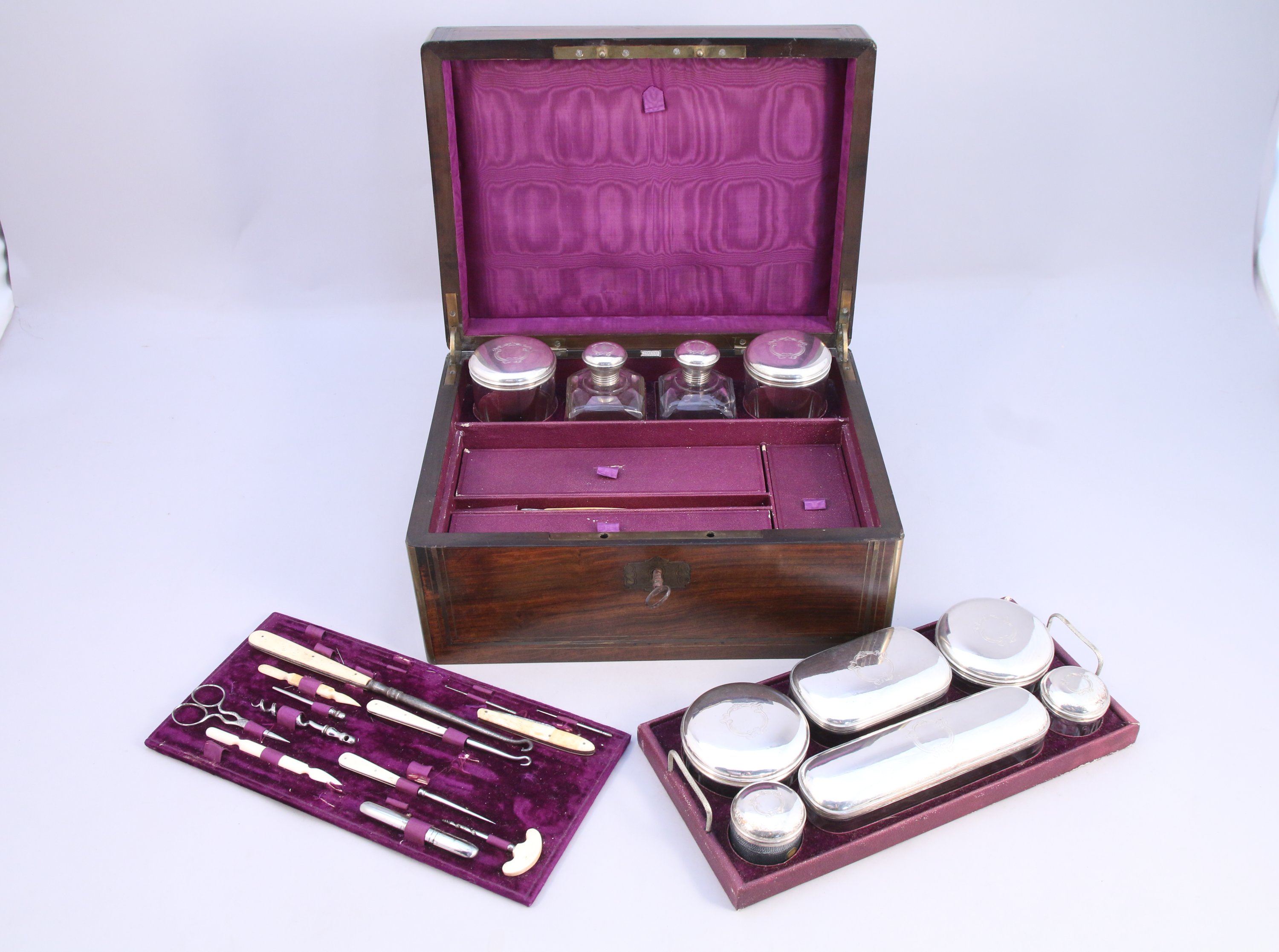 VENE & CIE. COFFRET dit NÉCESSAIRE DE VOYAGE en placage de palissandre, portant trois initiales dans un cartouche. L'intérieur garni de velours violet. Divers compartiments dévoilent un nécessaire de toilette avec des flacons en cristal les bouchons en métal argenté, un nécessaire de rassage, des brosses, divers instruments en métal et os.