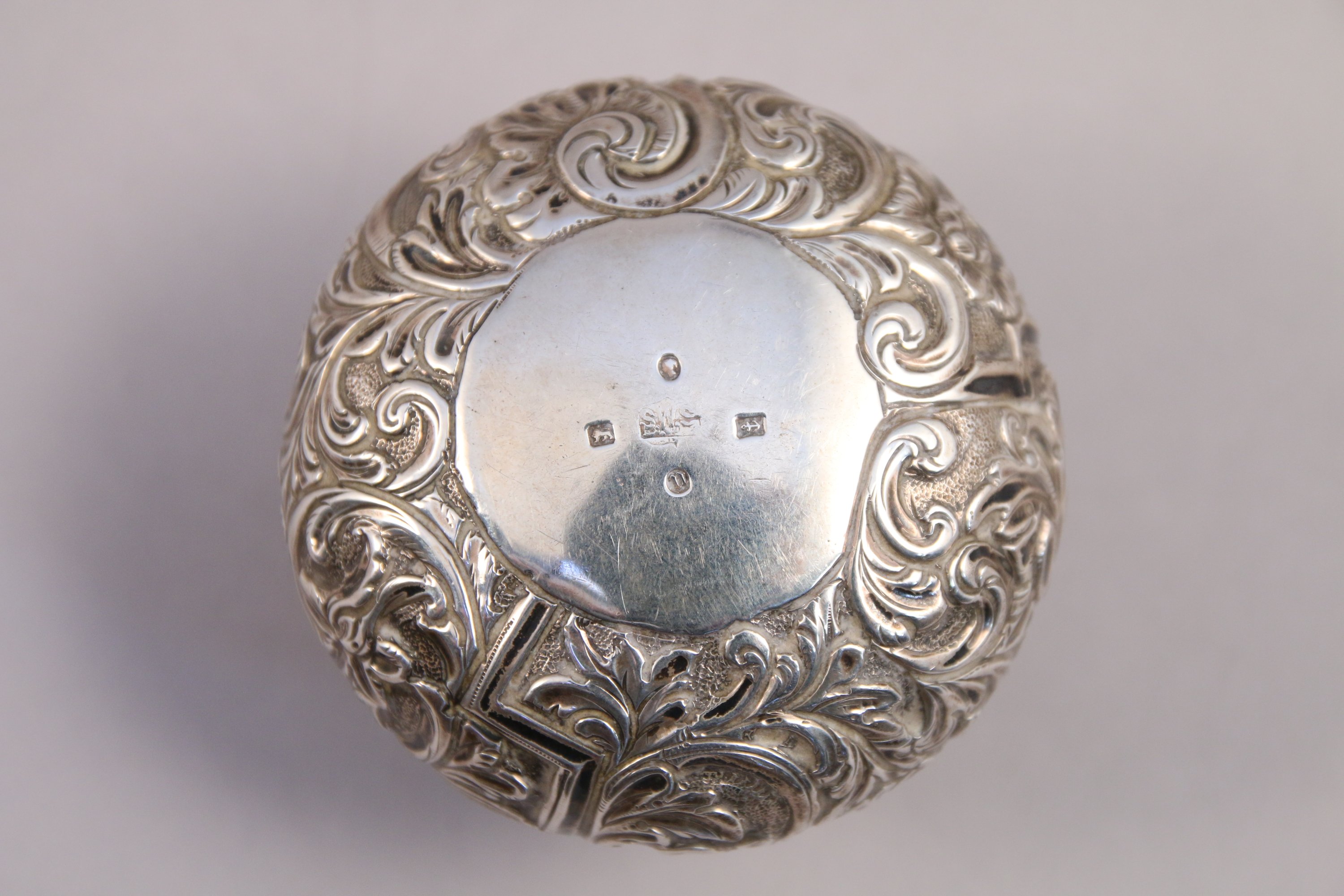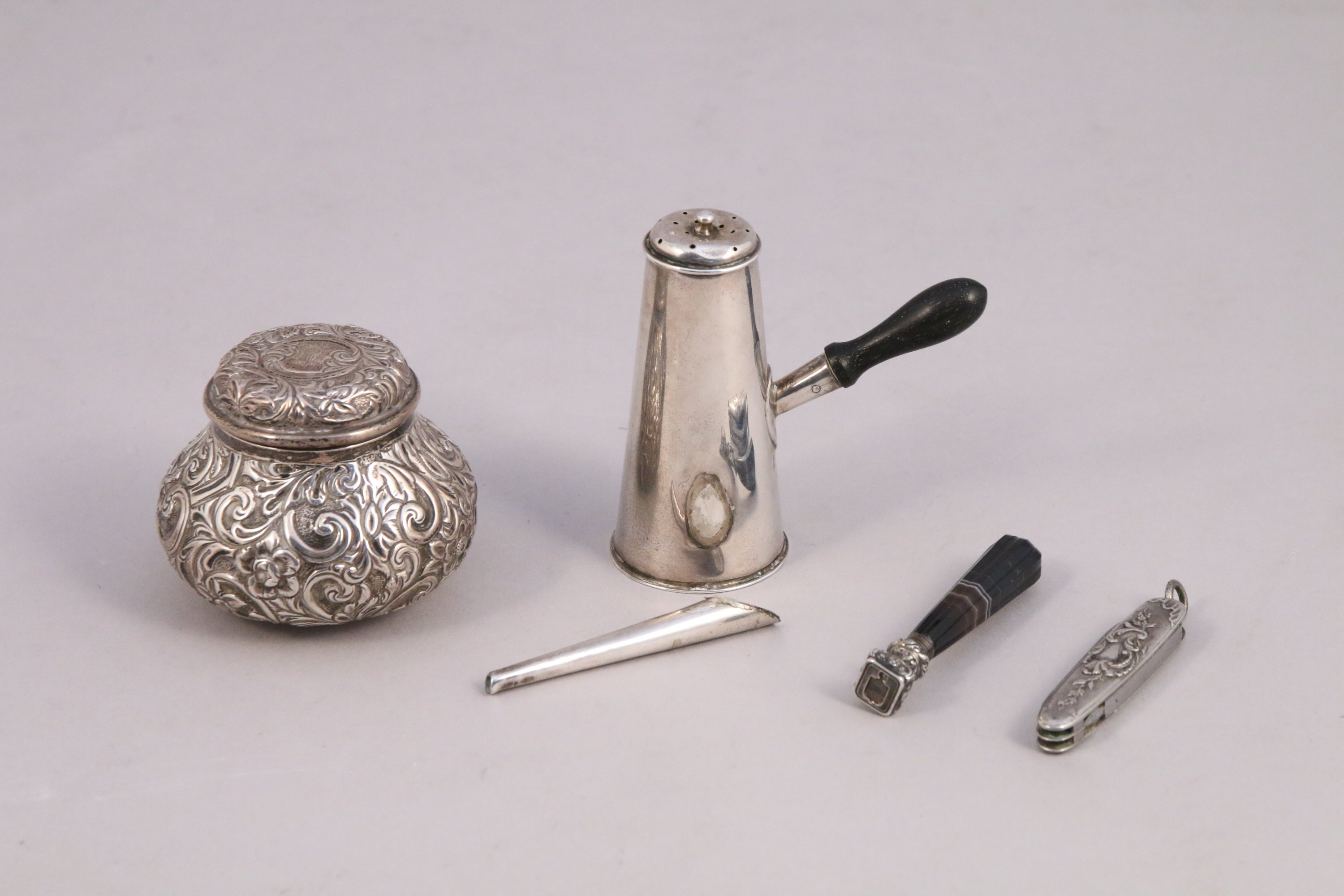 OBJETS de VITRINE en argent comprenant: une BOÎTE COUVERTE à fard gravé de motifs végétaux travail anglais, une mini VERSEUSE le manche en bois noirci travail anglais (accidenté), un COUTEAU SUISSE en argent et métal, un CACHET à CIRE le manche en agate.