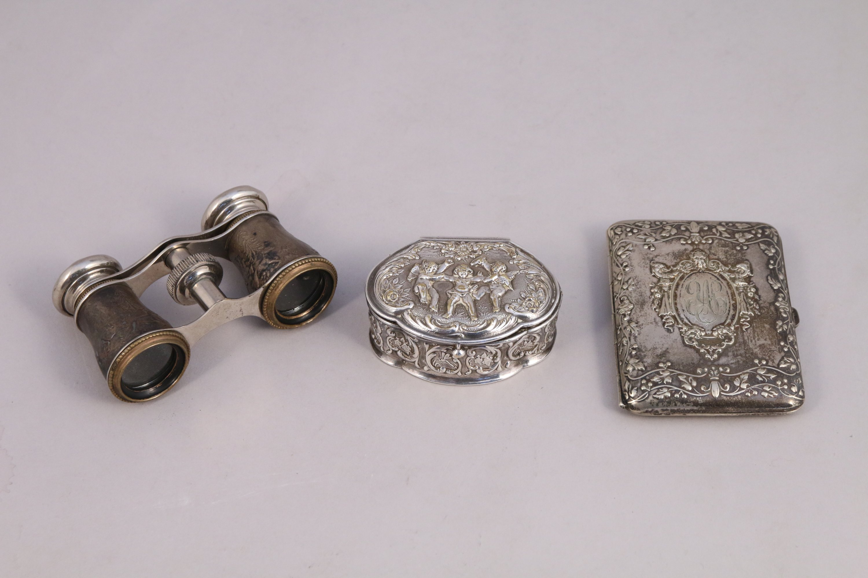 JOINT: Lot de métal argenté dont étui à cigarettes, petite boîte et paire de jumelles de théâtre.