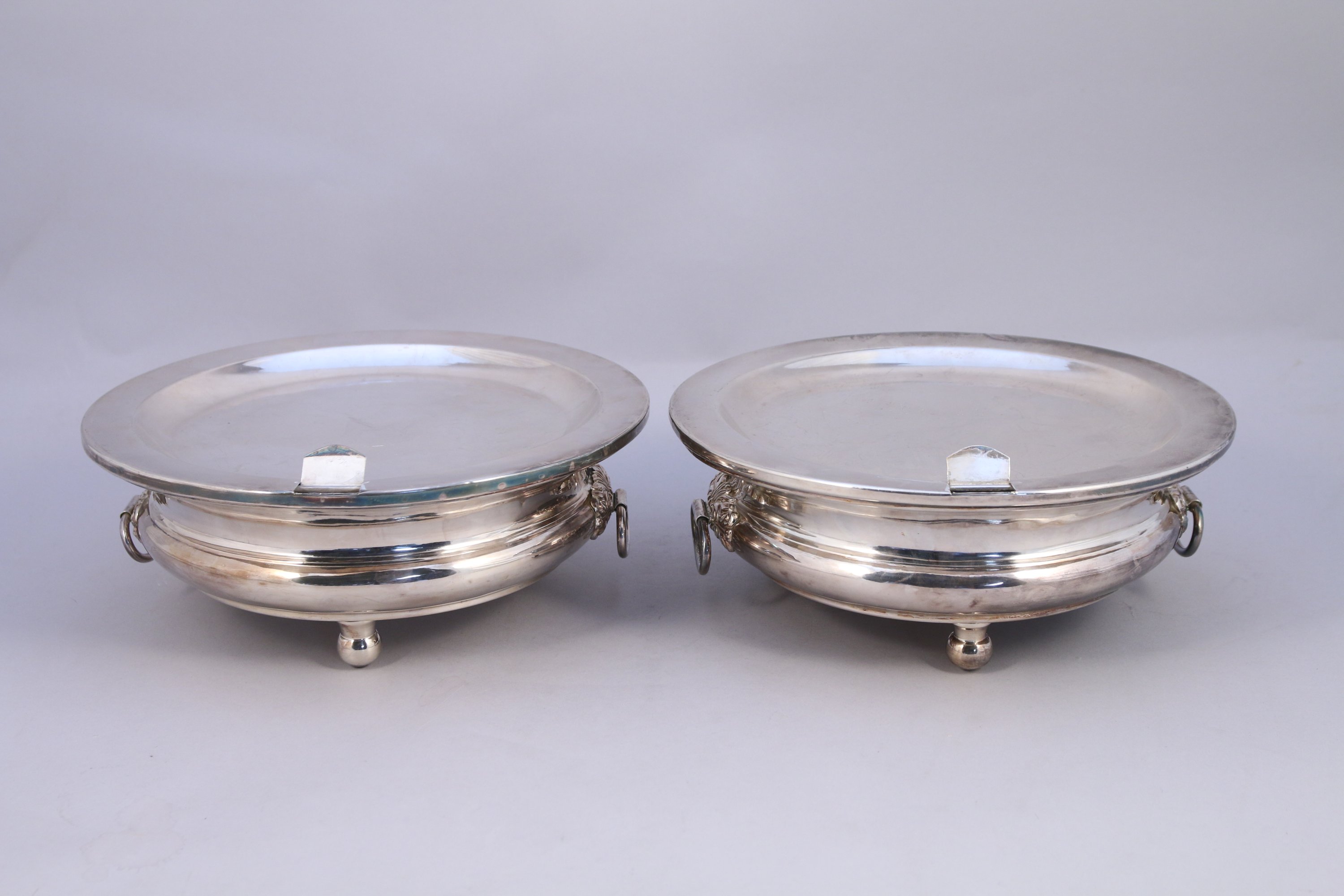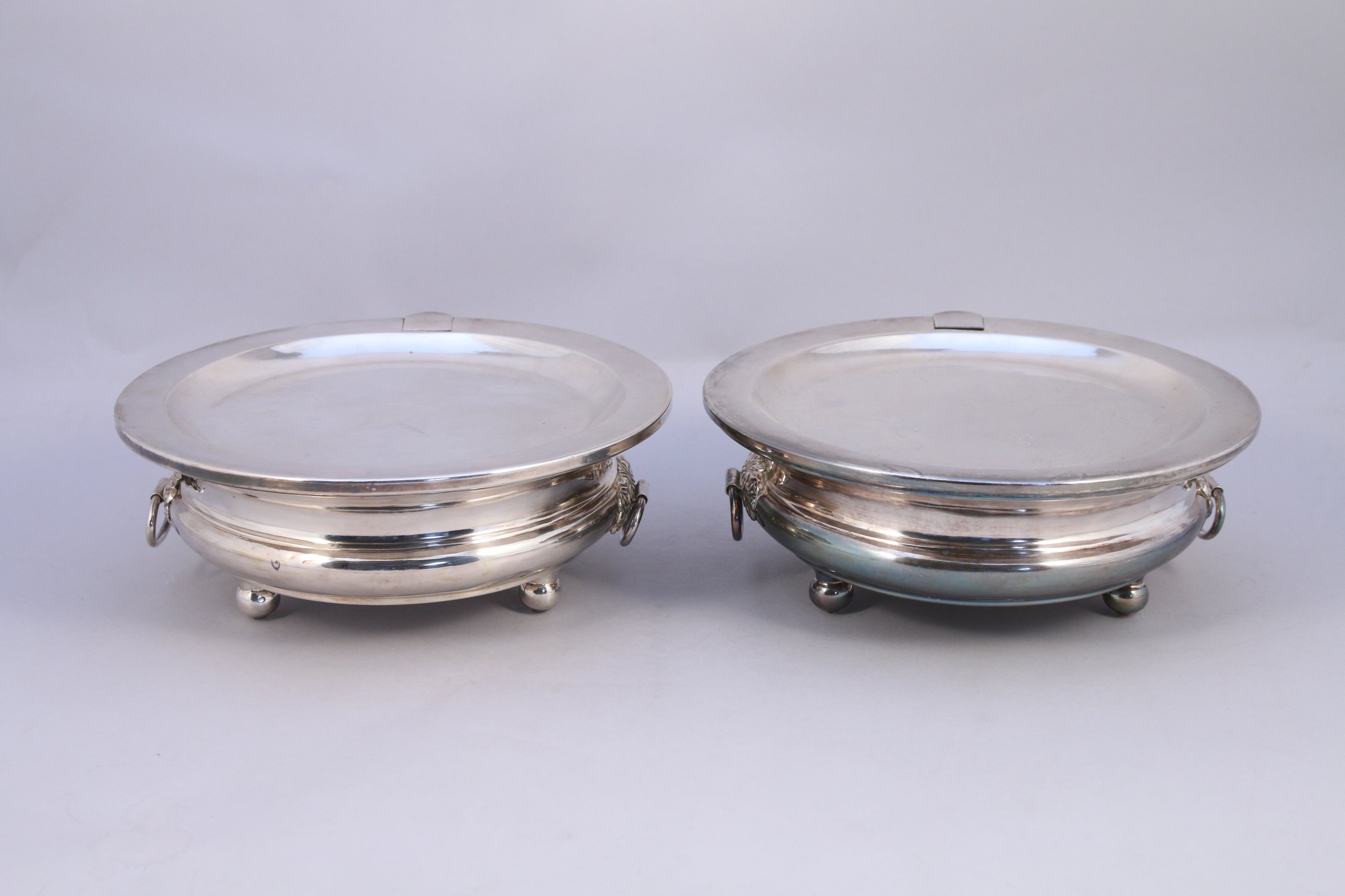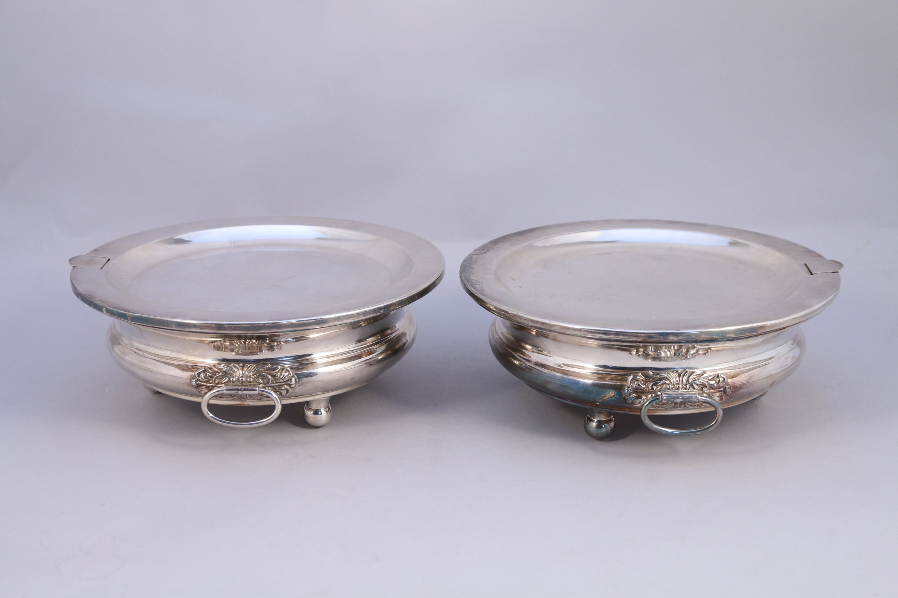 PAIRE de CHAUFFE-PLATS en métal argenté, de forme circulaire et renflé reposant sur trois pieds. Anses latérales à appliques feuillagées et anneaux mobiles.