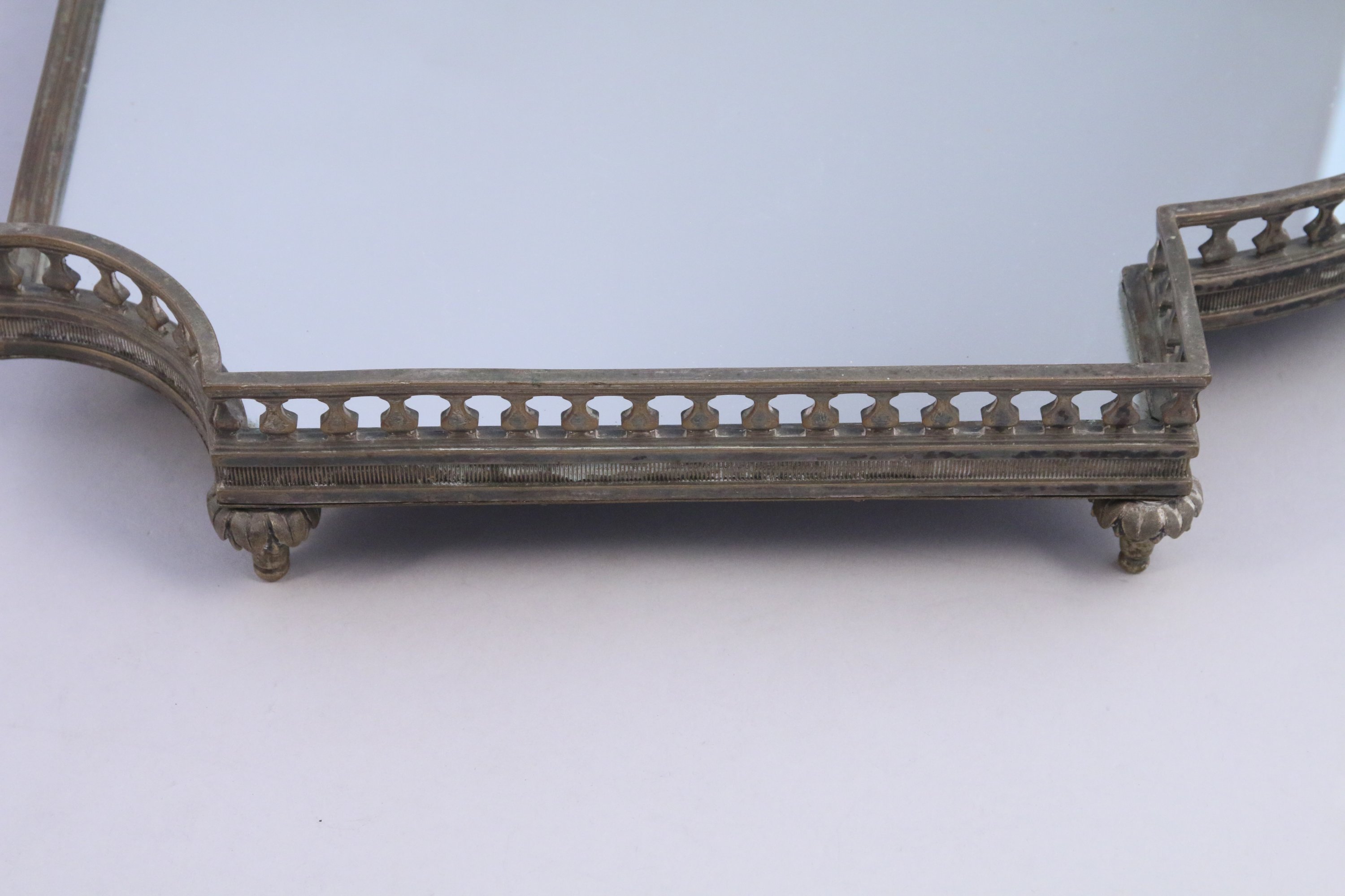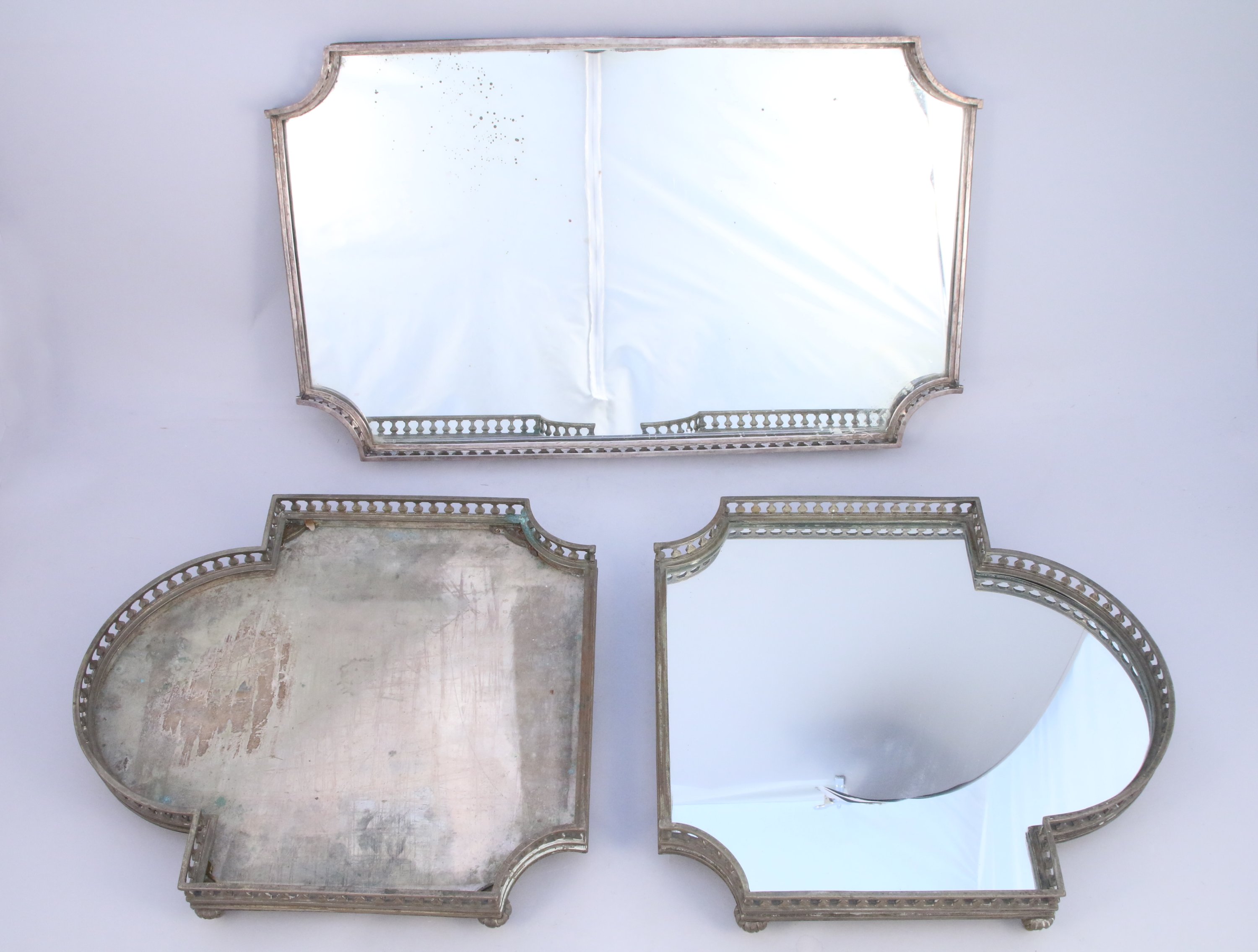 Important SURTOUT de TABLE en trois parties en métal argenté et fond de miroir. Galerie ajourée au pourtour de colonnes balustres. Piétement en toupies feuillagées.