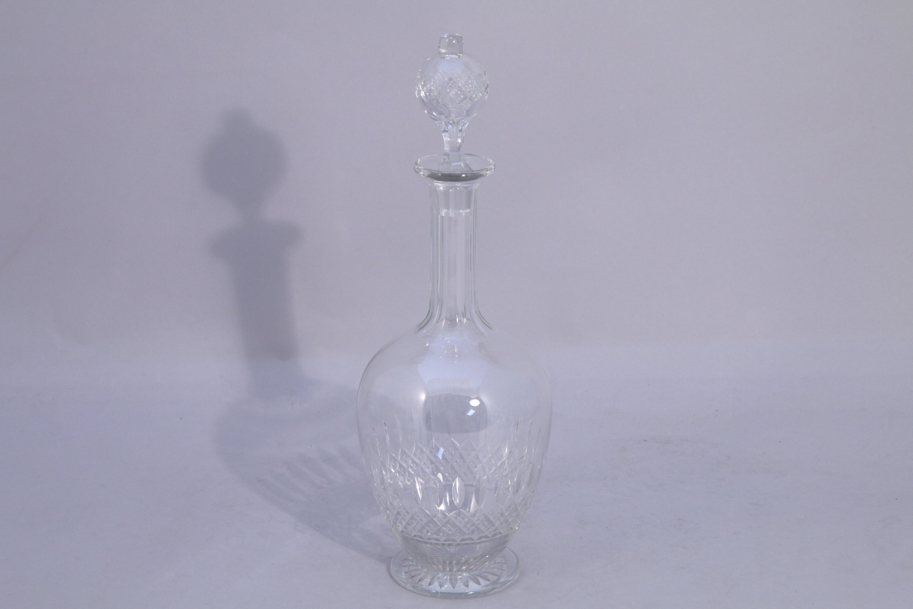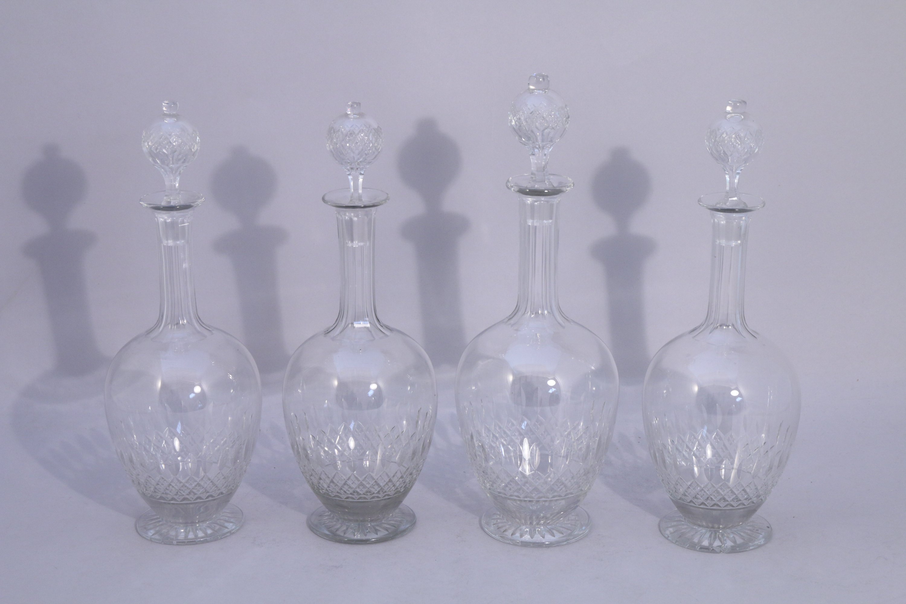 SUITE de quatre CARAFES en cristal de forme renflée au long col à décor gravé piédouché à décor rayonnant, bouchons gravés de forme sphérique.