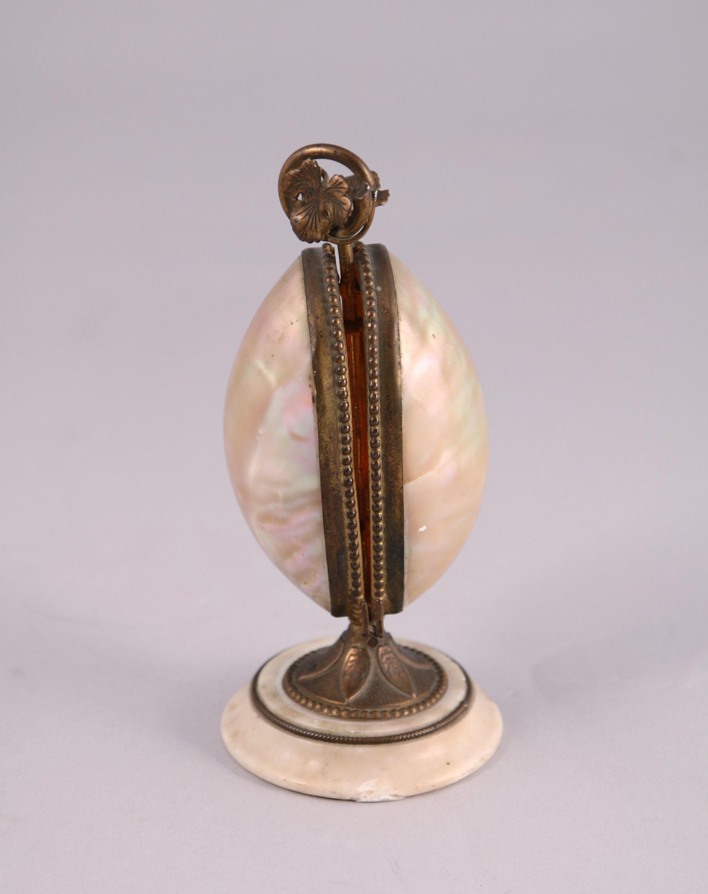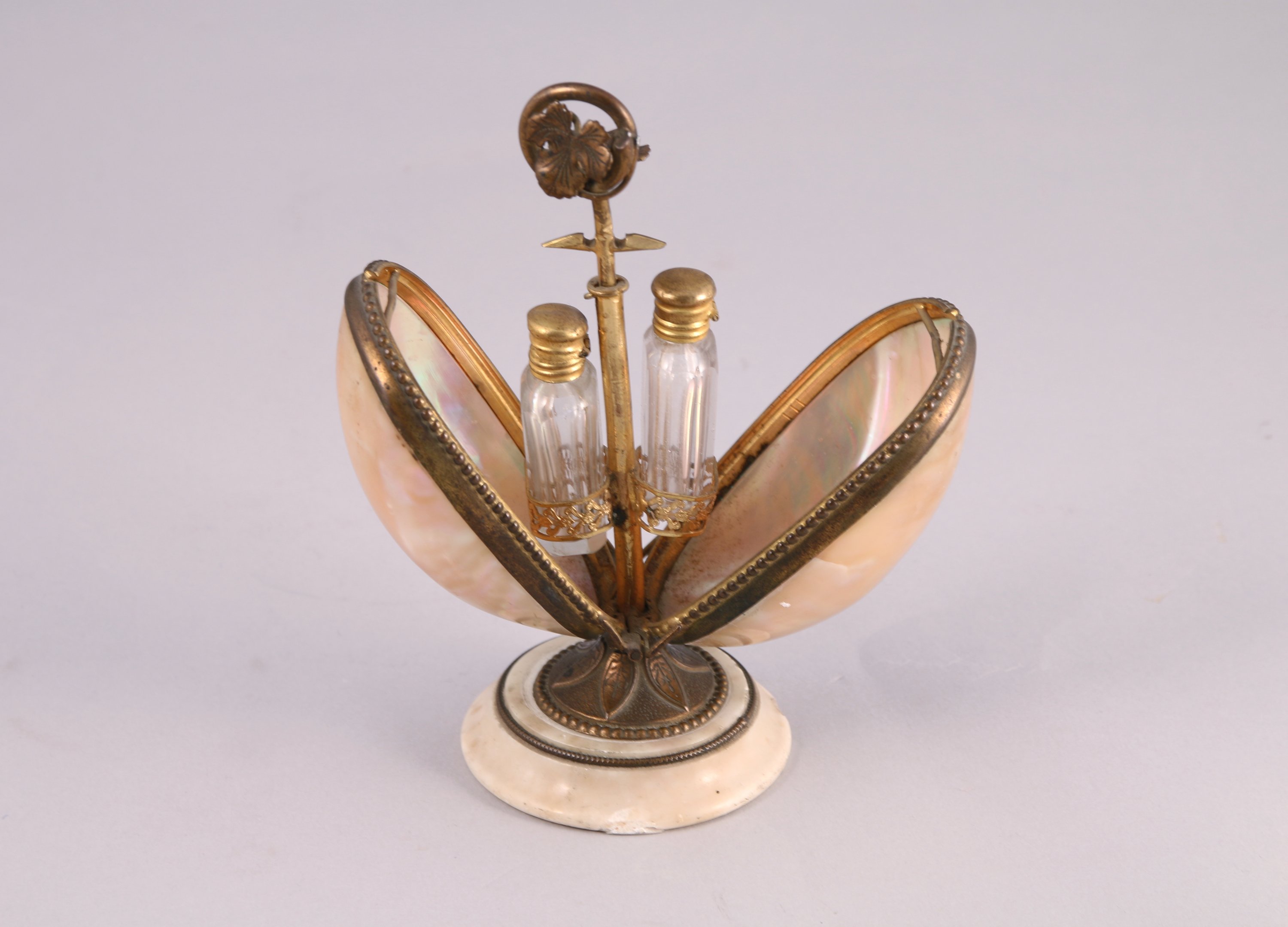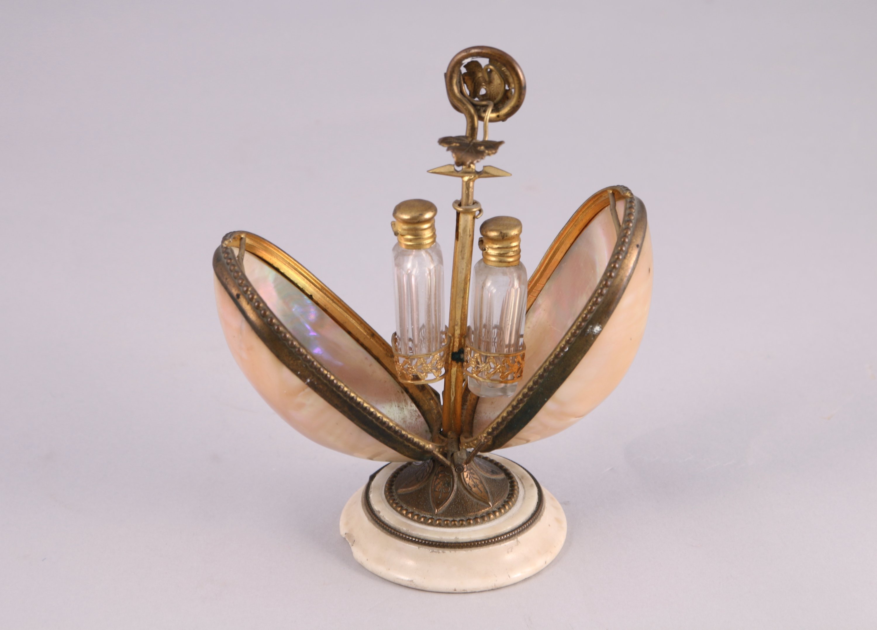 FLACON à parfum en cristal et bouchon doré, dans une monture ovoïde à deux coupelles en nacre. Monture sur piédouche en laiton reposant sur une base circulaire en marbre blanc.