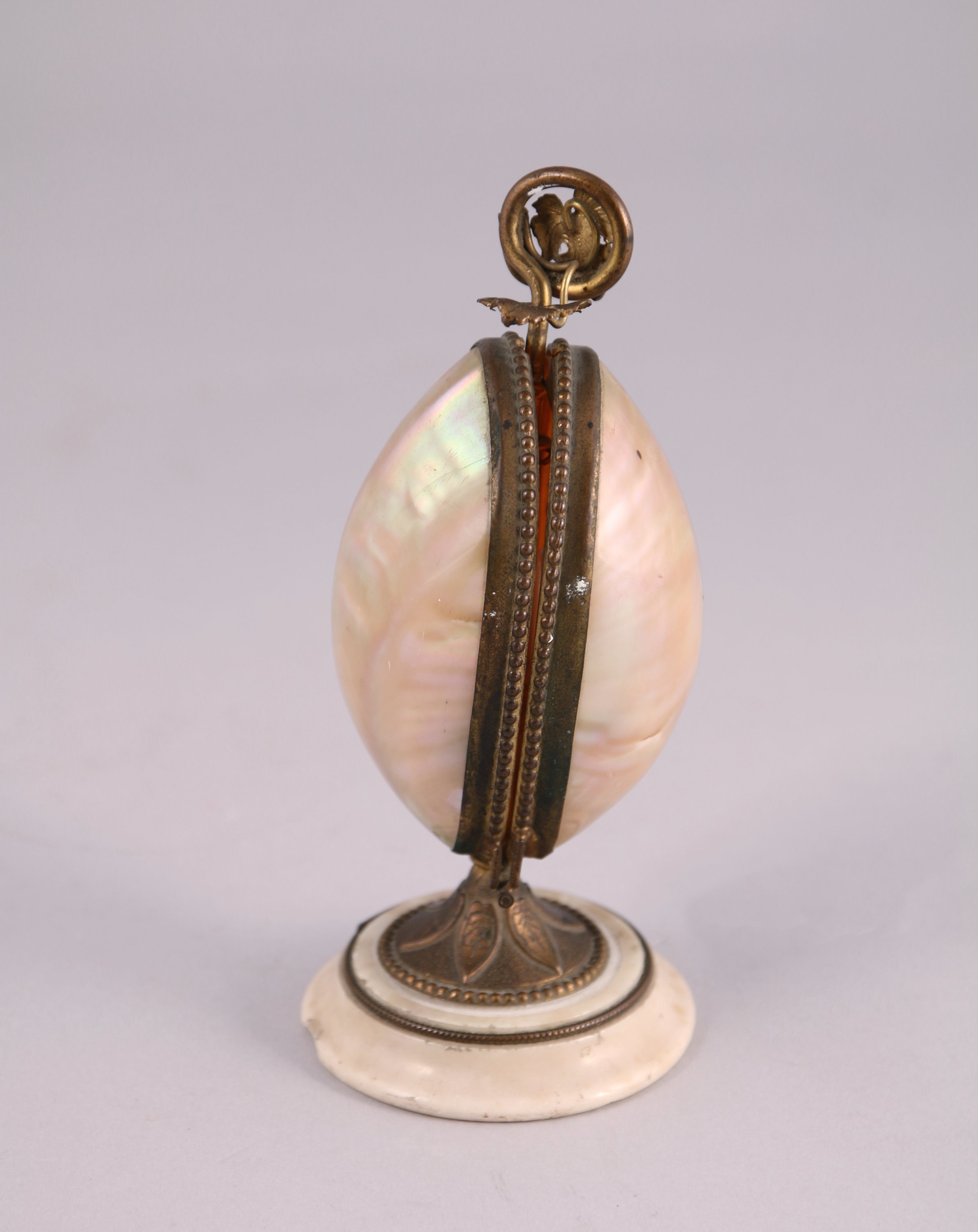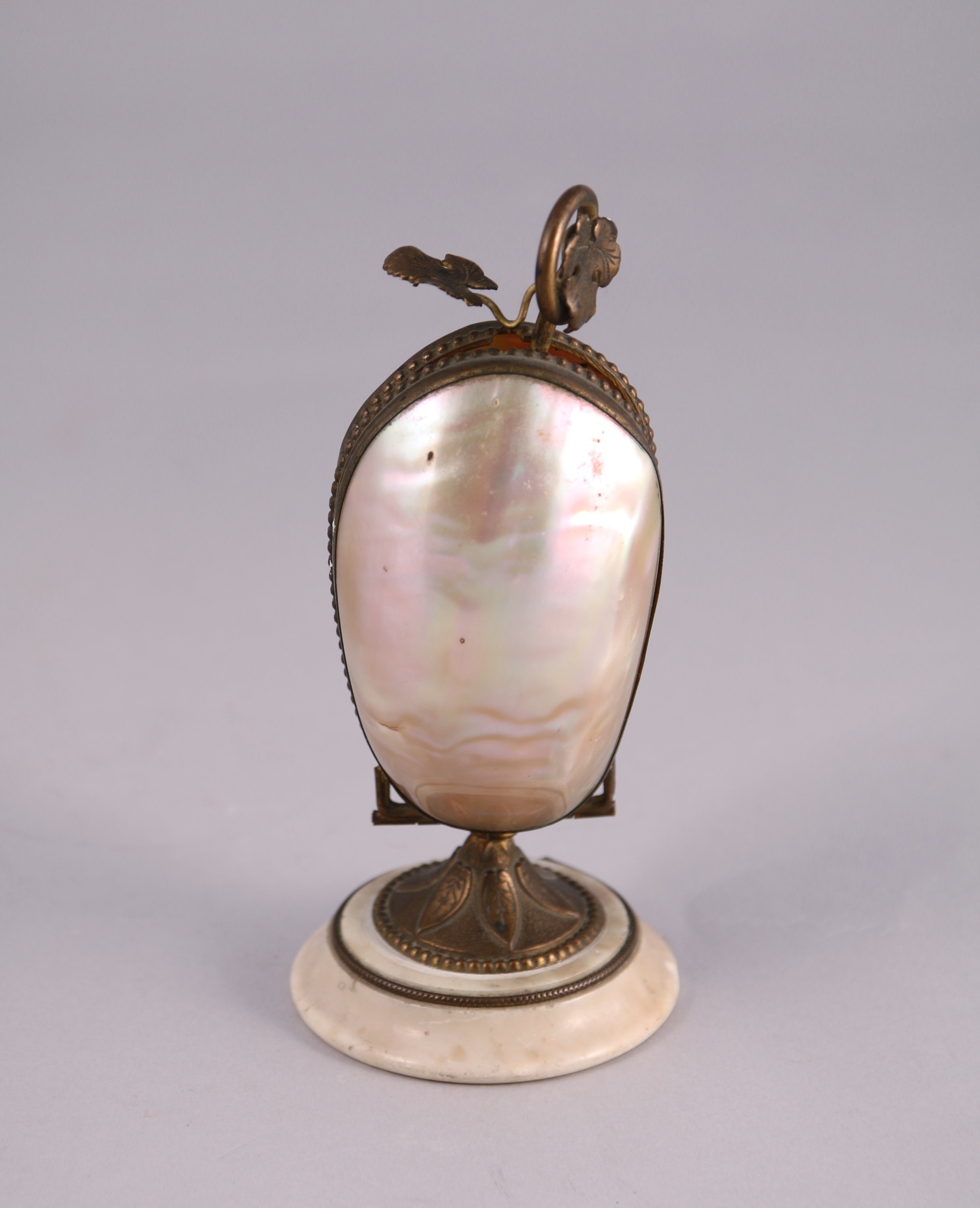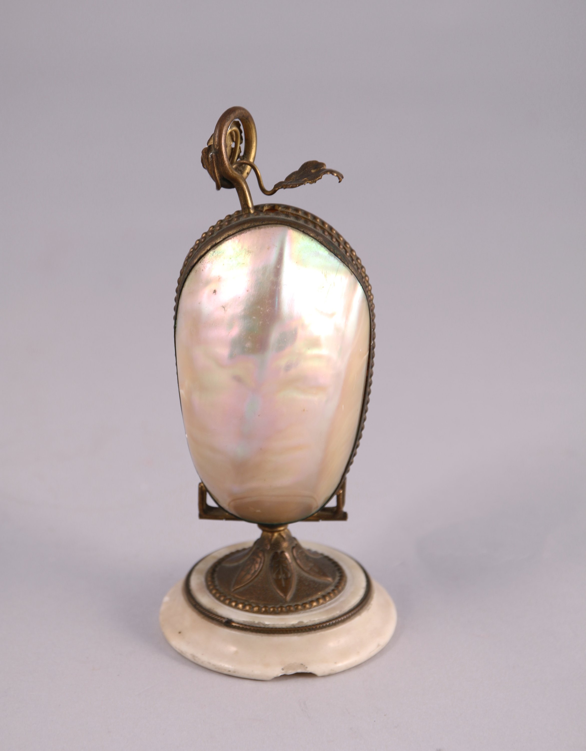 FLACON à parfum en cristal et bouchon doré, dans une monture ovoïde à deux coupelles en nacre. Monture sur piédouche en laiton reposant sur une base circulaire en marbre blanc.