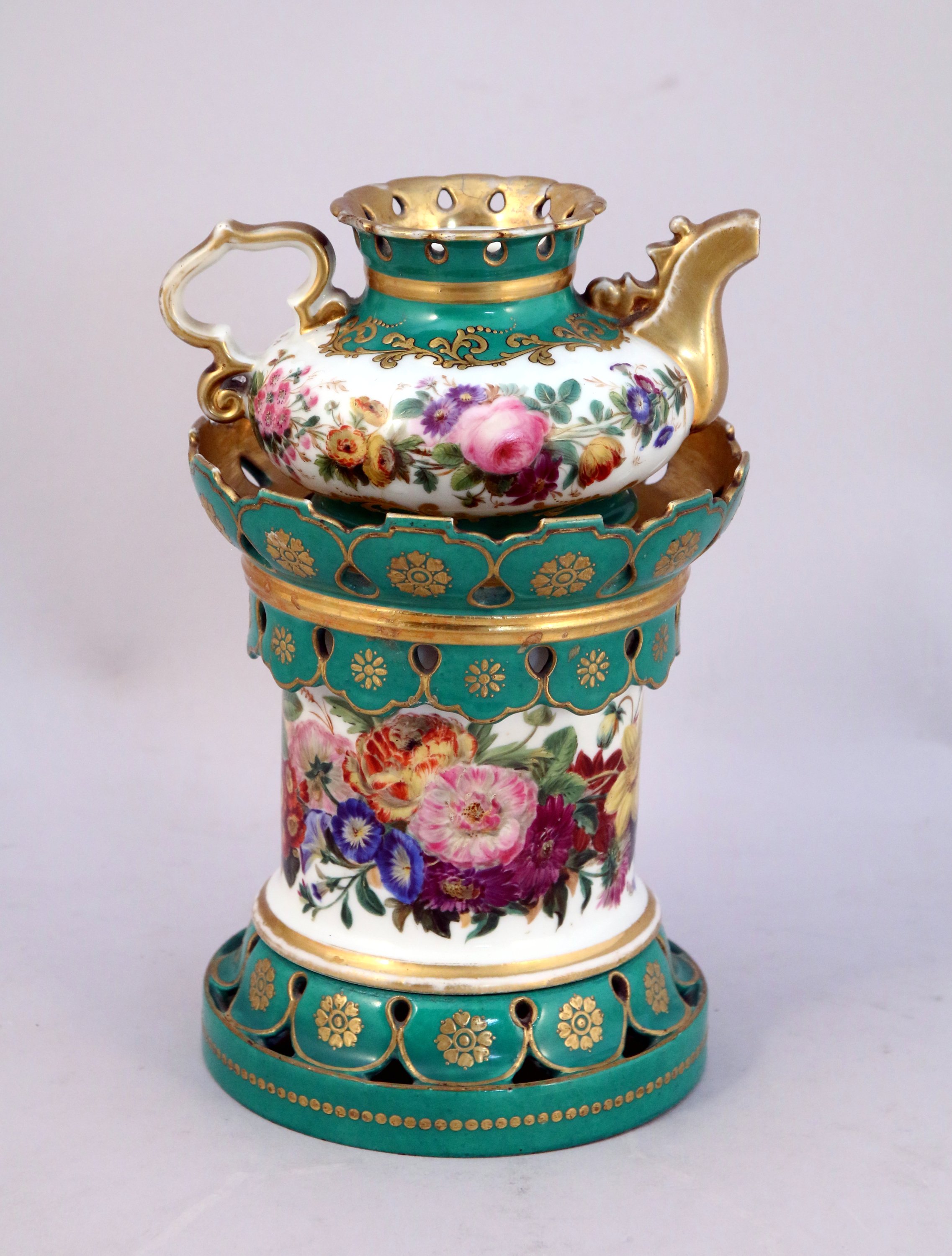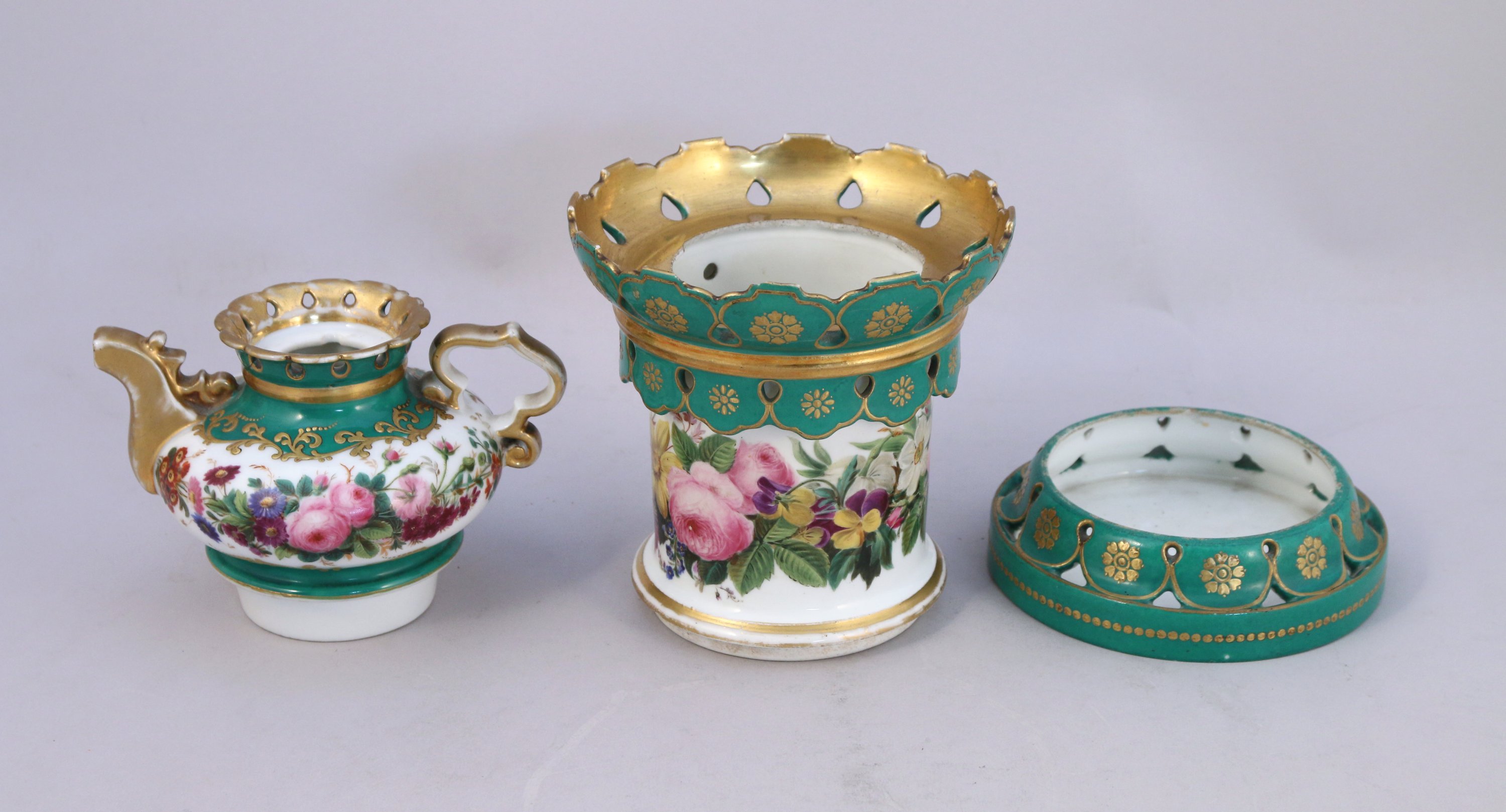 -TISANIÈRE formant veilleuse en porcelaine émaillé vert à décor de fleurs dans des réserves rocailles, composé de trois éléments. Haut. 22 cm.