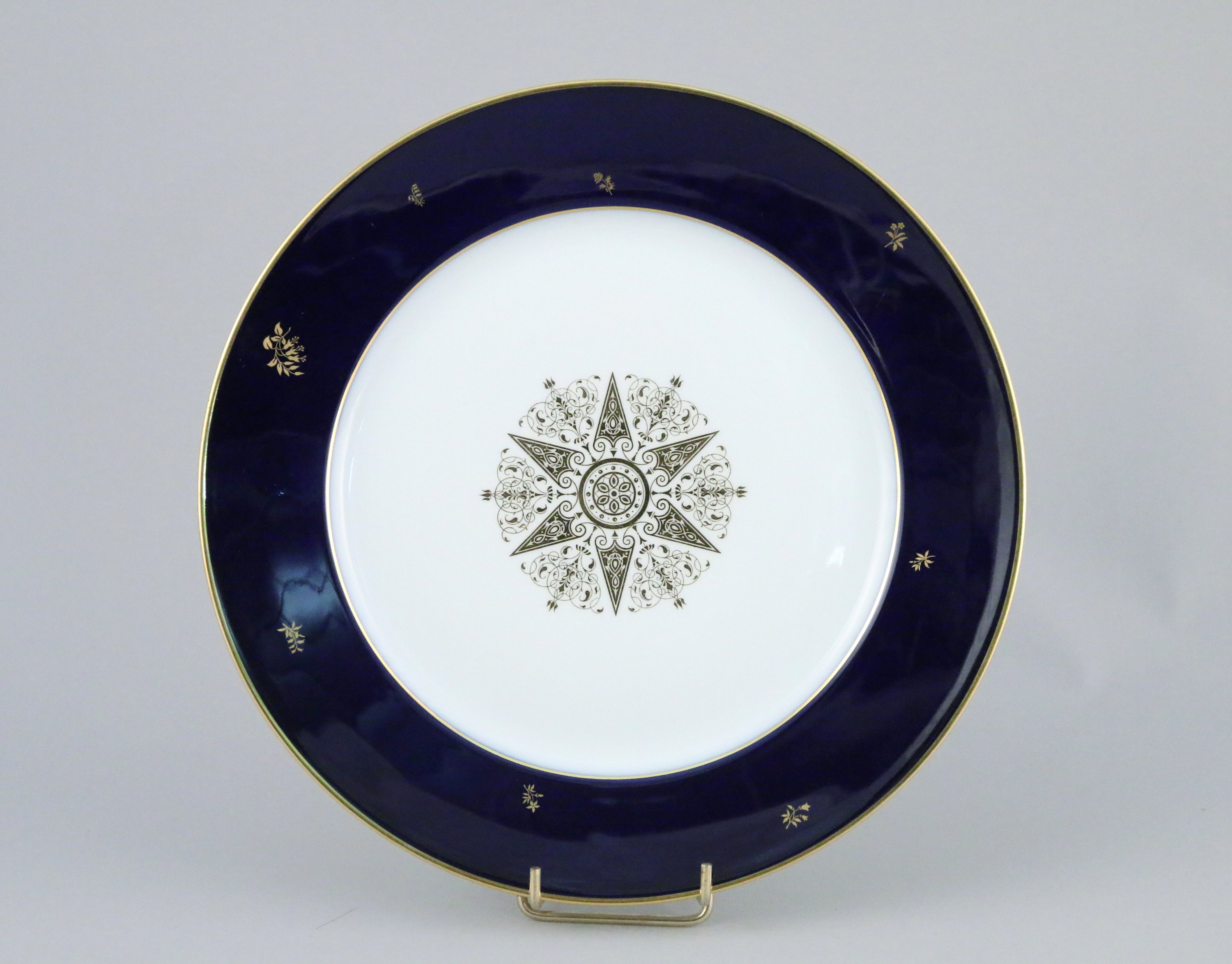 en porcelaine à la rosace dorée, l'aile décorée à fond bleu d'un semis de fleurs doré.