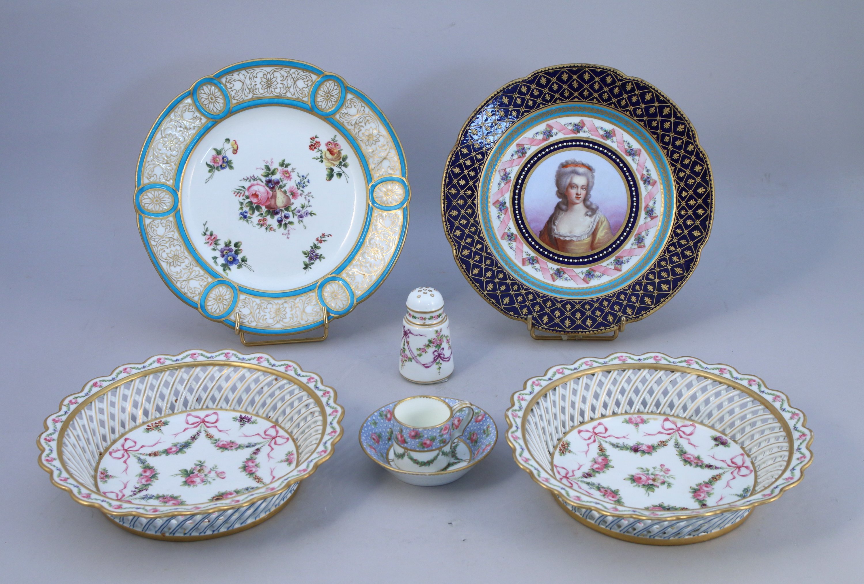 - ASSIETTE en porcelaine à bord contourné, le marli à décor de croisillons et fleurs de lys or sur fond bleu de Sèvres. Au centre dans un médaillon figure le portrait d'une dame de qualité dans un riche décor de guirlandes de fleurs, rubans, feuilles et perles. Marque apocryphe de Sèvres. Début XXe.