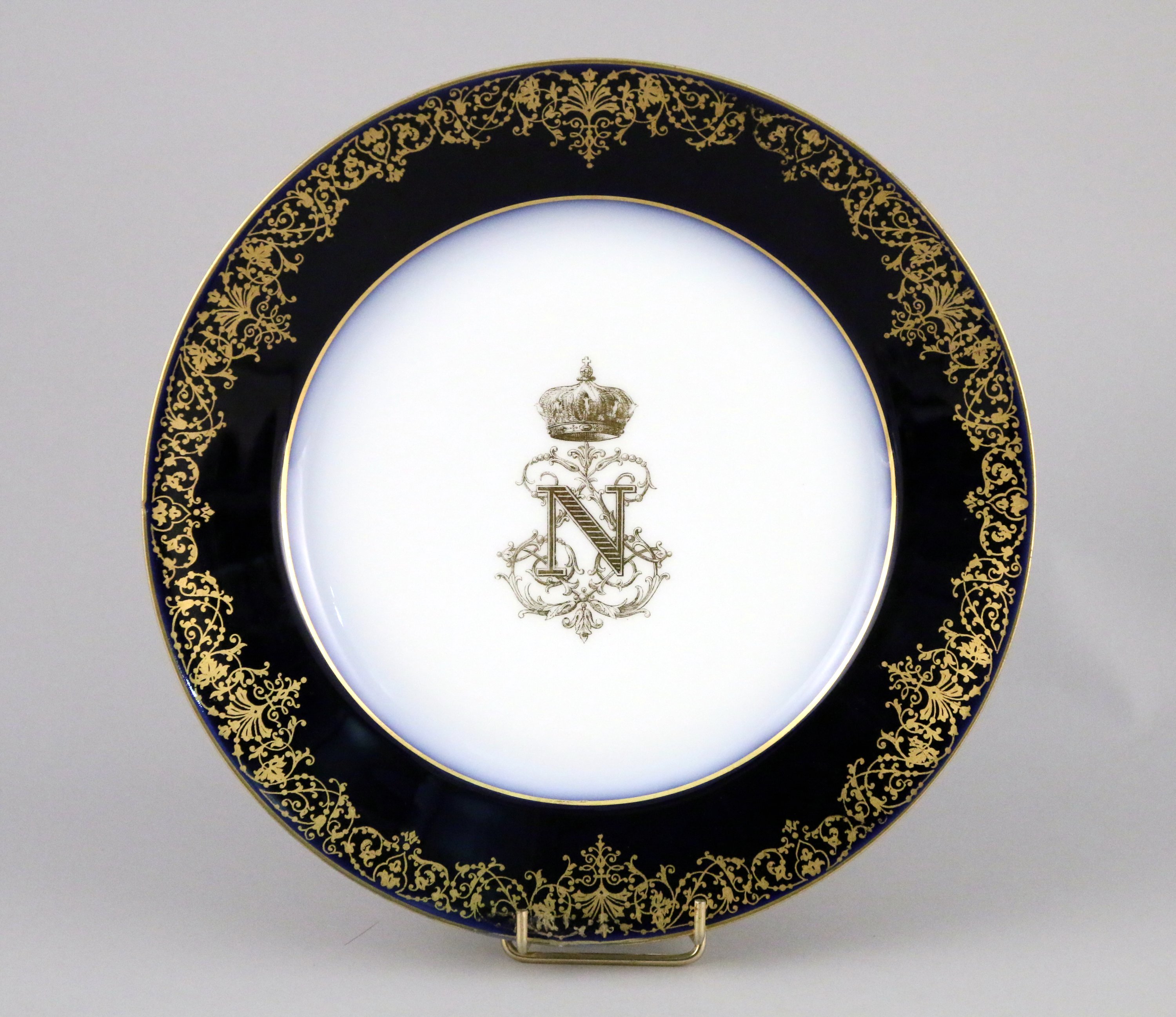 ASSIETTE en porcelaine au chiffre de Napoléon Ier couronné et doré, l'aile décorée sur fond bleu d'une frise d'entrelacs doré.