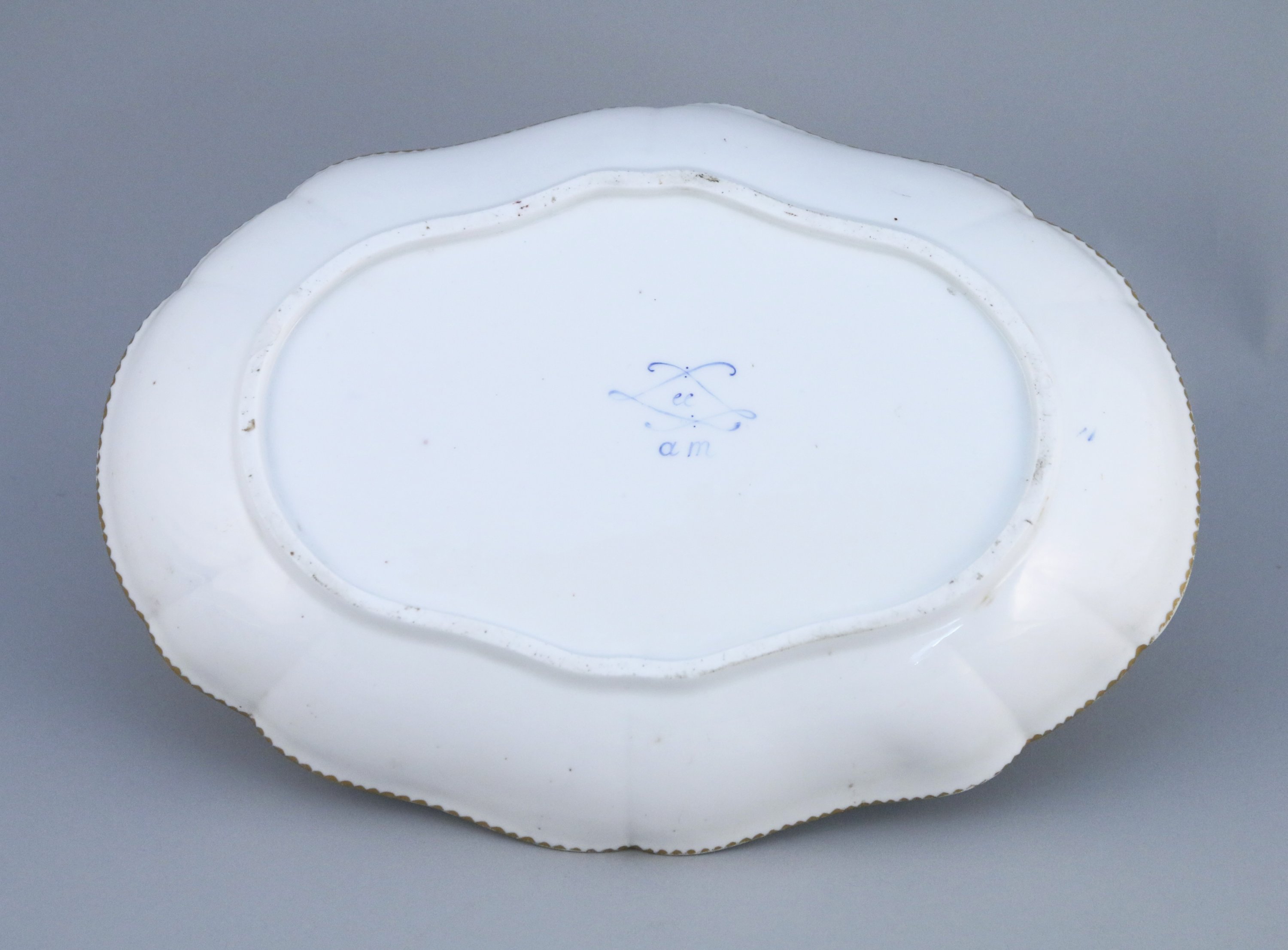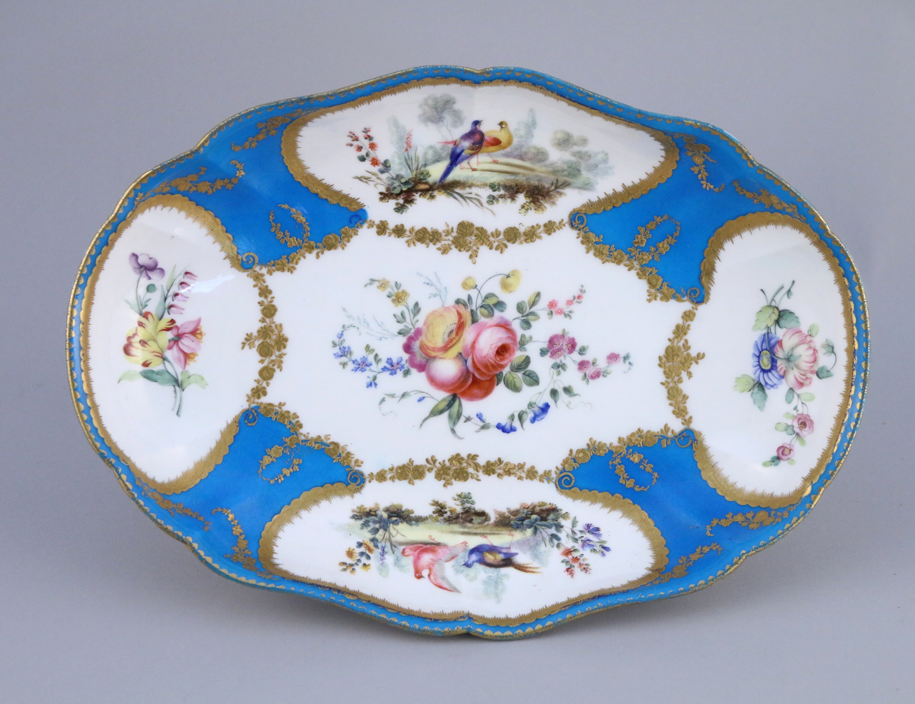 JATTE polylobée en porcelaine, modèle d'après le service bleu céleste de Louis XV, à décor polychrome et or de bouquets de fleurs et d'oiseaux dans des réserves rocaille or se détachant sur un fond bleu céleste, dents de loup or sur le bord.