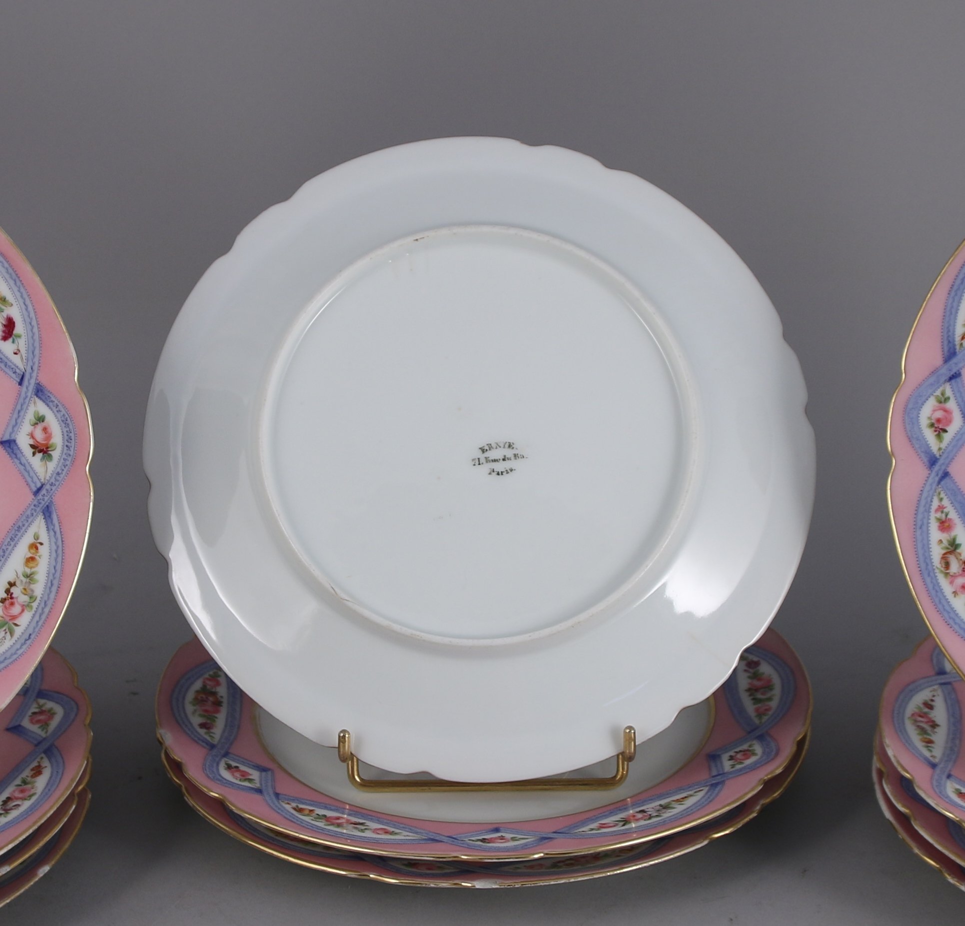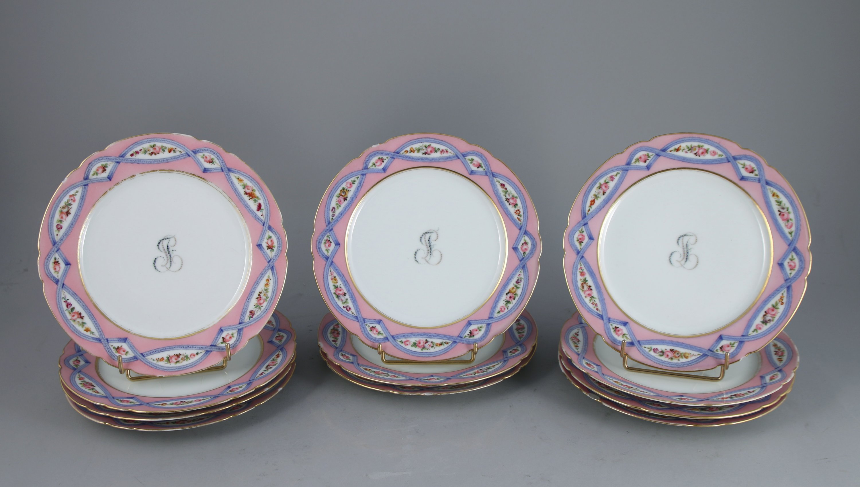 en porcelaine. L'aile de forme chantournée à filets or reçoit un décor polychrome de guirlandes de fleurs au naturel s'inscrivant entre deux rubans bleus sur fond rose poudré. Le bassin centré du momogramme "LF" en lettres composées de fleurettes pour l'une et de perles pour l'autre.