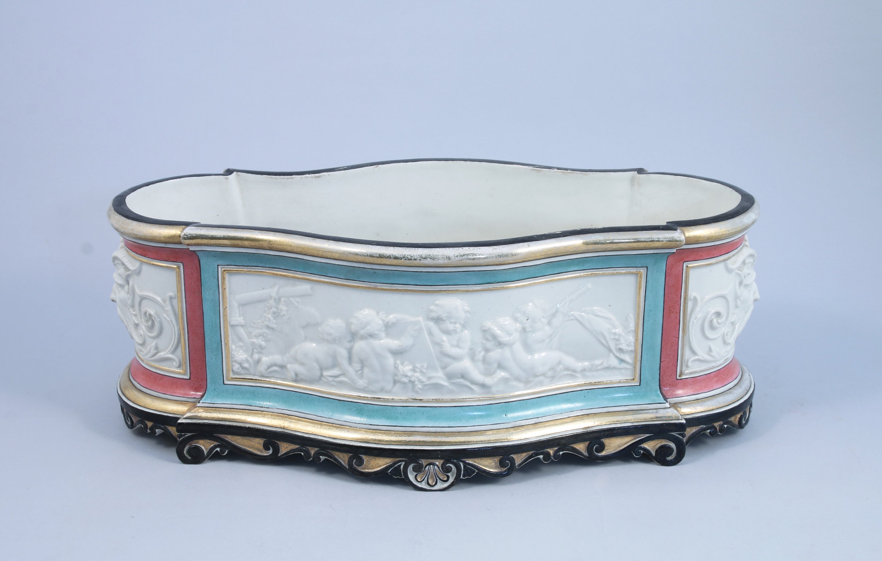 en porcelaine à décor en bas-relief de putti et marcarons dans des encadrement émaillés, vert, rose, noir et or. Frise à enroulements en partie basse.
