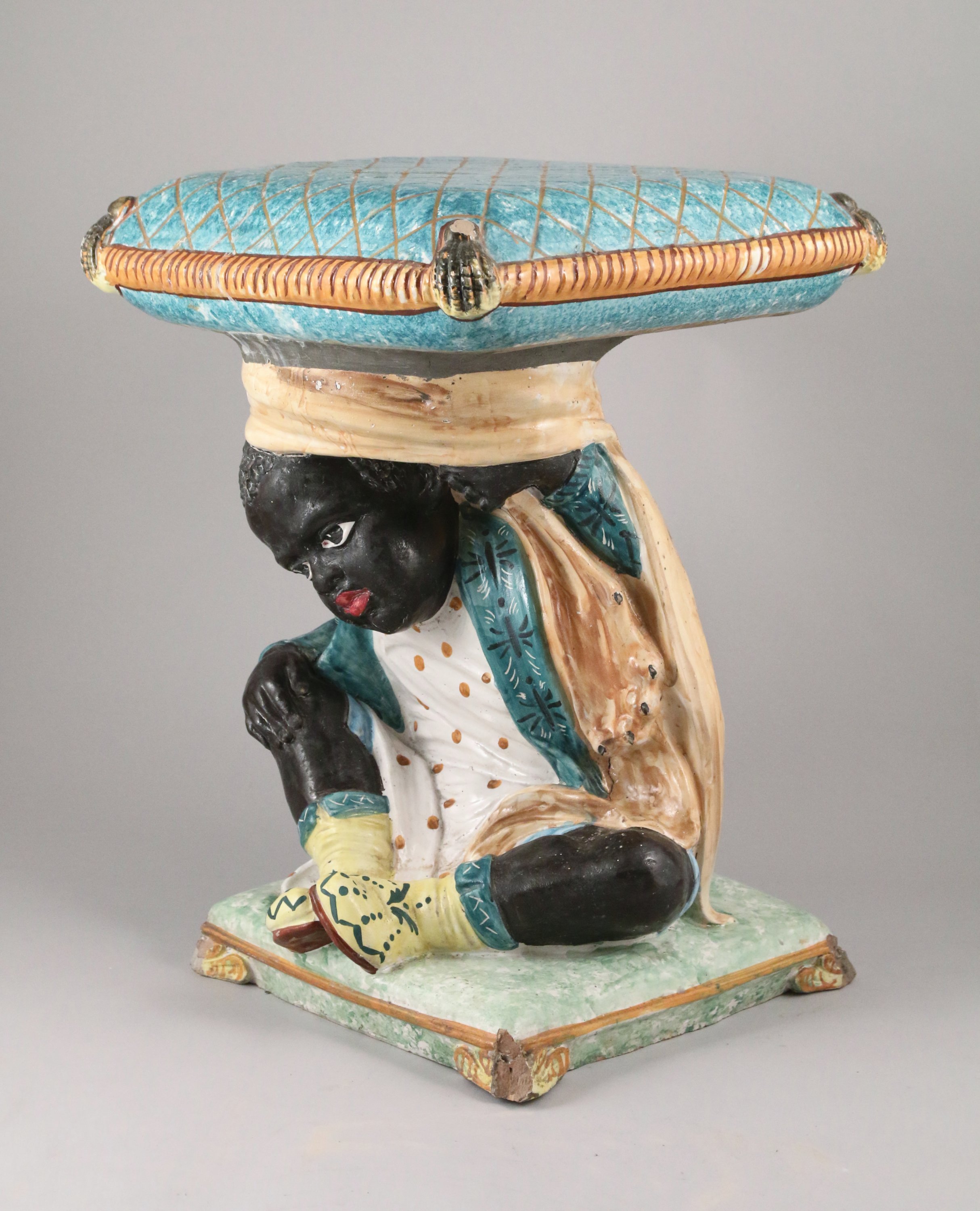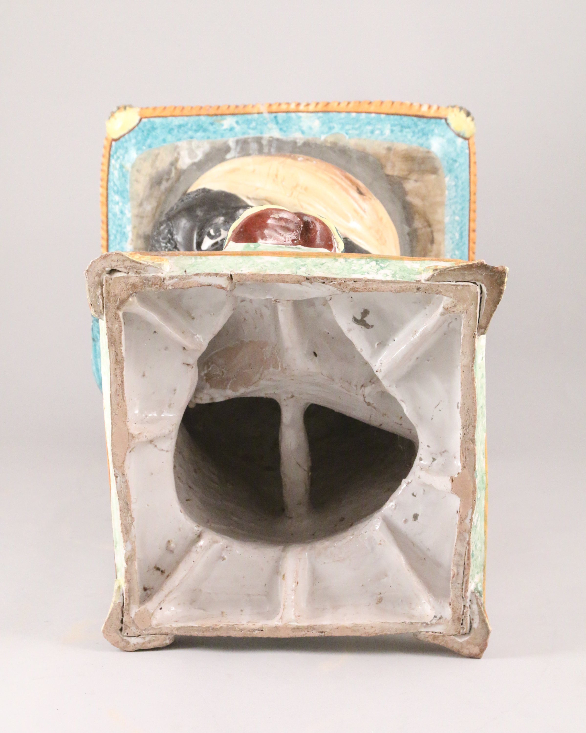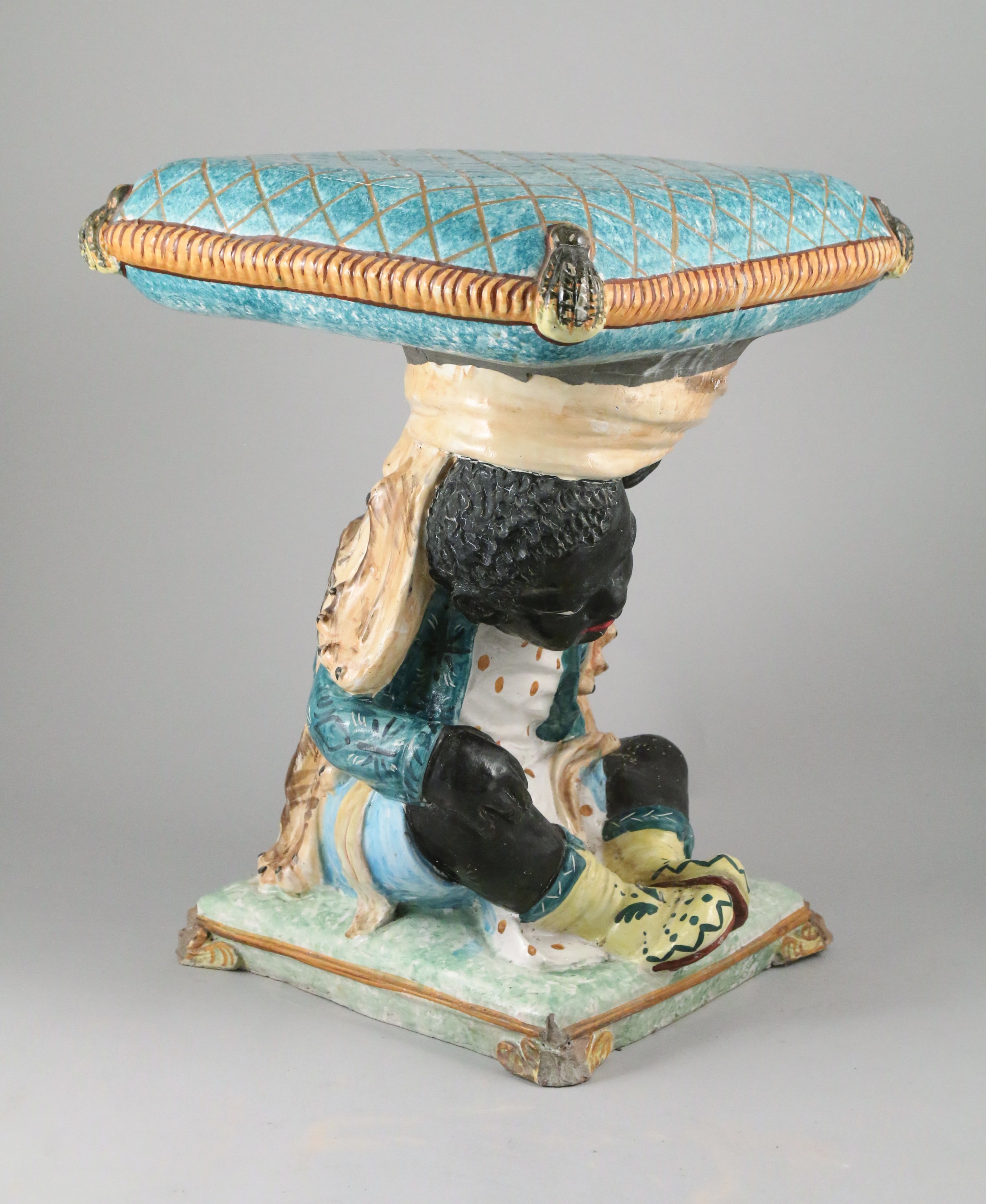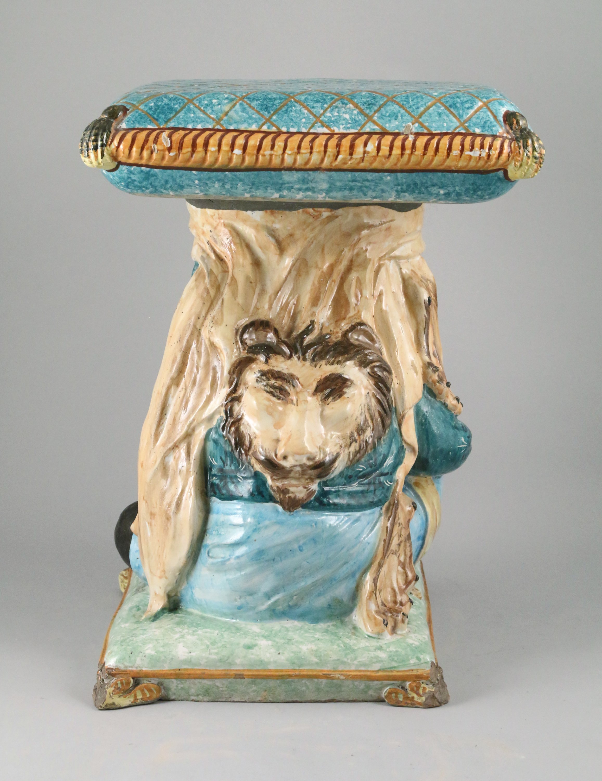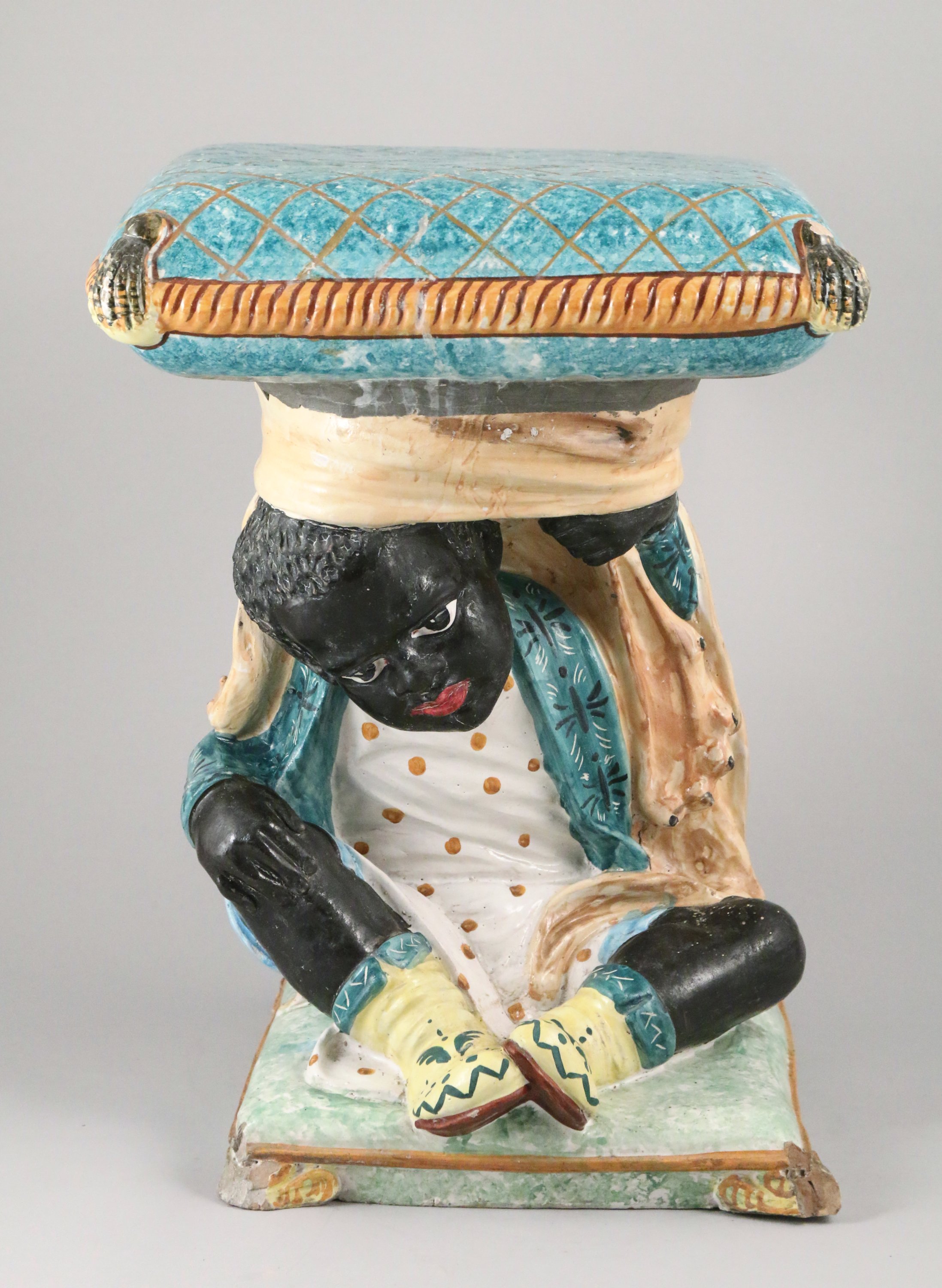 en céramique émaillée polychrome formant sellette. Décor d'un enfant assis vêtu d'une peau de lion tenant sur sa tête un coussin orné de passementeries.