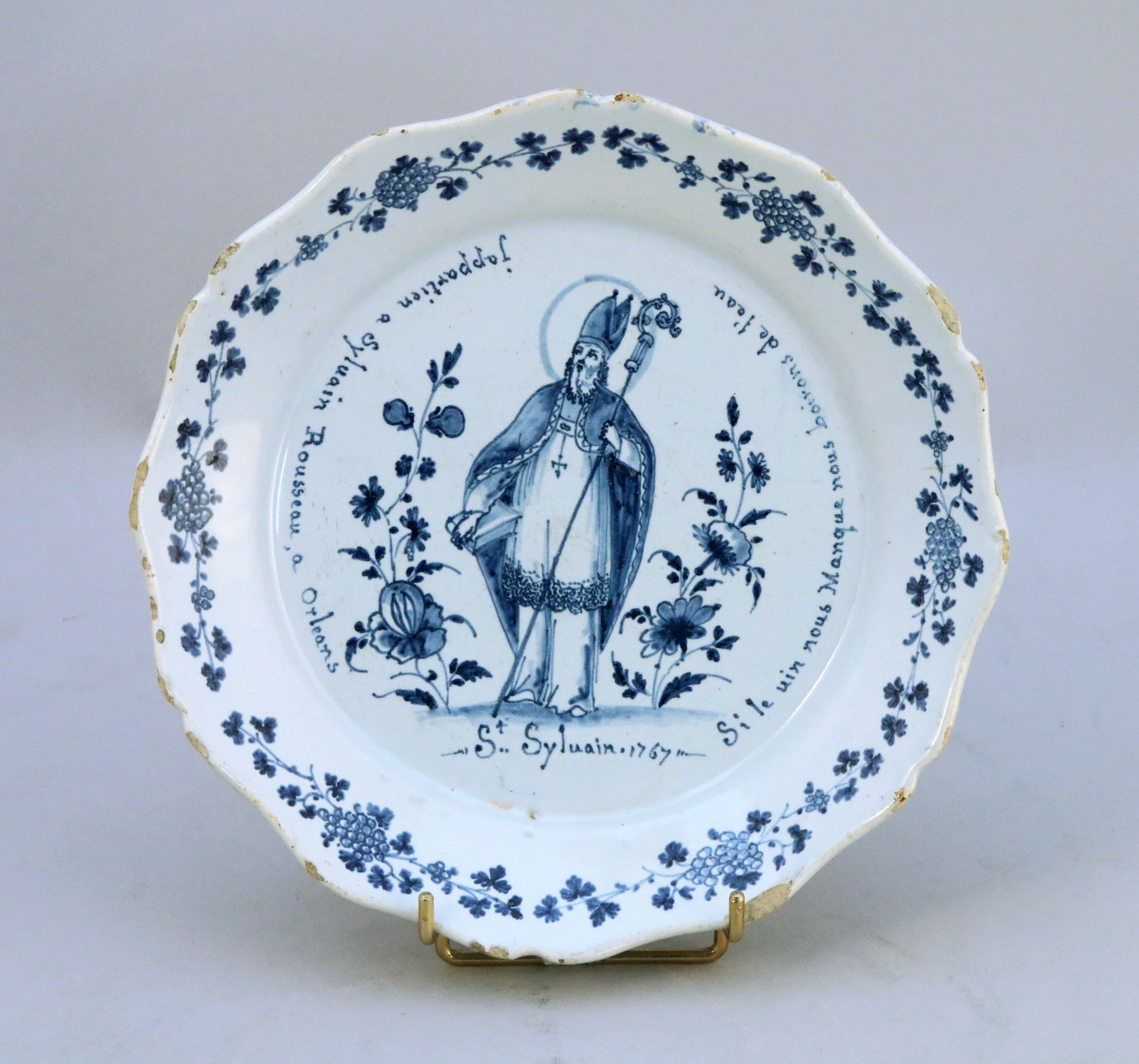 décor en camaïeu bleu patronymique représentant saint Sylvain en évêque, encadré de deux branches fleuries et de l'inscription "j'appartien a Sylvain Rousseau, à Orléans, St Sylvain 1767, si le vin nous Manque nous boirons de l'eau".