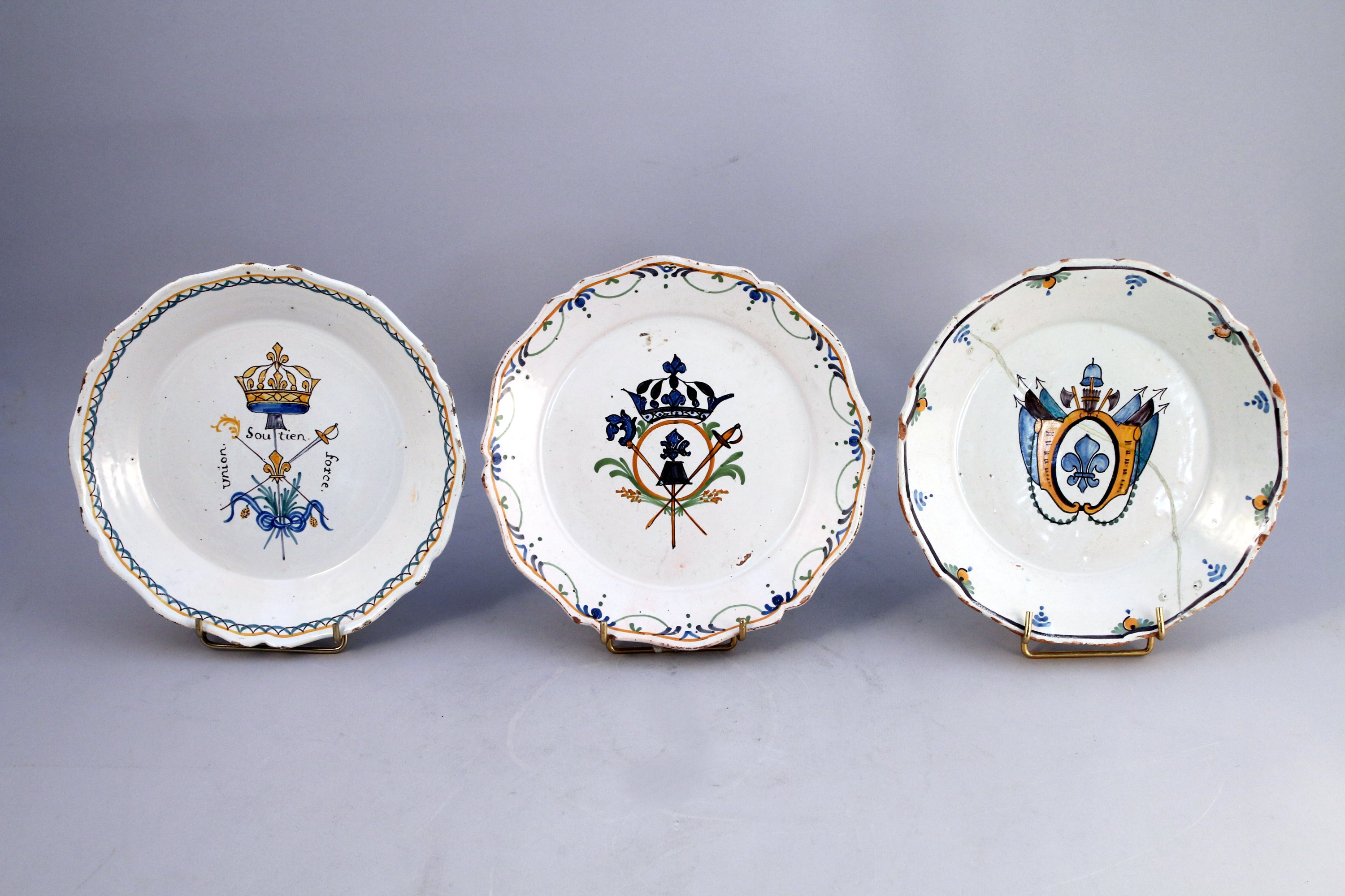 - ASSIETTE, représentant la réunion des Trois Ordres: l'épée, la crosse, et la bêche tête en haut soutenant la couronne royale réunies par une fleur de lys, à la base, rameaux noués, les inscriptions "soutien, force, union. Au revers l'inscription apocryphe "Ripault".