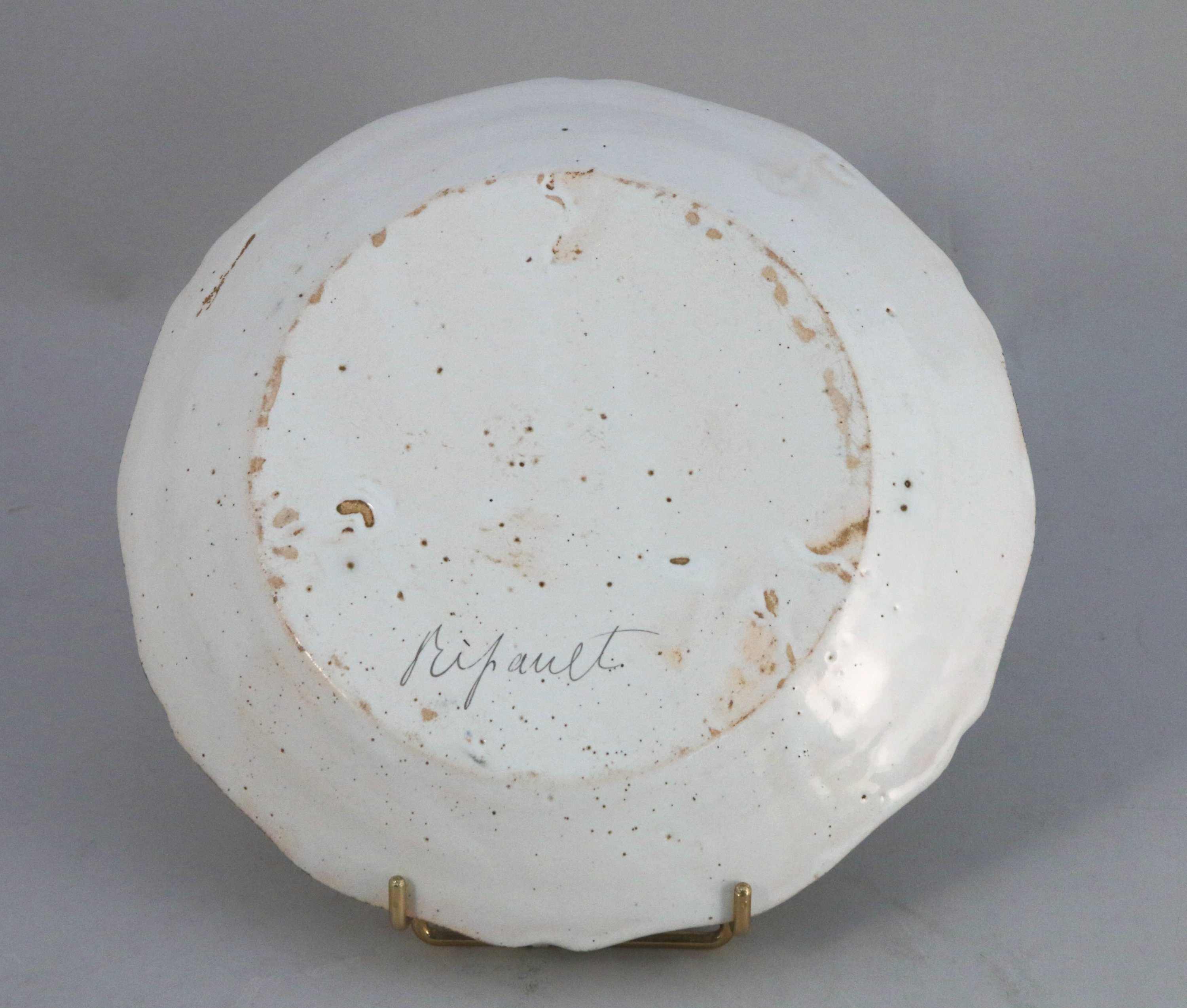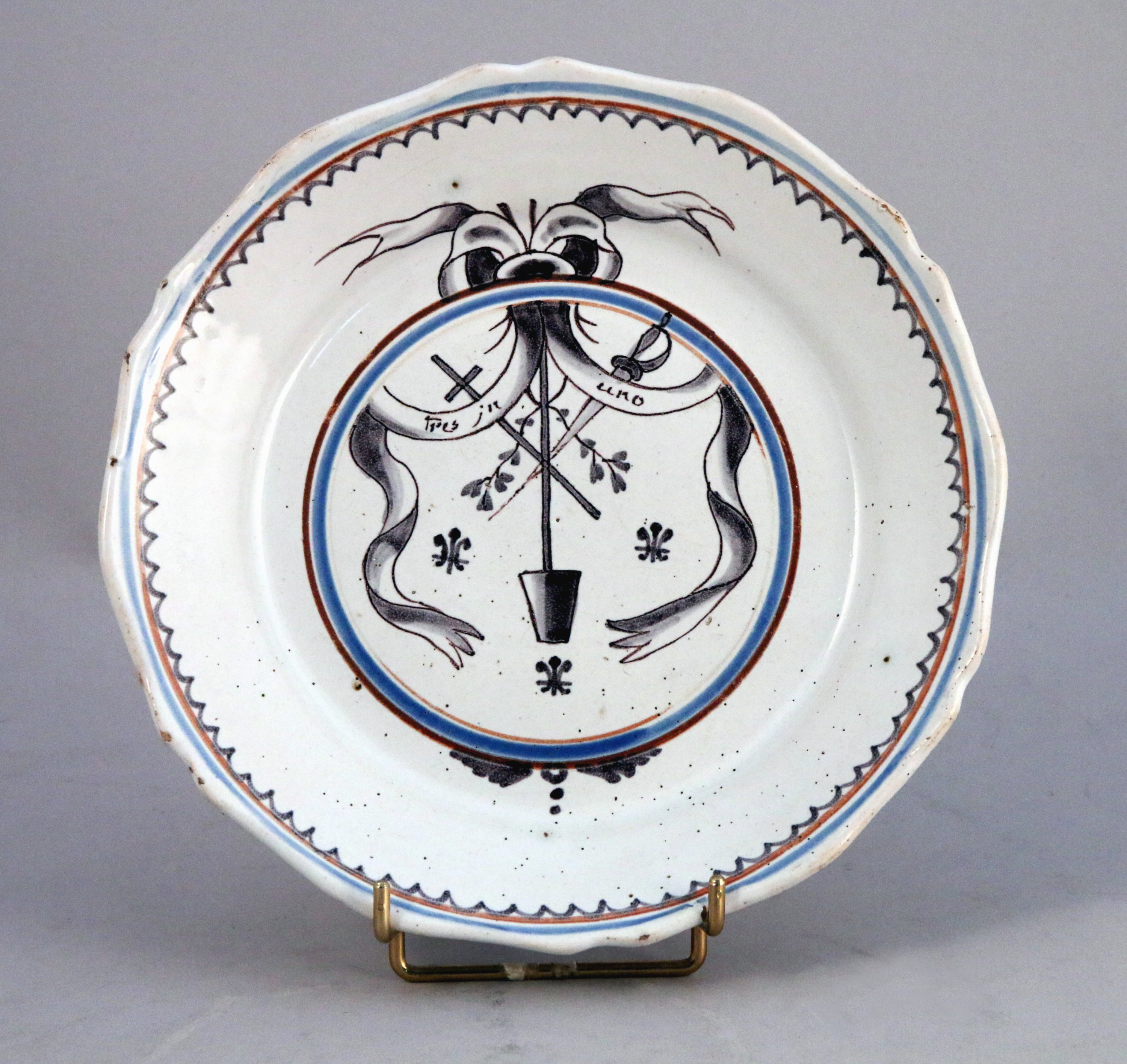 à bord contourné en faïence stannifère. Décor polychrome de grand feu, au centre en camaïeu de gris des trois ordres représentés par l'épée, la croix, la bêche avec des branches de laurier et trois fleurs de lys dans un médaillon bleu et jaune surmonté d'un noeud portant l'inscription « tres in uno ». Au revers l'inscription postérieure manuscrite "Ripault".