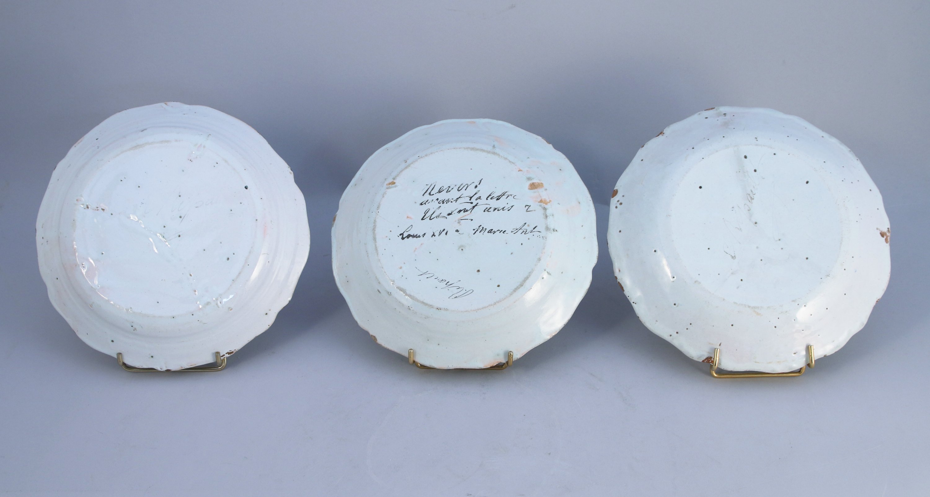 NEVERS, début XVIII, fin XIXe. Trois ASSIETTES de mariage à bords chantournés en faïence à décor polychrome: