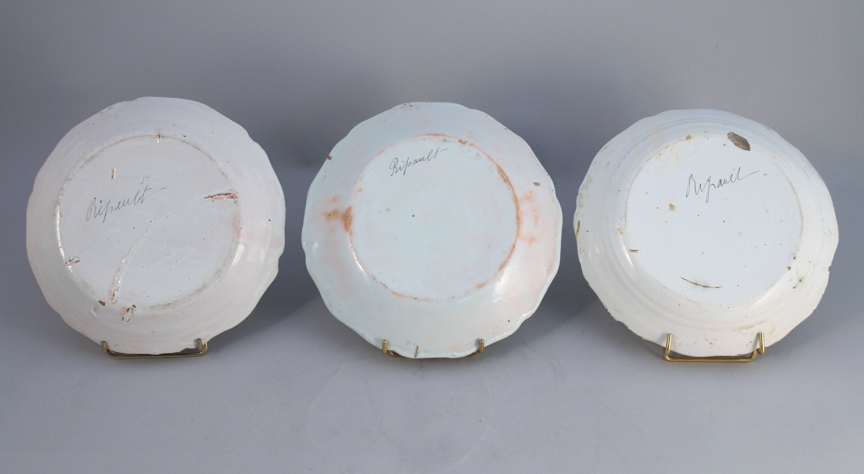NEVERS, fin XVIIIe. Trois ASSIETTES révolutionnaires, bords contournés en faïence stannifère. Décor polychrome de grand feu: