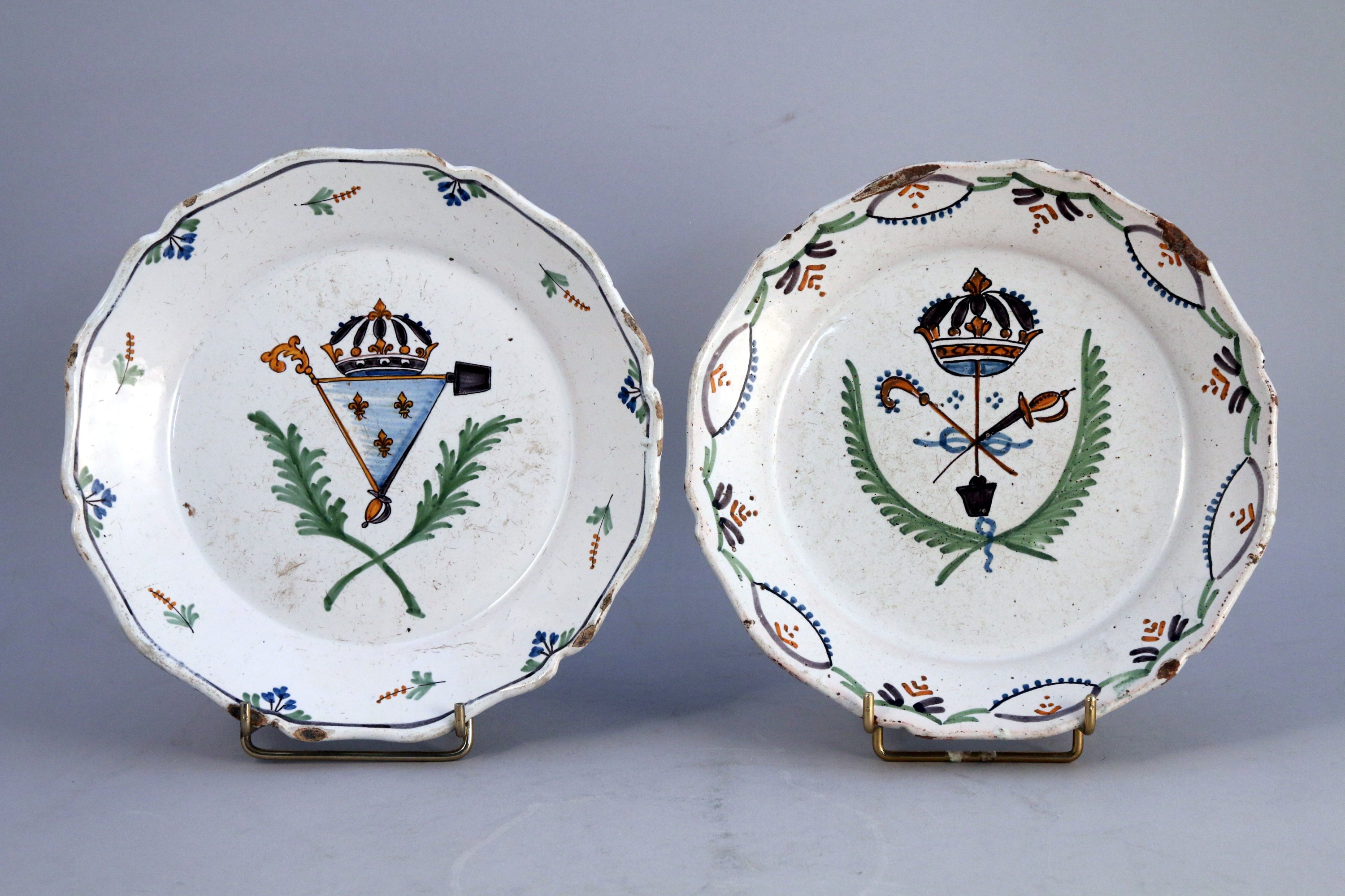 - ASSIETTE à décor d'une crosse, d'une épée et d'une pelle noués, une couronne fermée au dessus et deux palmes au dessous. Au revers l'inscription postérieure manuscrite "Ripault et marque bleue".