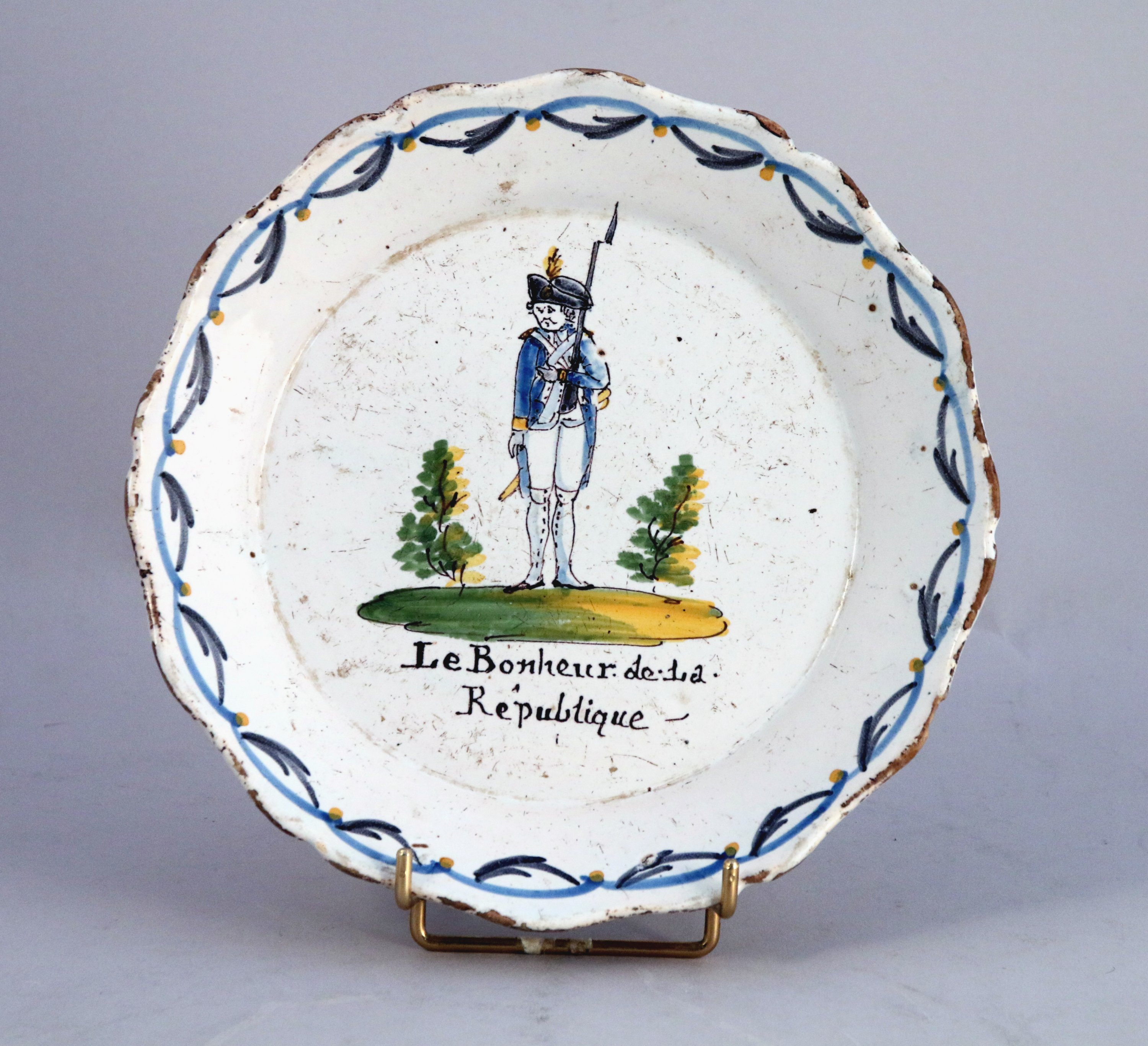 à bord contourné en faïence stannifère. Décor polychrome de grand feu d'un soldat debut sur un tertre arboré, inscription au dessous "Le Bonheur de La République". Au revers l'inscription postérieure manuscrite "assiette Clermontoise Ripault".