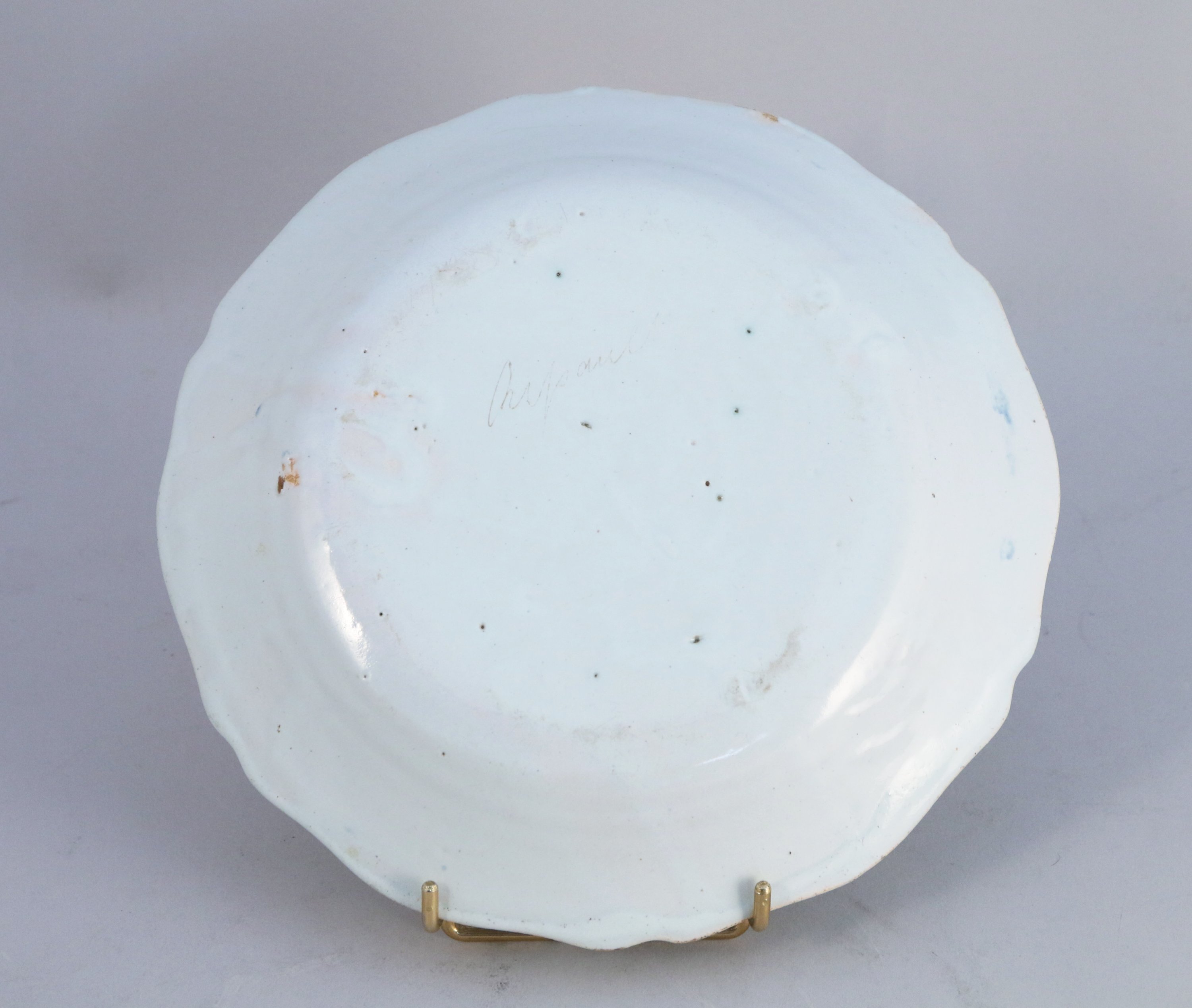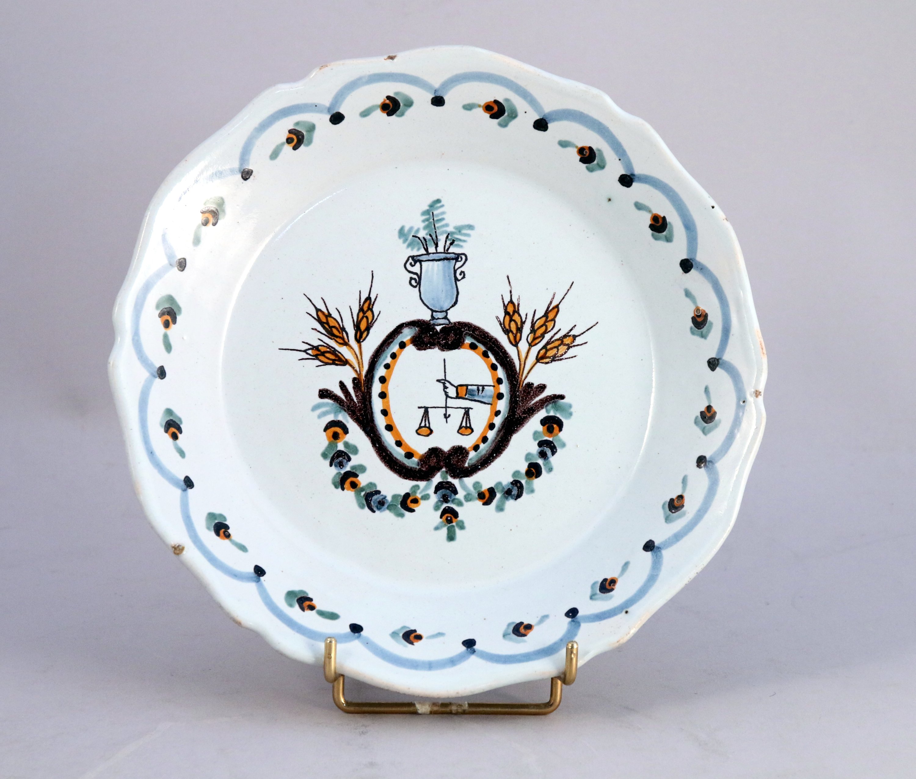 à bord contourné en faïence stannifère. Décor polychrome de grand feu d'un bras tendu tenant une balance dans une réserve rocaille encadrée de guirlandes de fleurs, surmontée d'un vase Médicis et encadré de six épis de blé. Au revers l'inscription apocryphe "Ripault".