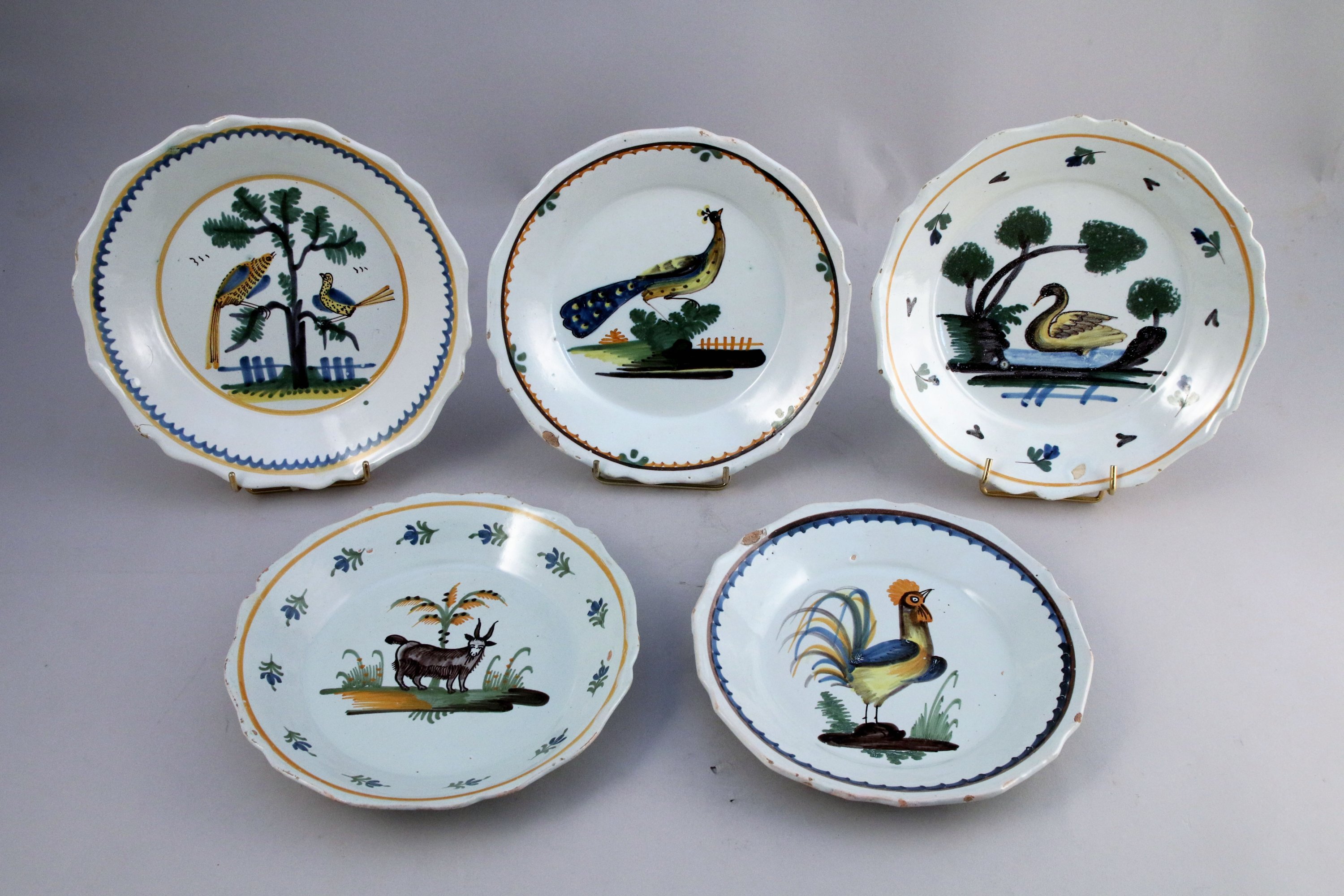 en faïence à décor polychrome de volatiles perchés sur un arbre, d'un paon, d'un cygne, d'un coq et d'une chèvre.