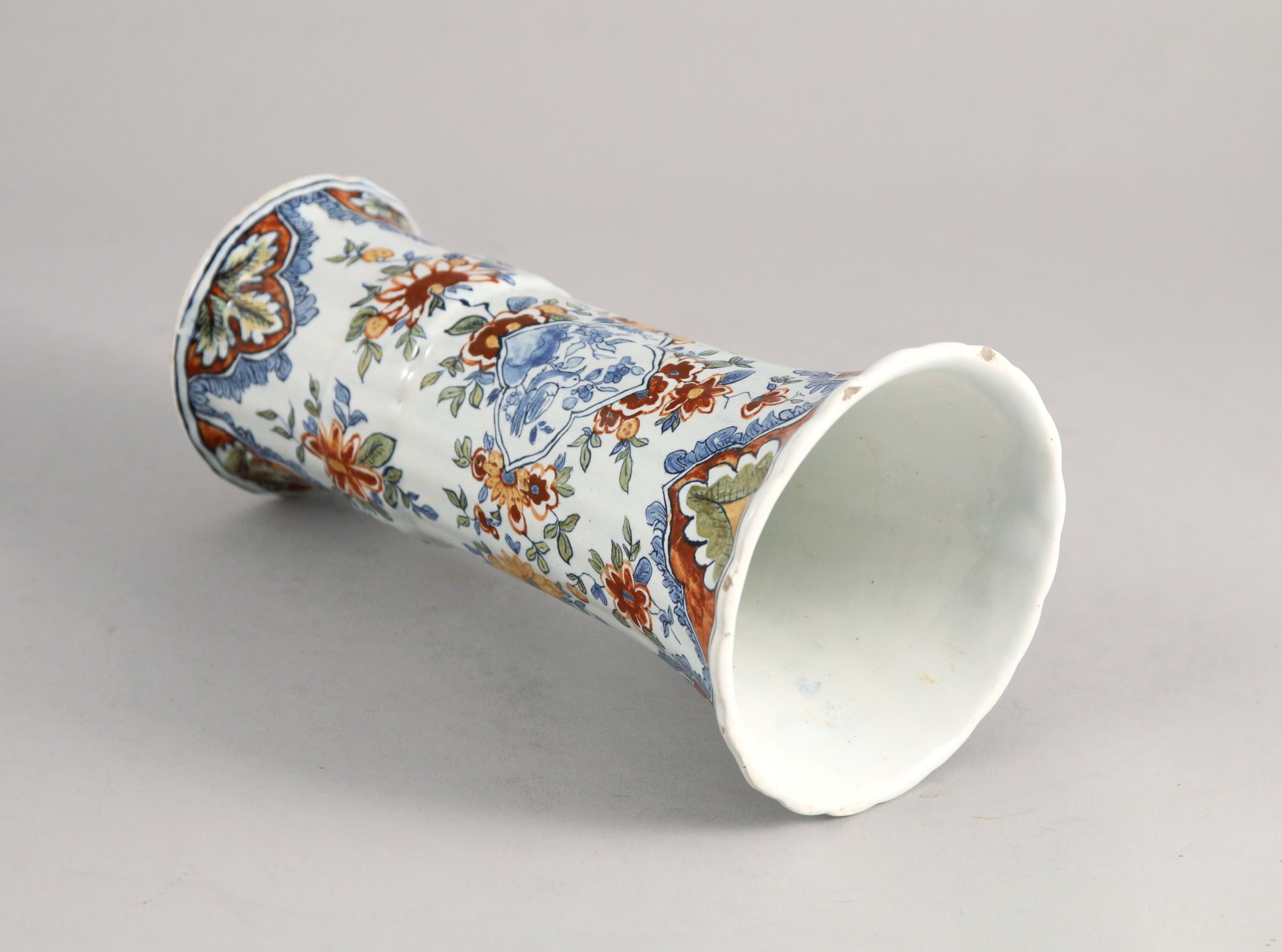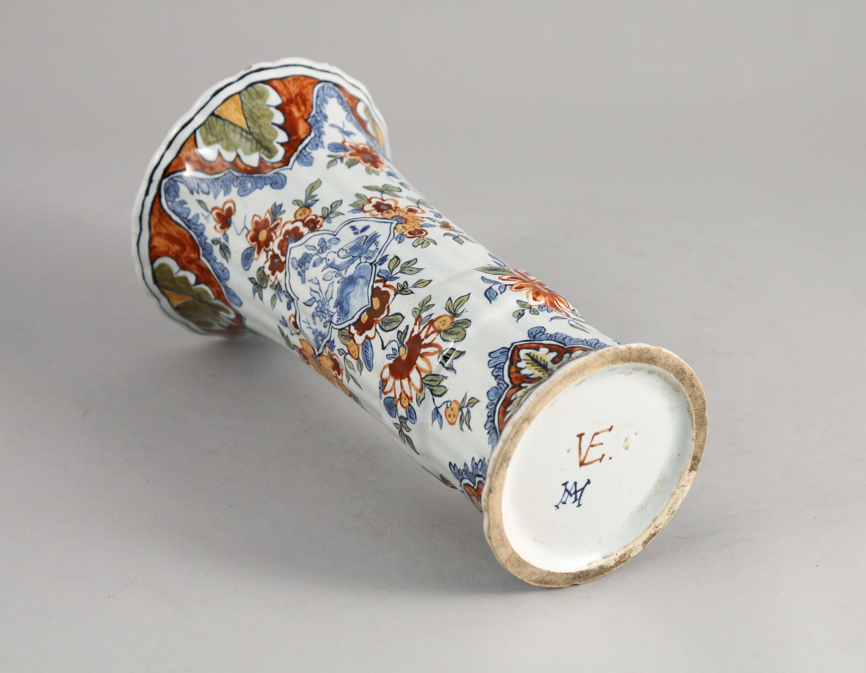 en faïence polychrome, le col et le pied à décor de feuilles d'acanthe, la panse ornée d'une forme quadrilobée dans laquelle s'inscrit un oiseau marchant.