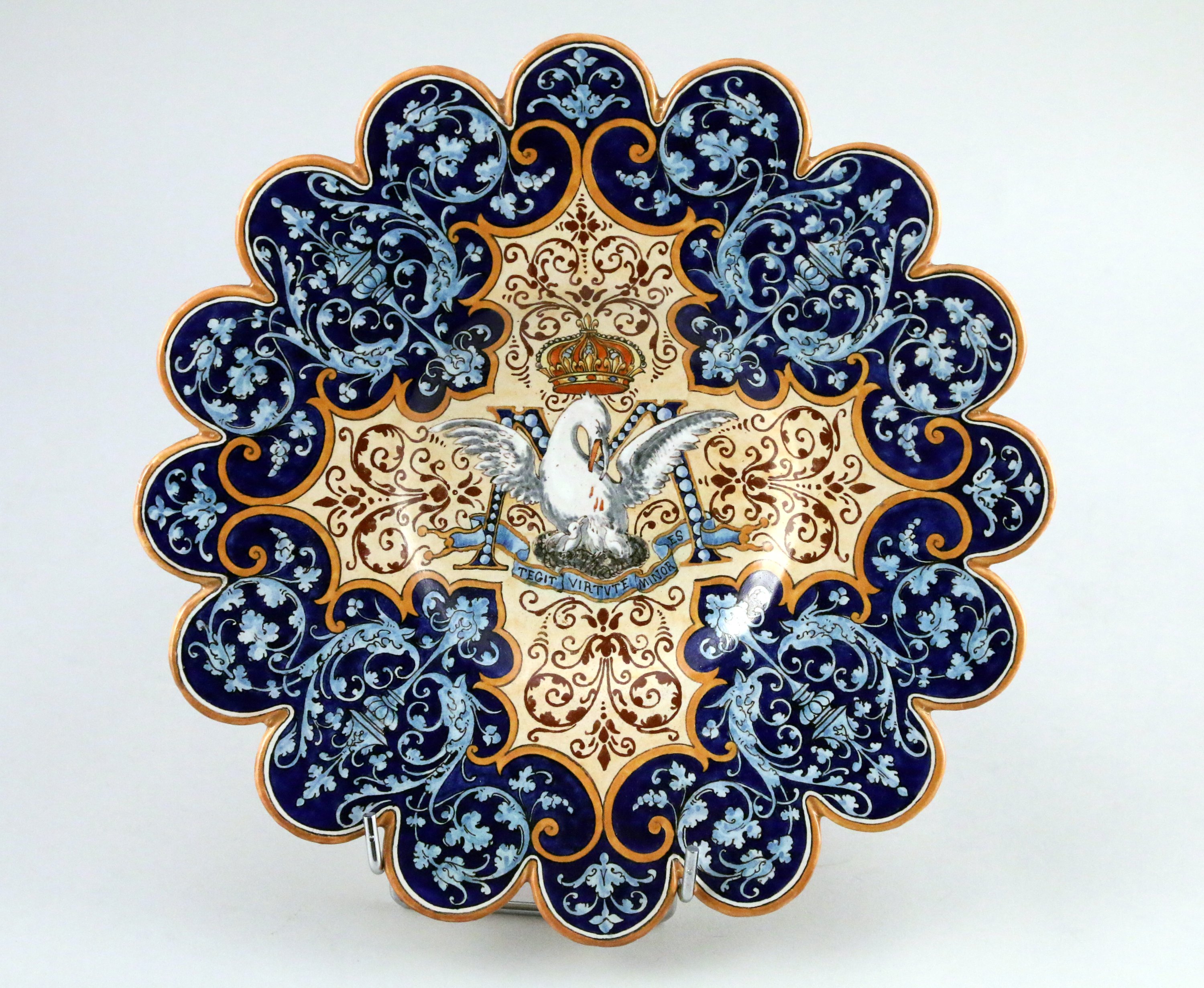 en céramique émaillée à bord polylobé. Décor polychrome au centre dans une réserve cruciforme ornée de rinceaux du pélican nourissant ses petit de son sang et du monogramme "M" couronné, sur un phylactère figure l'inscription "Tegit virtute minores".