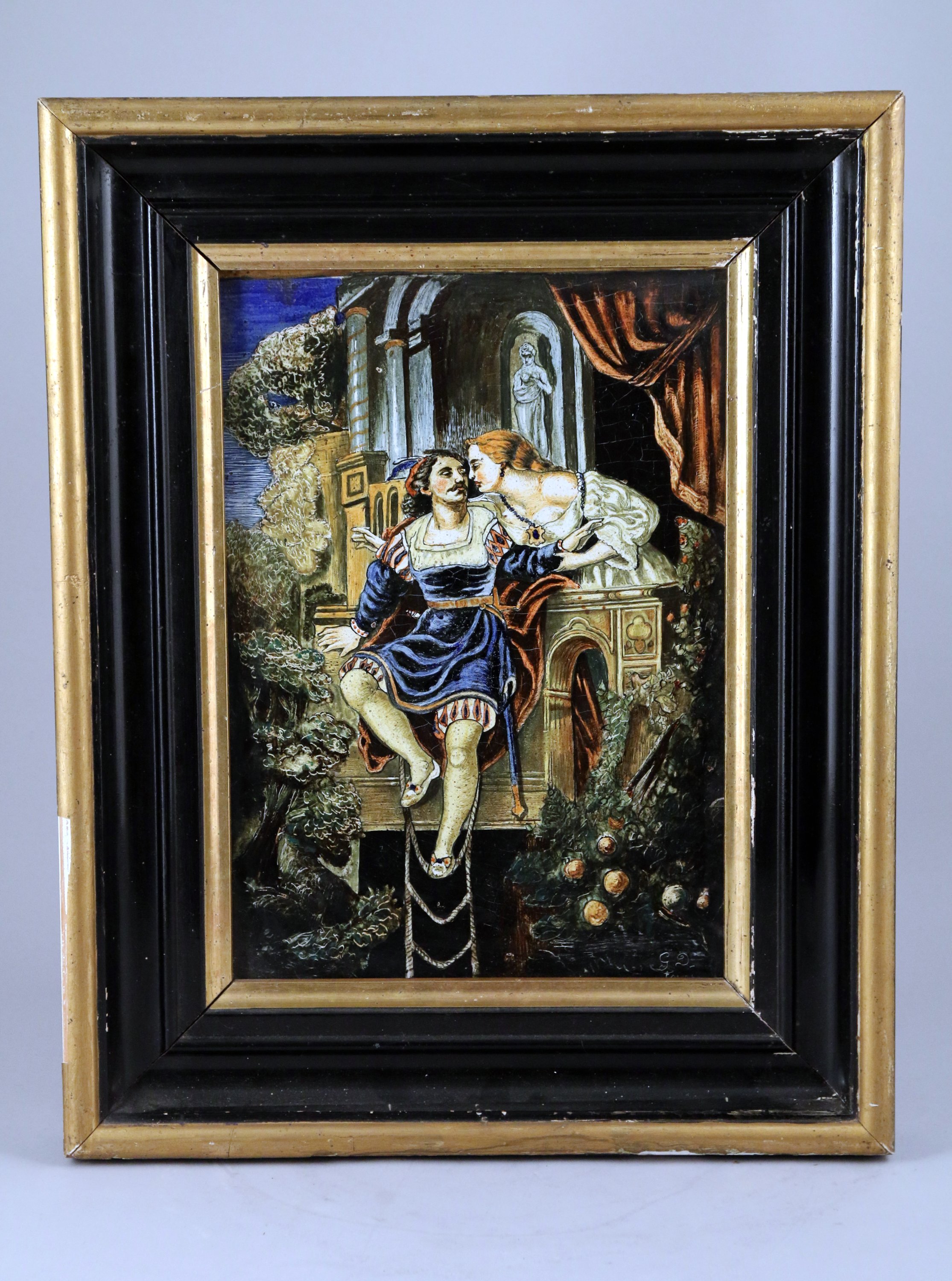 PLAQUE en céramique à décor polychrome représentant Roméo et Juliette.