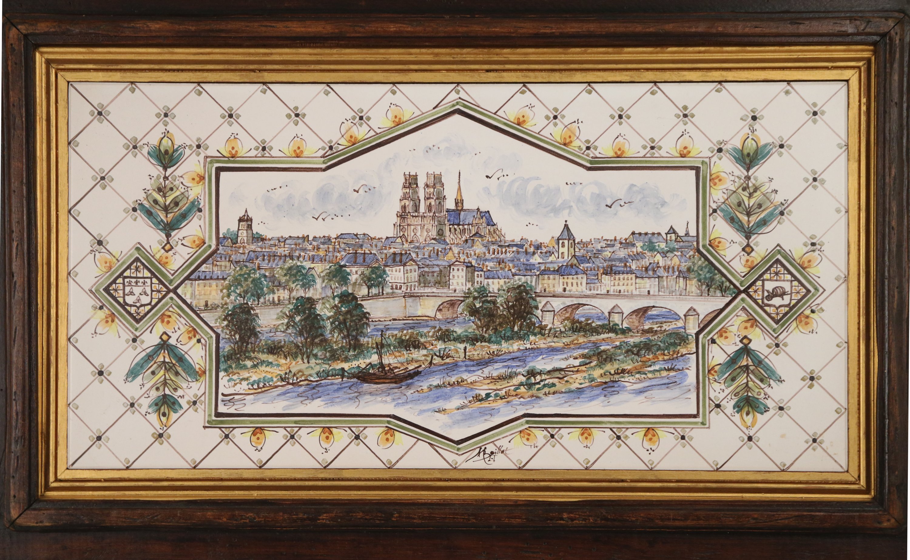 en faïence émaillée à décor dans un cartouche géométrique feuillagé d'une vue de la ville d'Orléans et de la cathédrale Sainte-Croix.