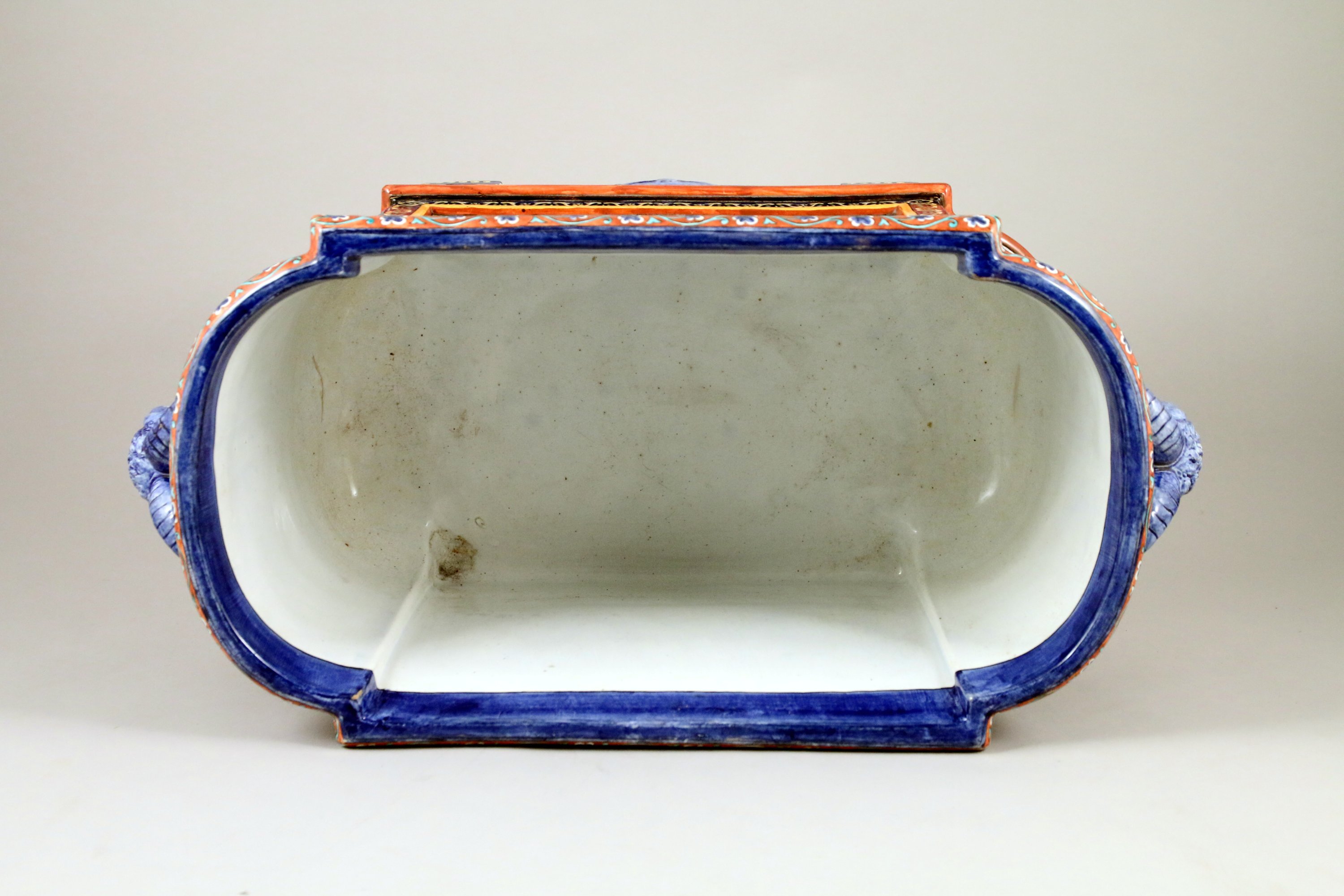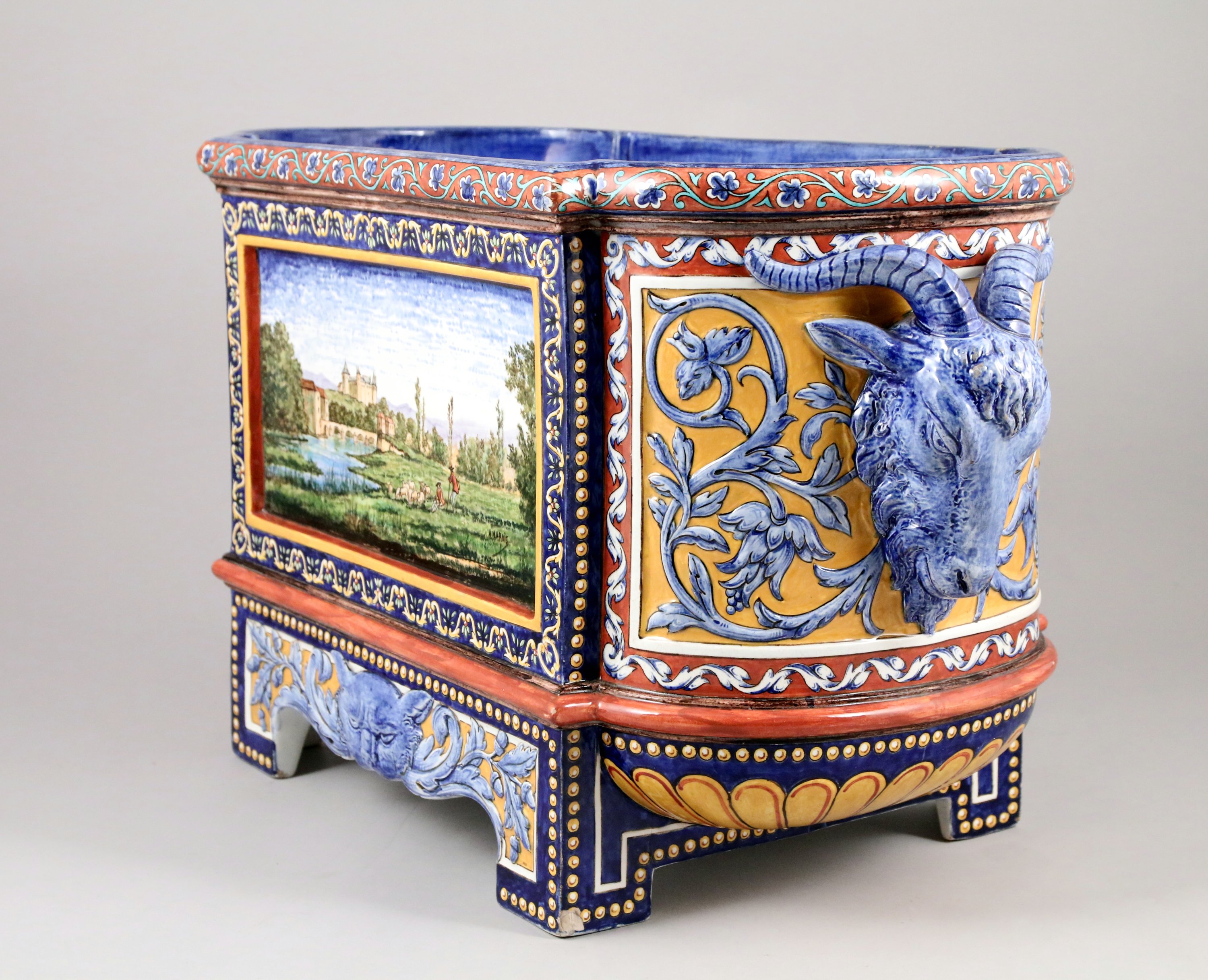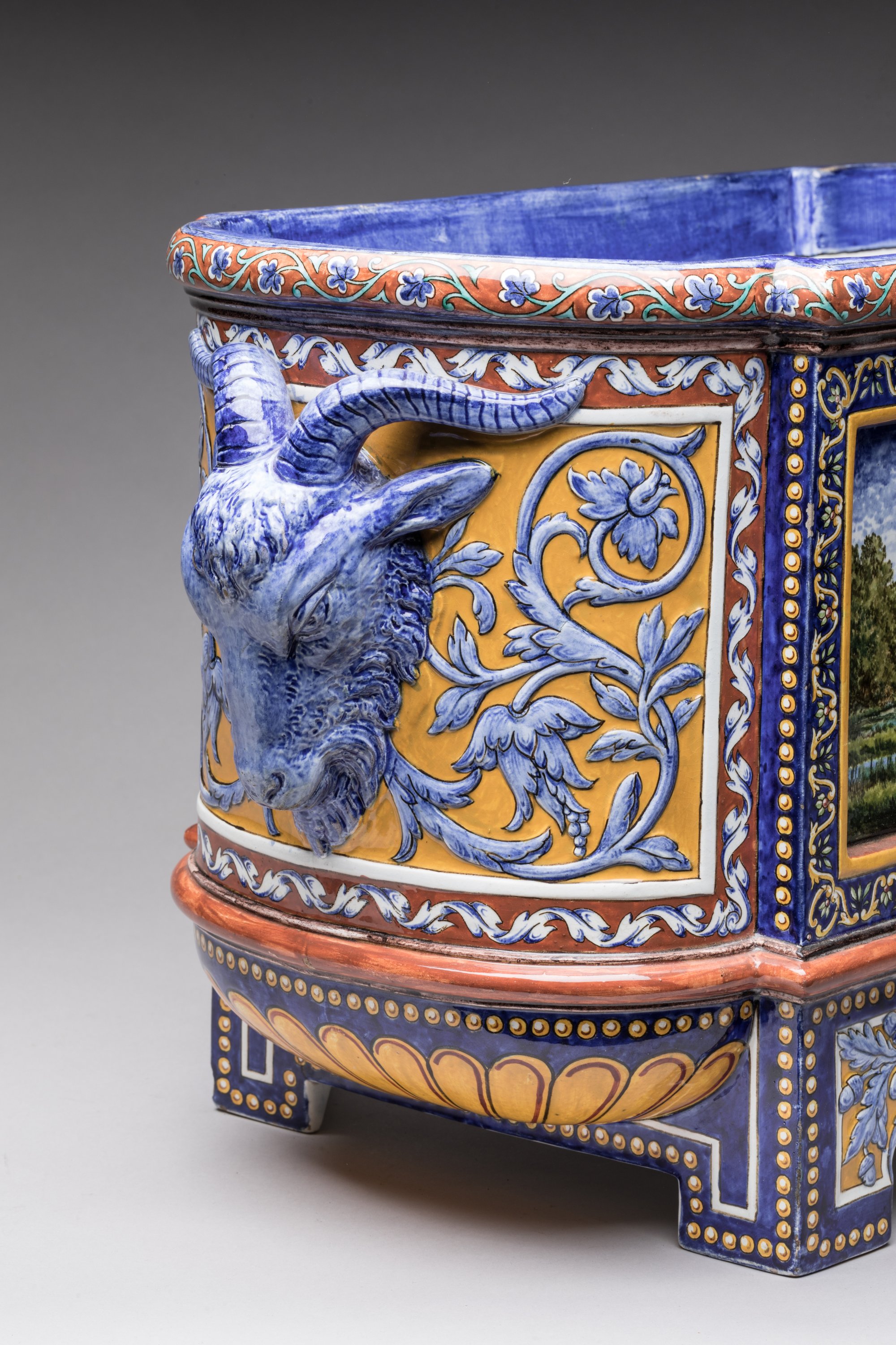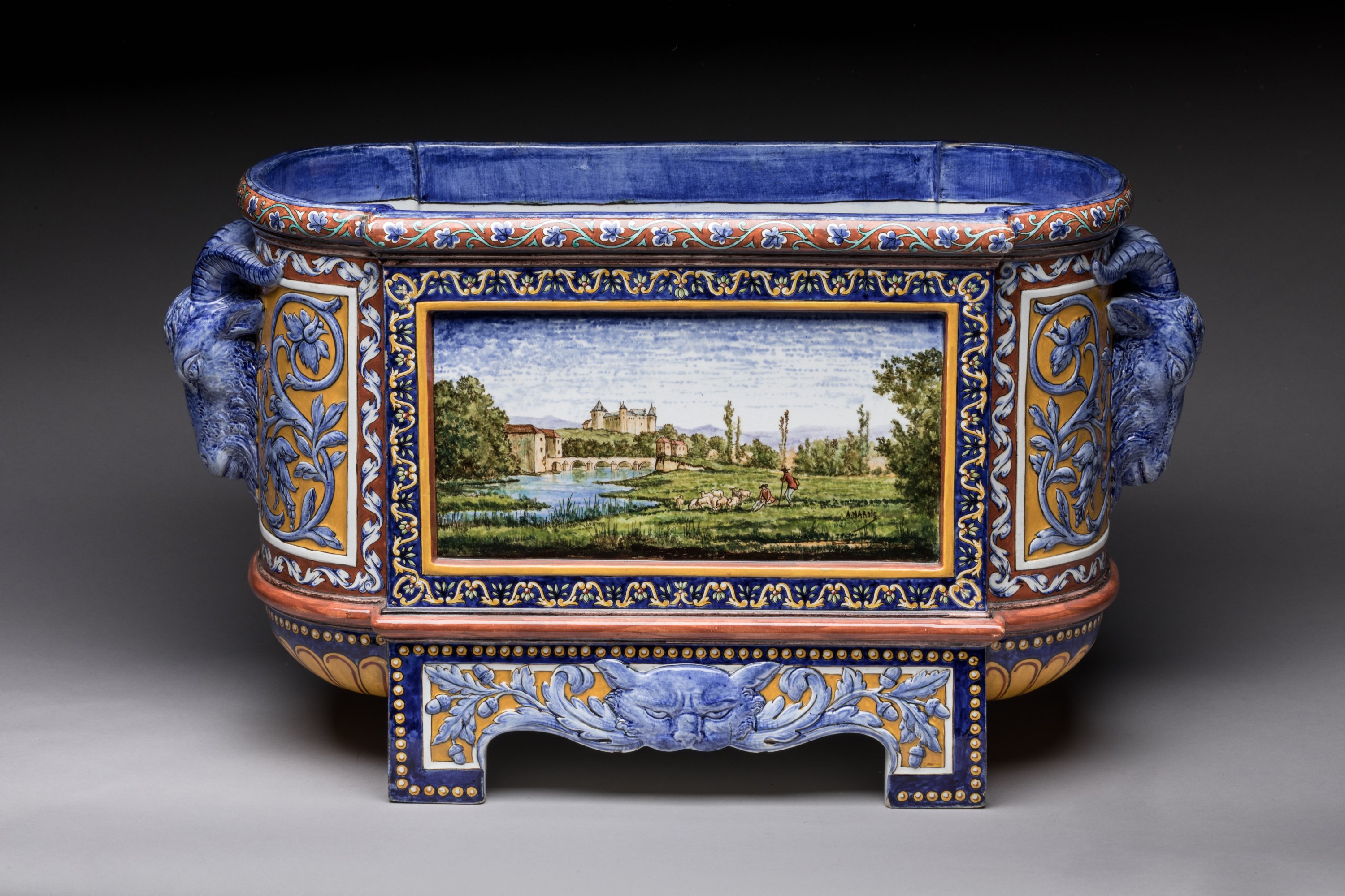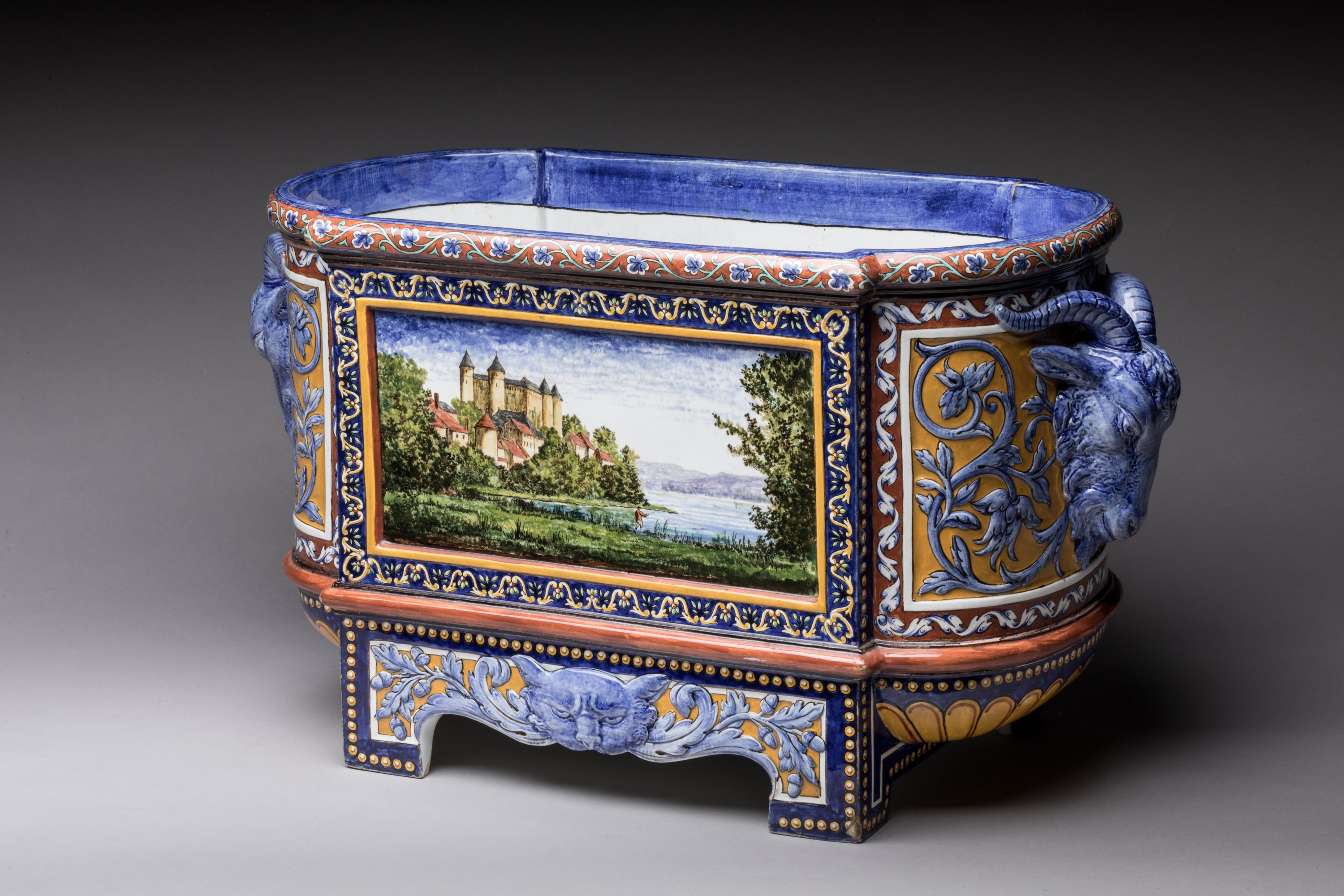 en céramique émaillée à ressauts et anses à têtes de béliers. Chaque face ornée d'un grand cartouche peint représentant d'une part une scène bucolique auprès d'un pont à arches (Montargis?) et d'autre part une scène de pêche au pied d'une place forte.