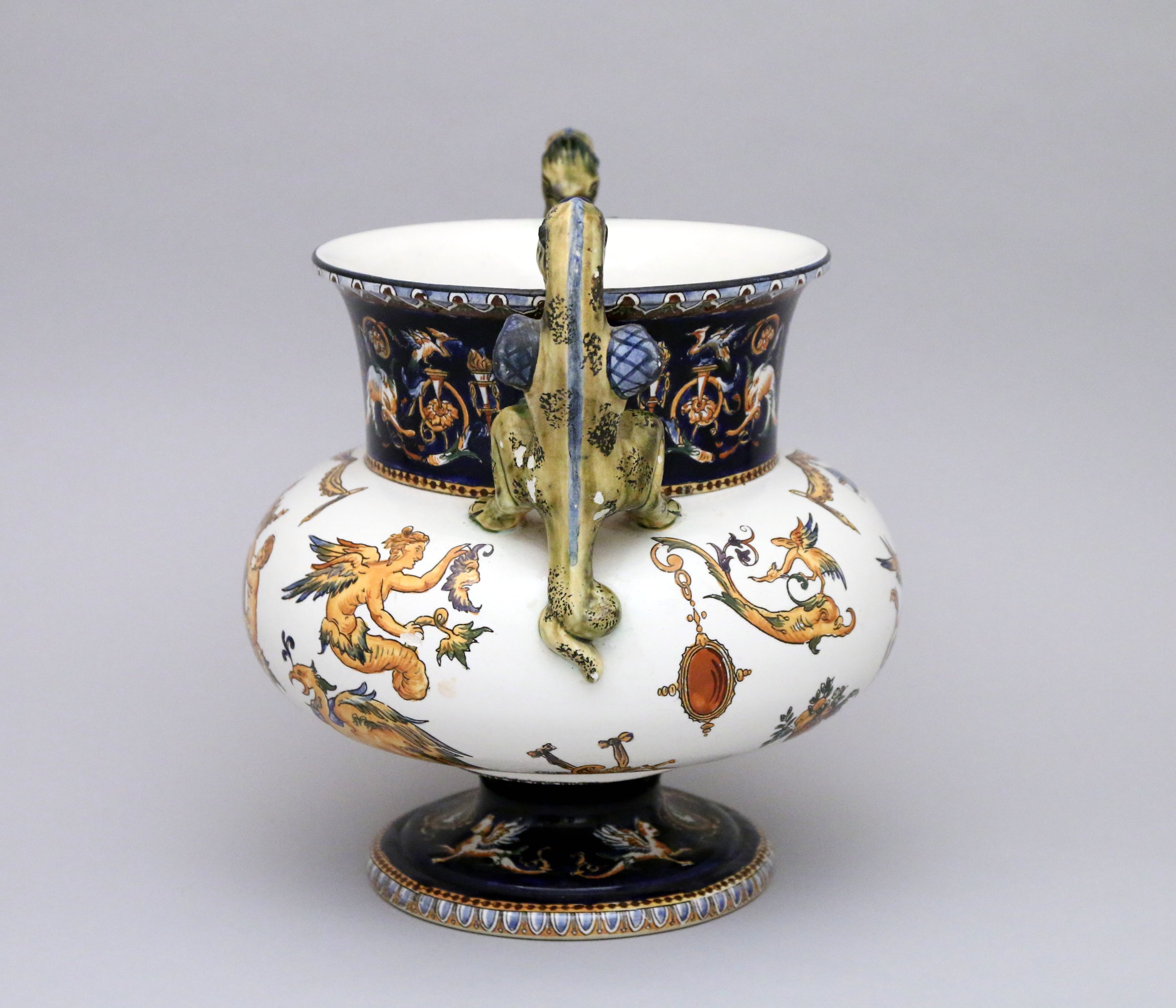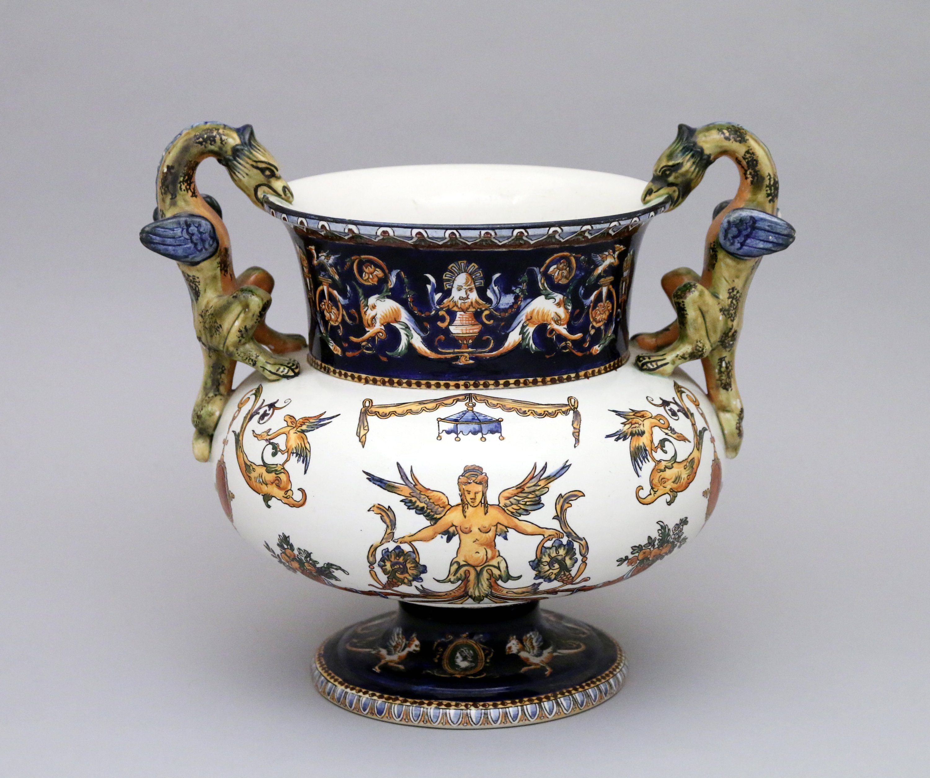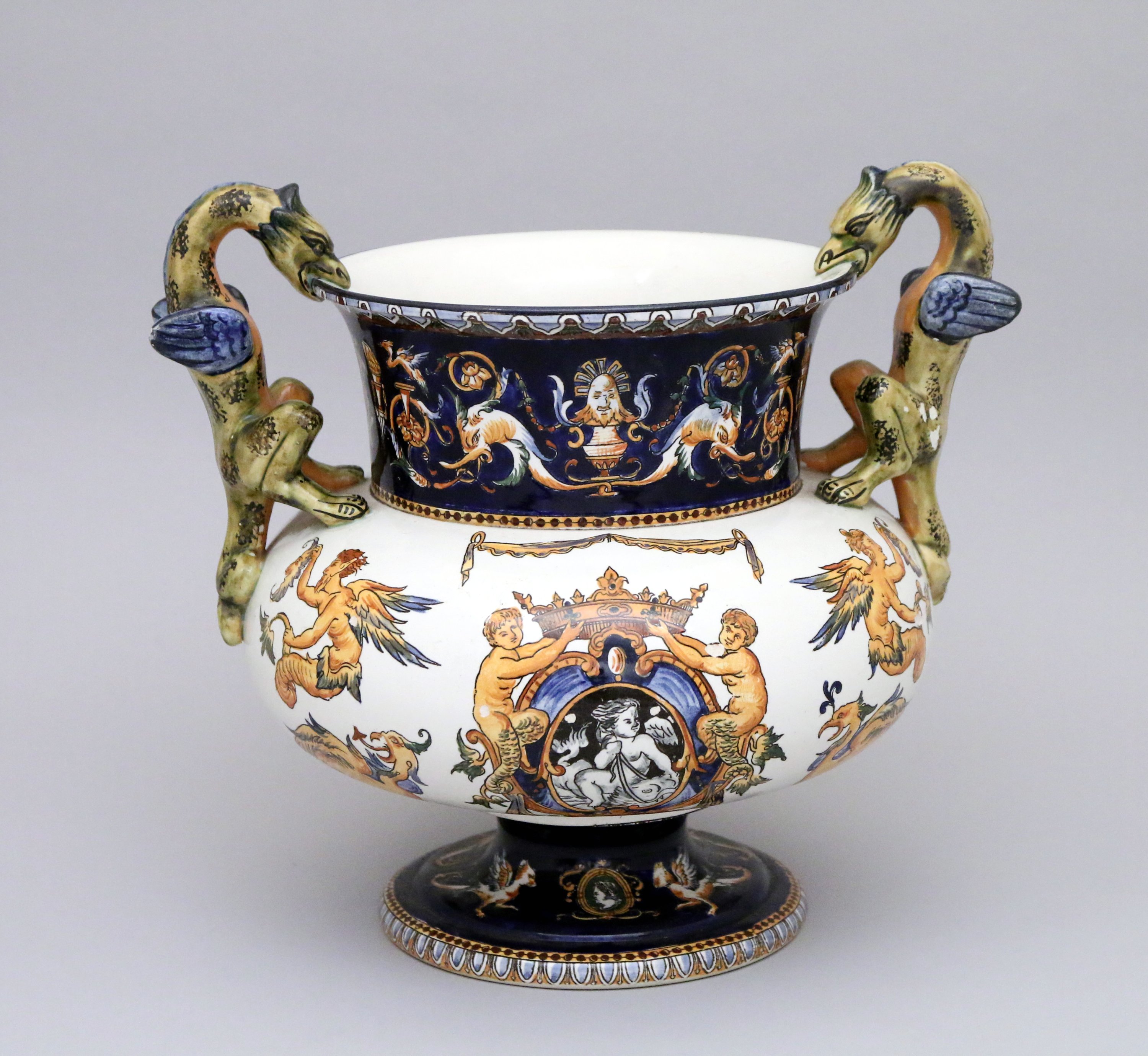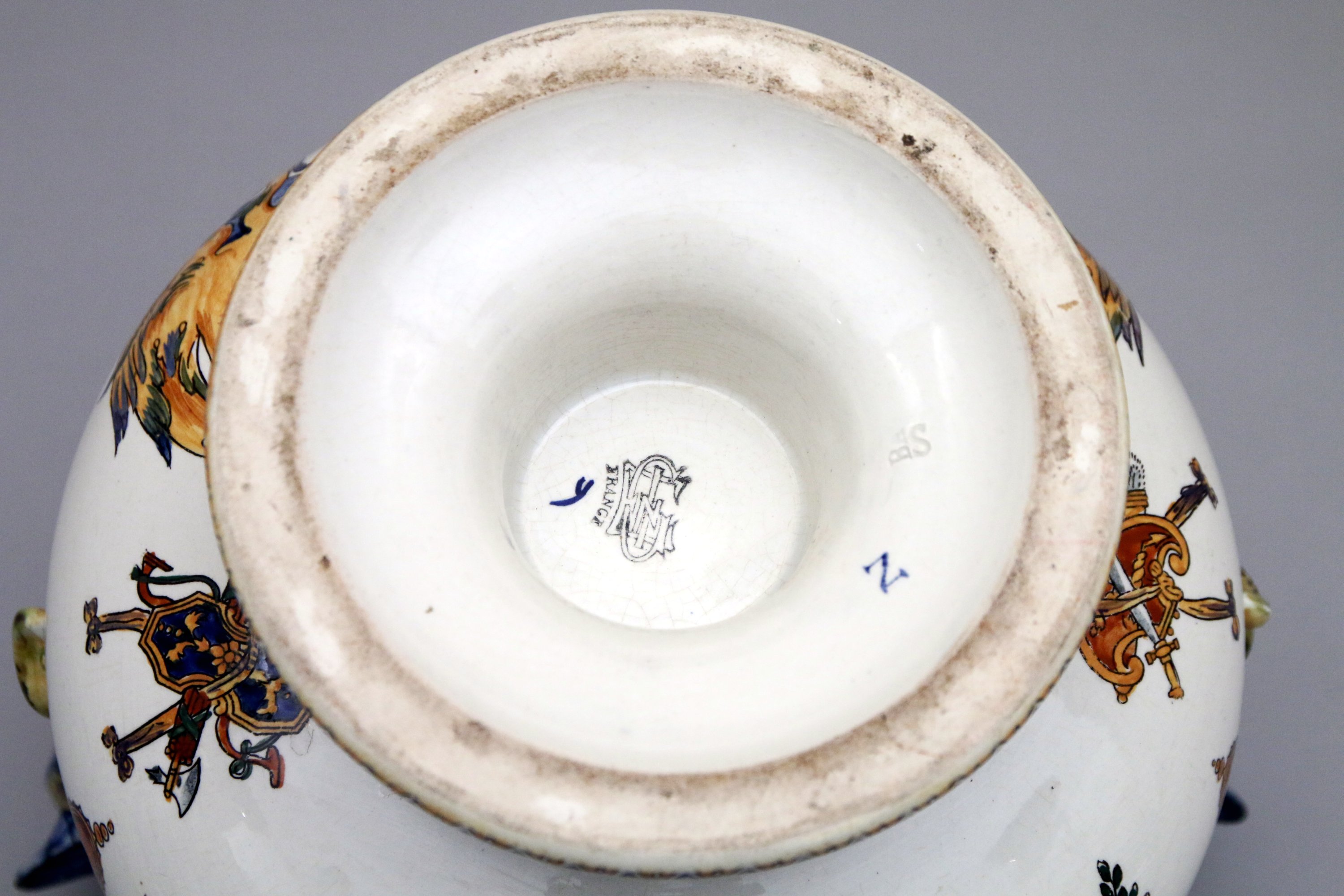 en céramique émaillée, décor peint de la Renaissance italienne à fond blanc avec cartouche couronné à l'amour marin.
