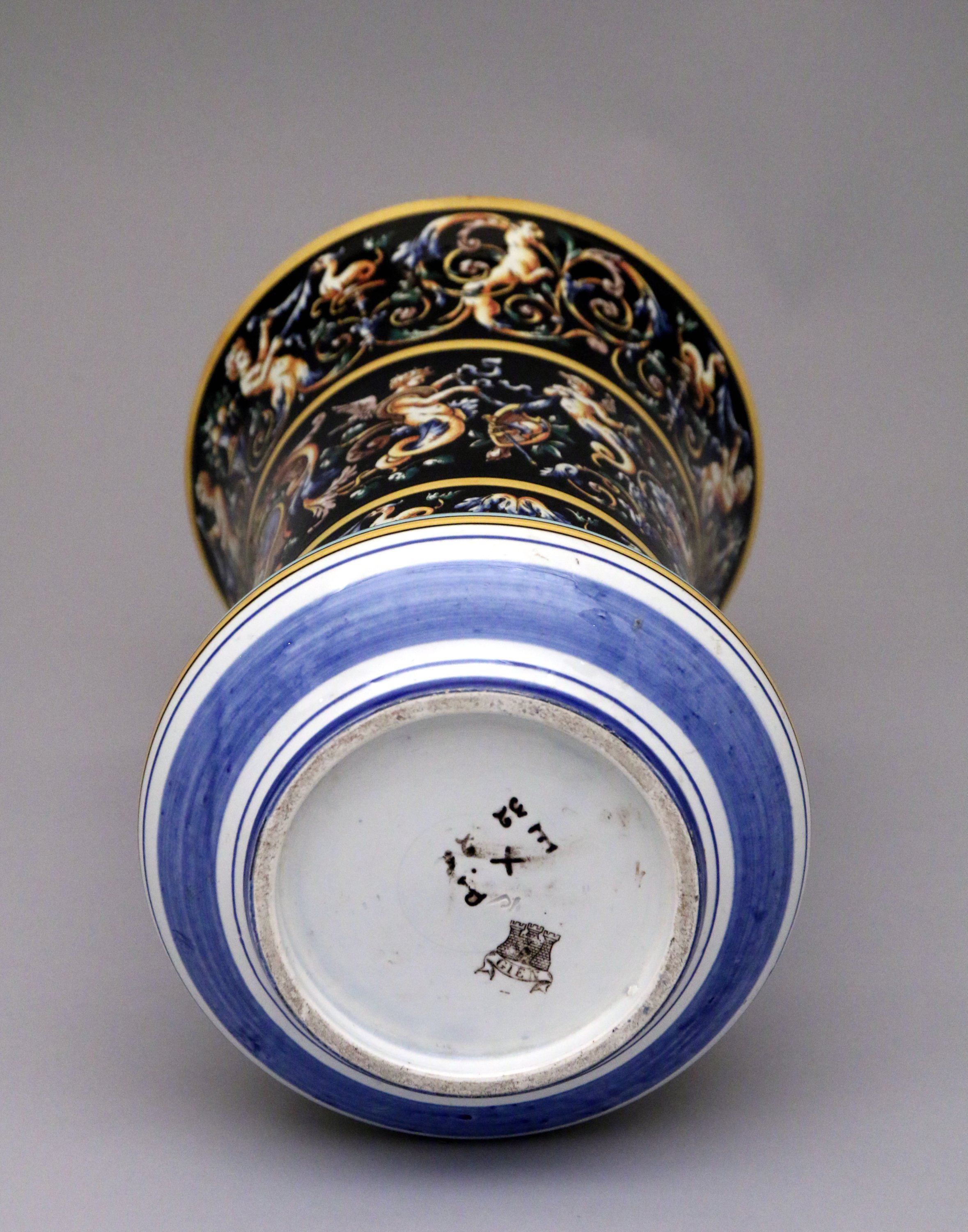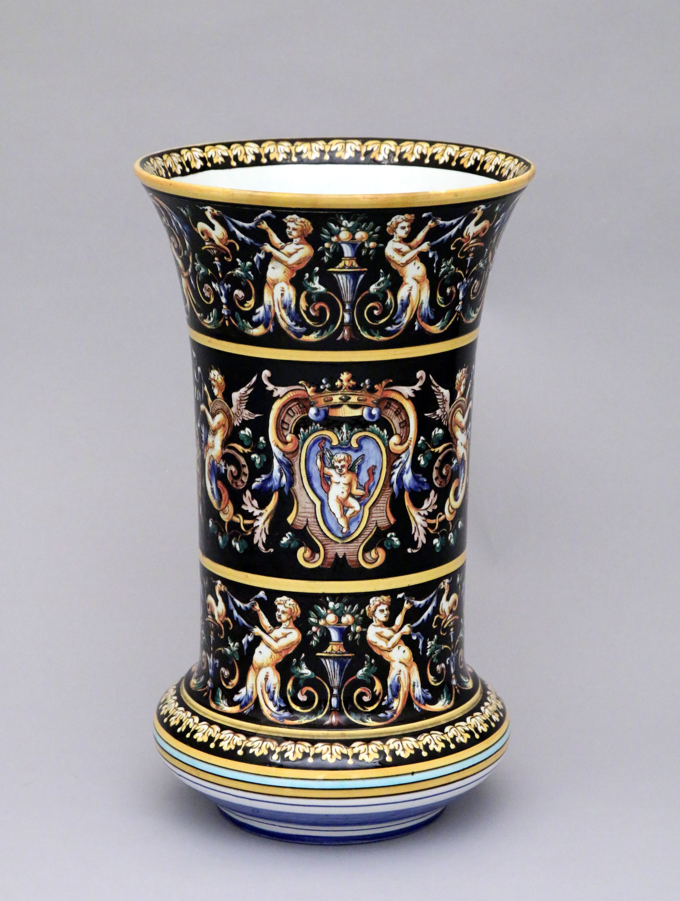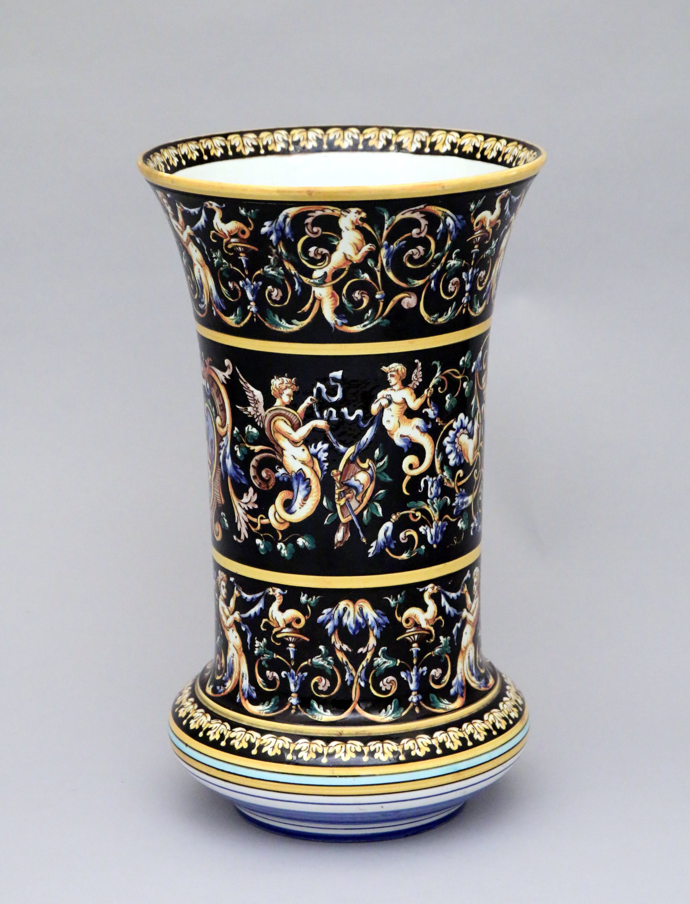 en céramique émaillée au décor de la Renaissance Italienne sur fond noir.