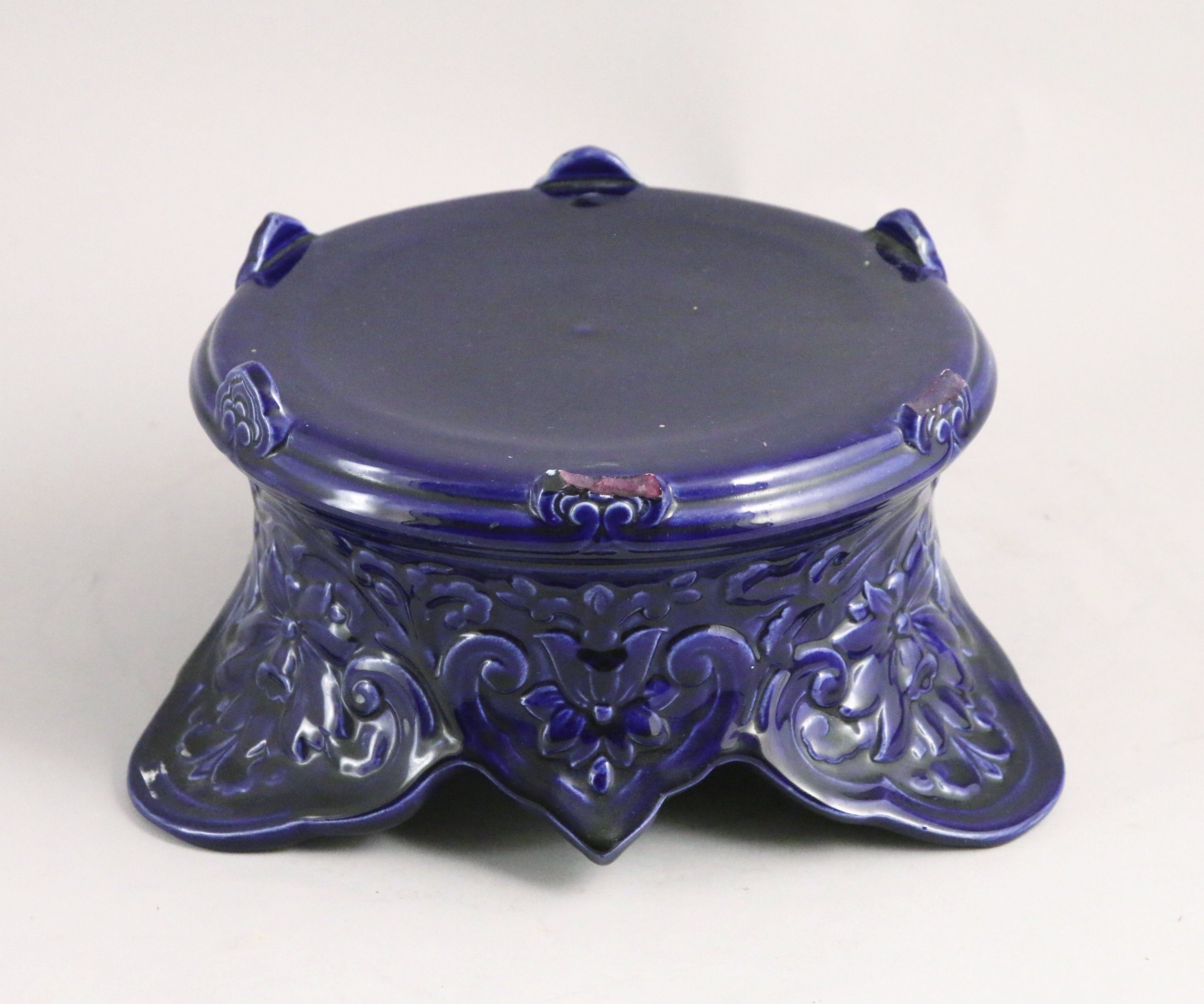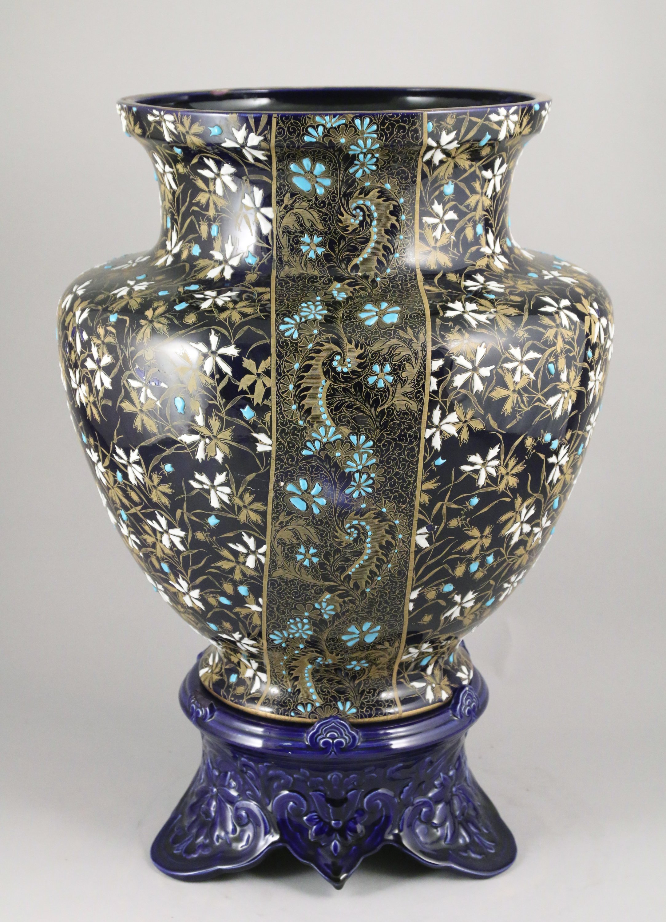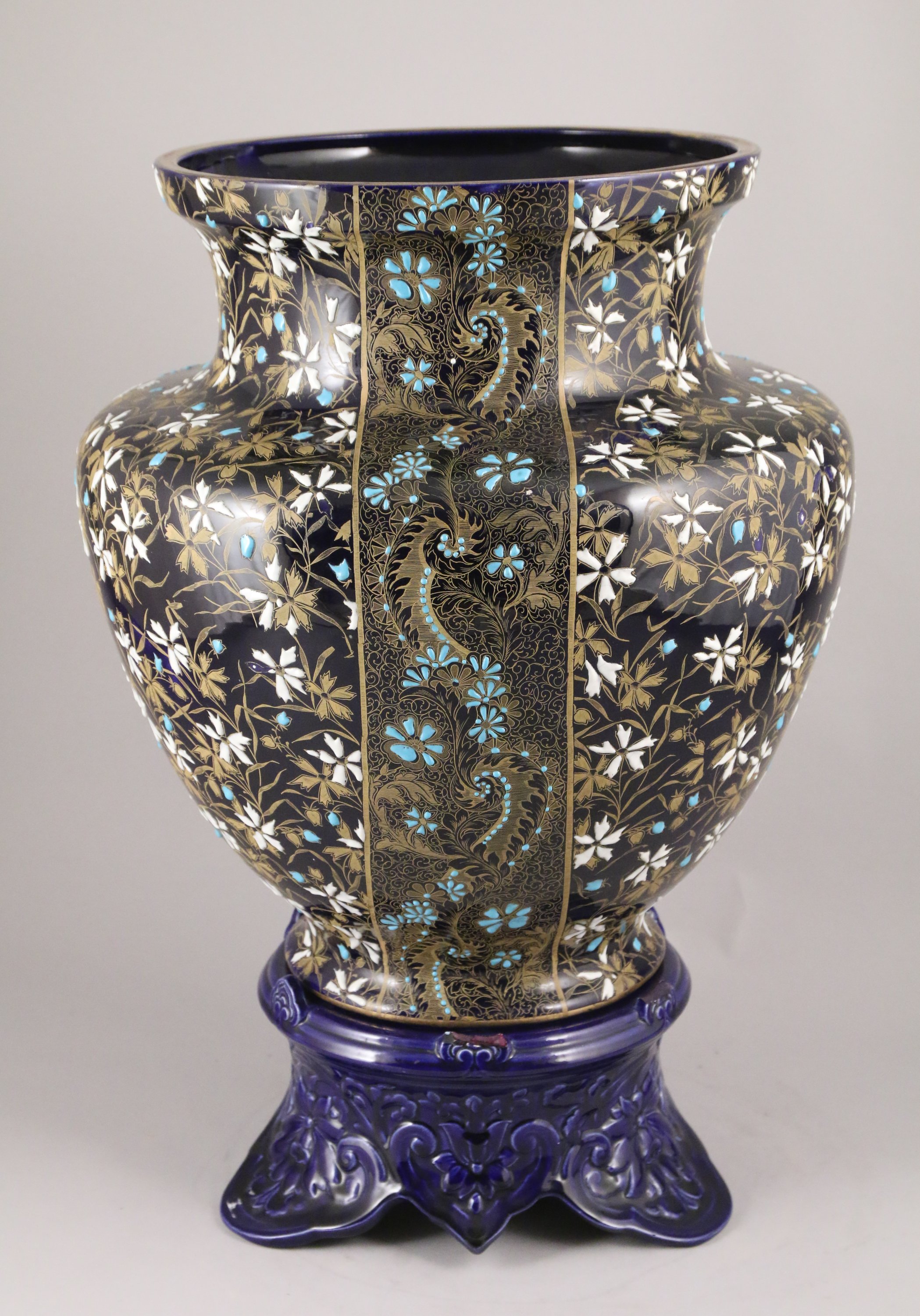 en céramique émaillée, à décor de feuillage à l'or et gouttes d'émail opaque blanc et turquoise sur fond bleu nuit séparés par des bandes de rinceaux. Socle tripode à décor en relief de rinceaux.