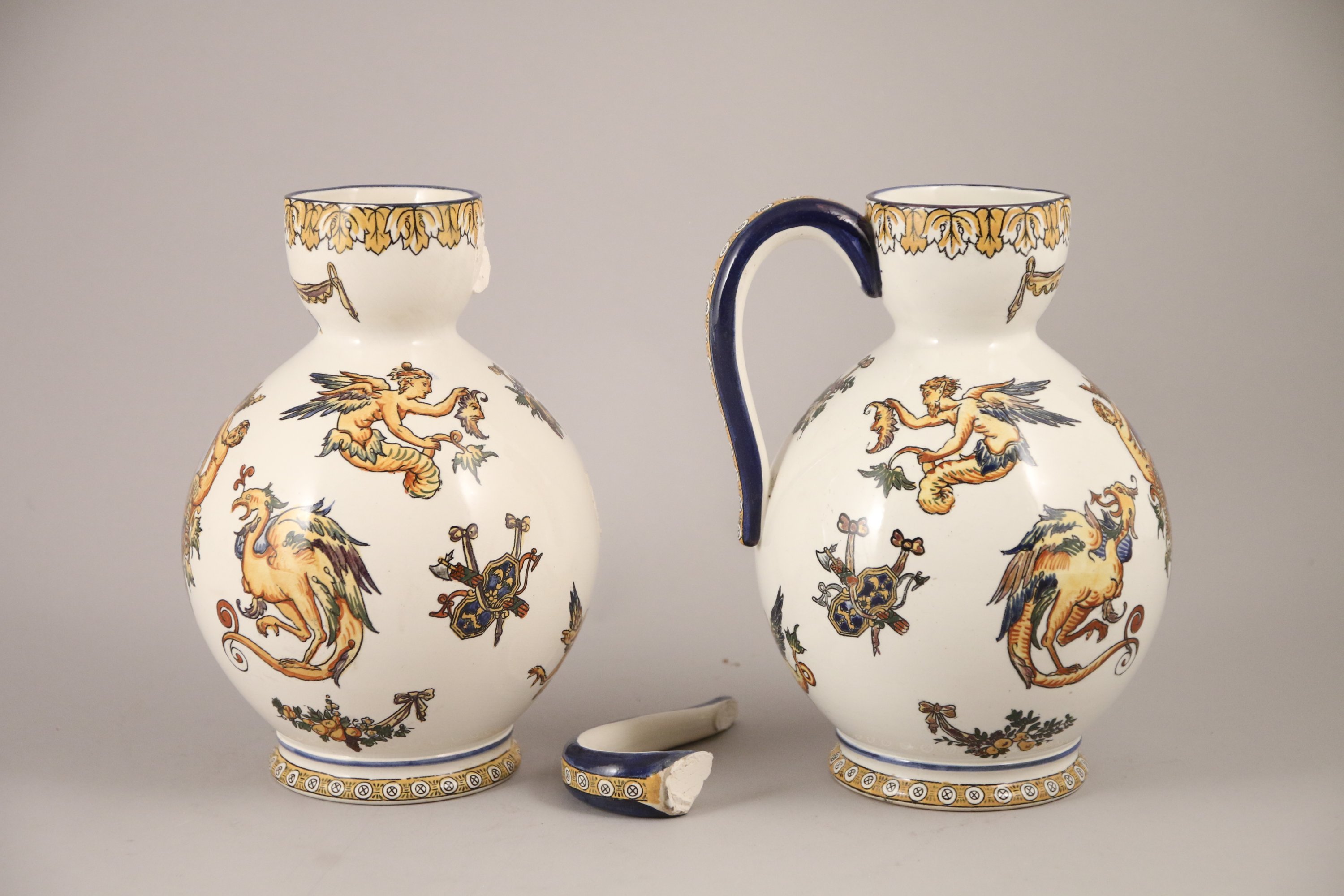 en céramique émaillée à décor de la Renaissance Italienne sur fond blanc de chimères et d'un cartouche à l'amour marin surmonté d'une couronne de marquis sous un dais.