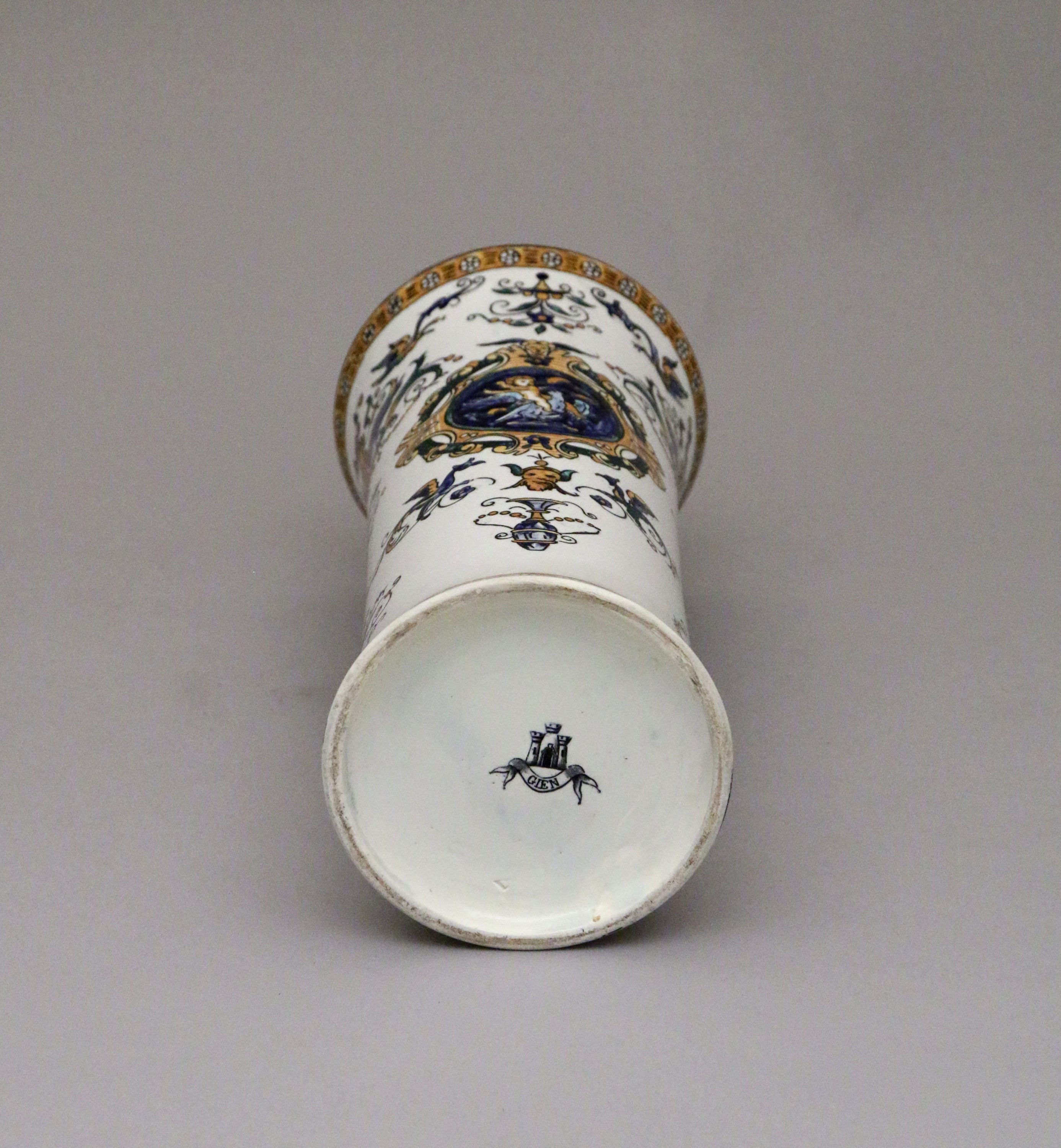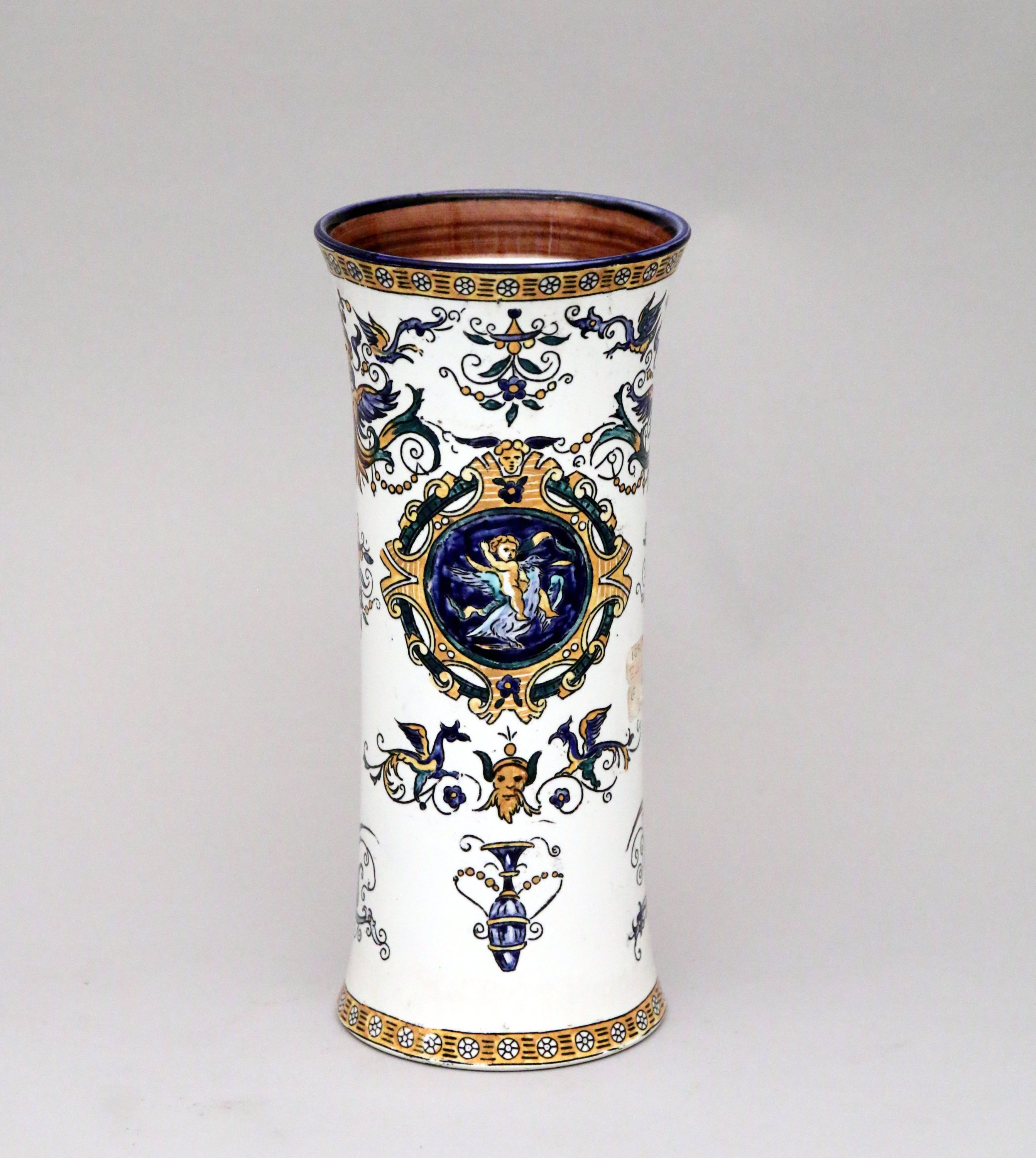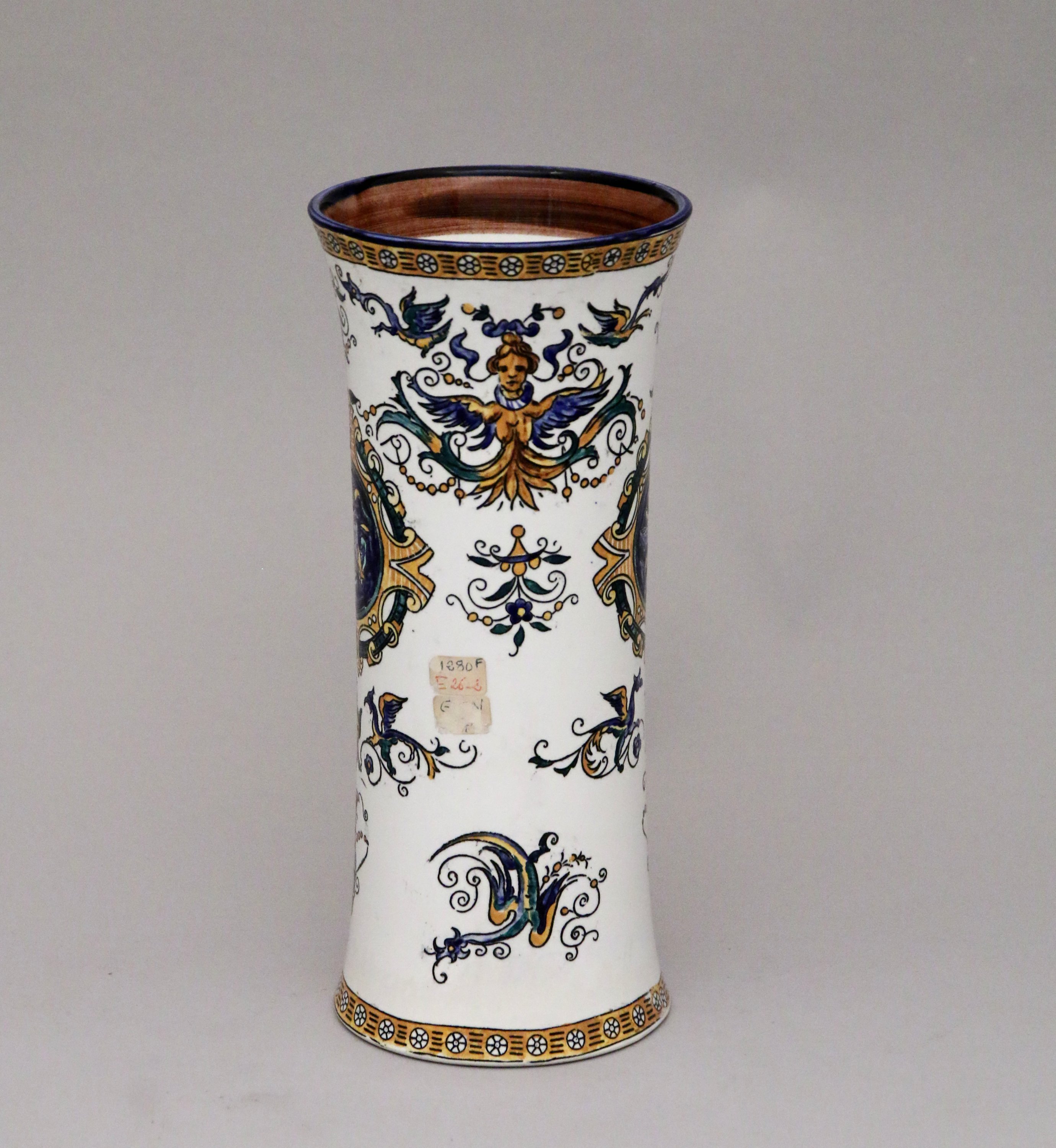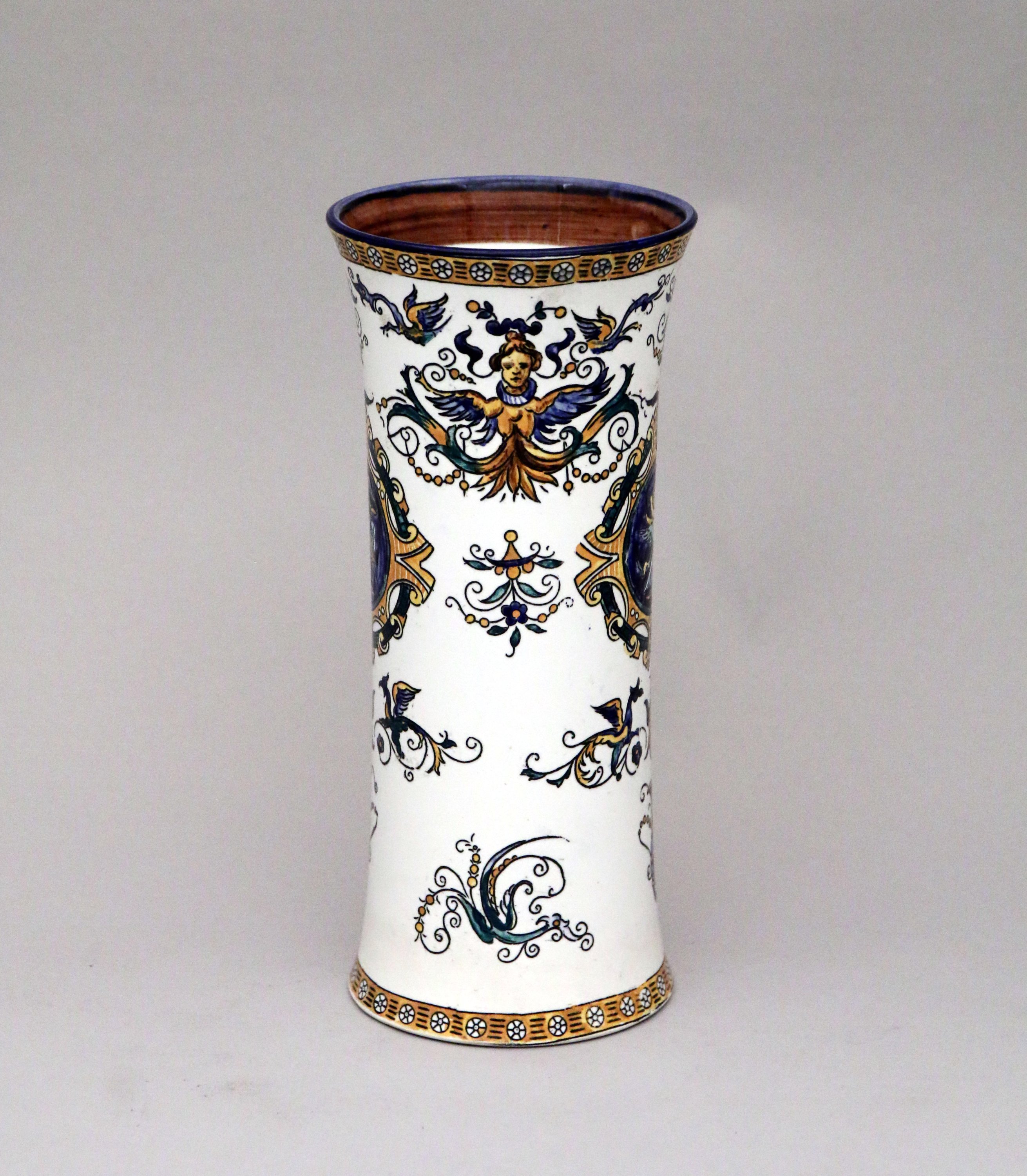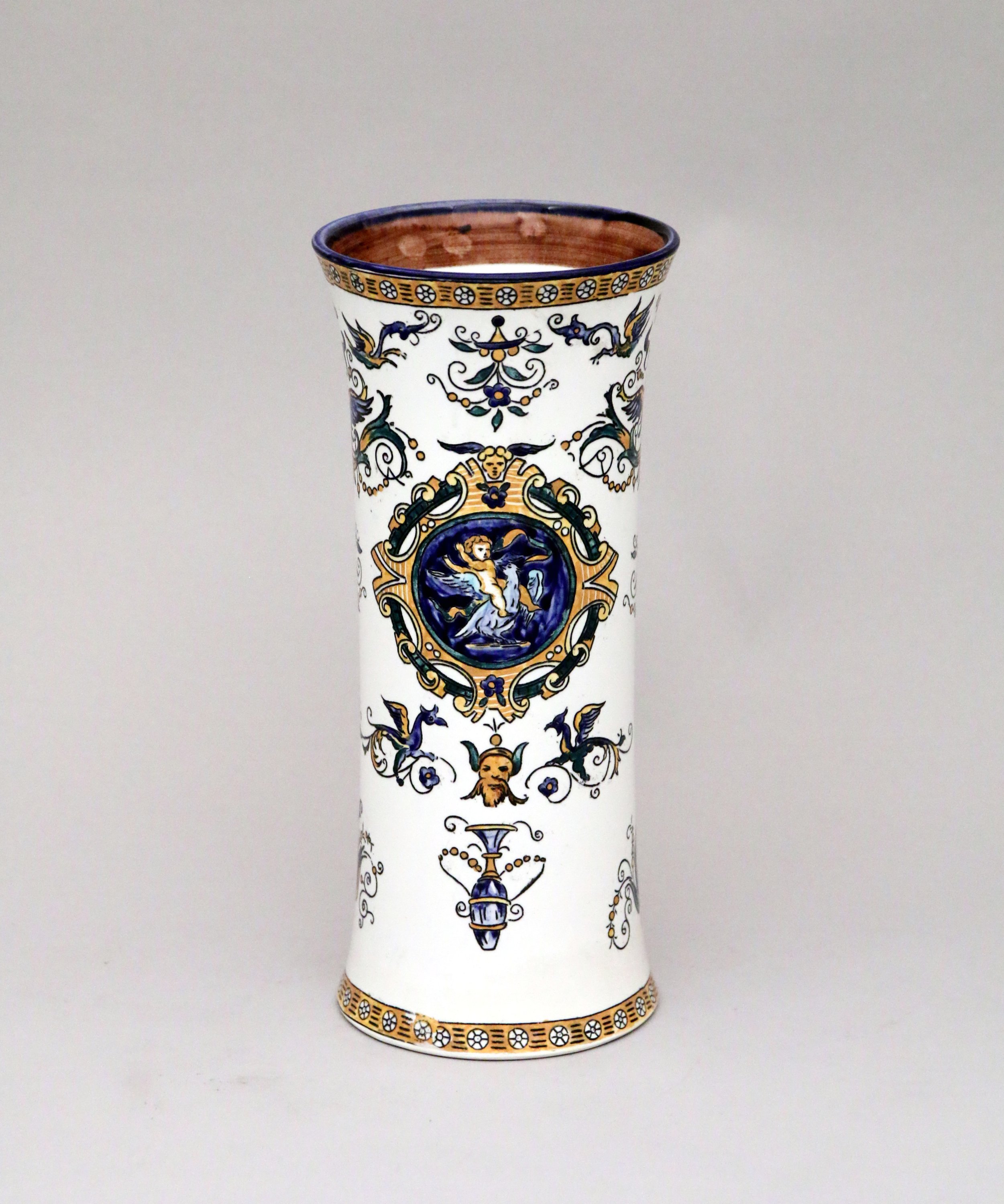 en céramique émaillée à décor de la Renaissance Italienne sur fond blanc de chimères et d'un cartouche à motif de cuir découpé représentant un amour sur un oiseau tenant dans ses mains un ruban.