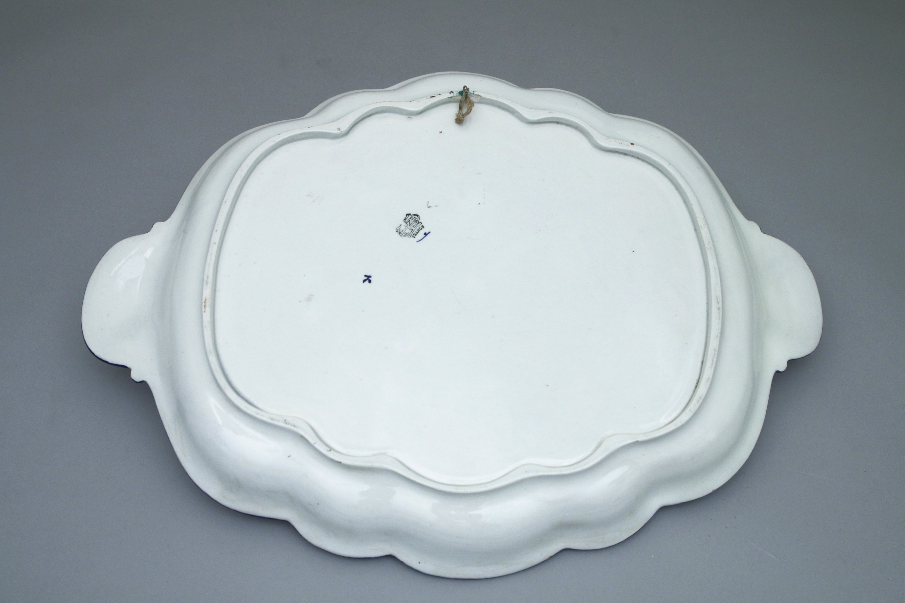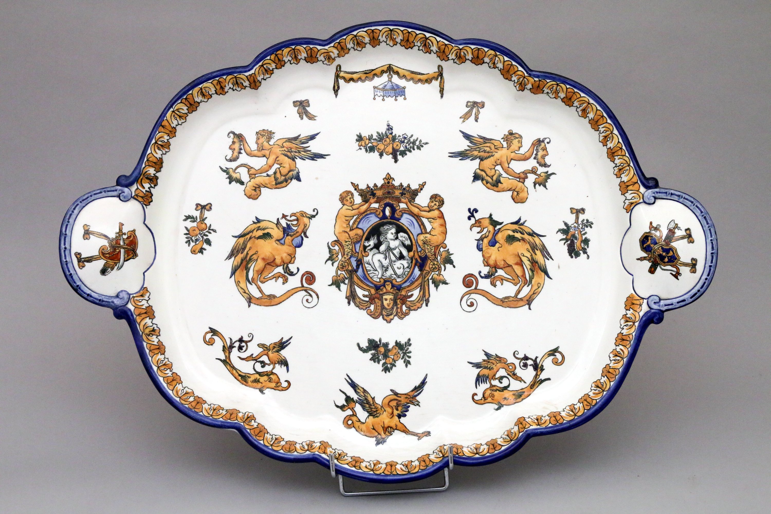 en céramique émaillée à décor de la Renaissance Italienne sur fond blanc de chimères et d'un cartouche à l'amour marin surmonté d'une couronne de marquis sous un dais, les prises à motifs de trophées guerriers. La bordure décorée de feuilles soulignée d'un filet bleu.