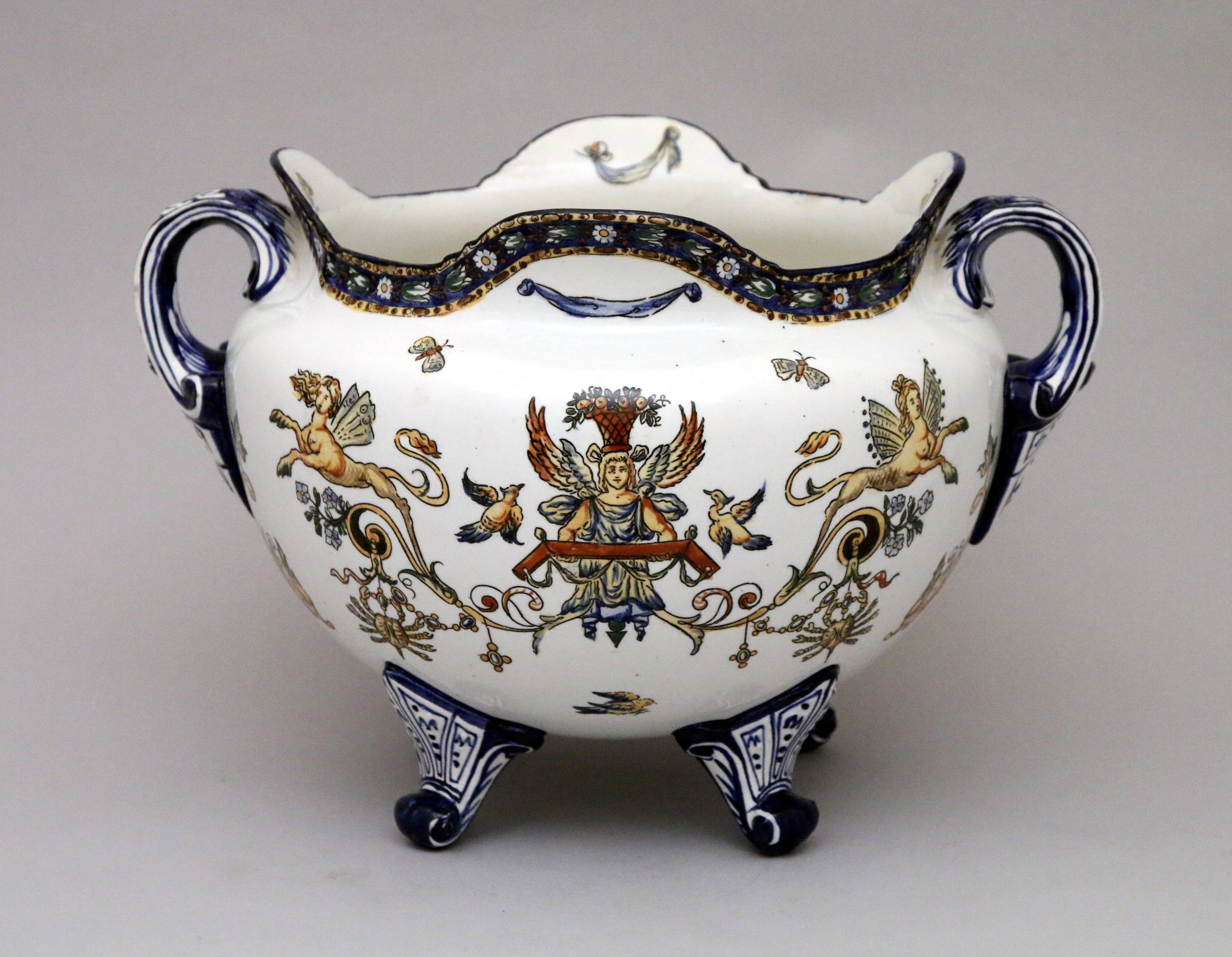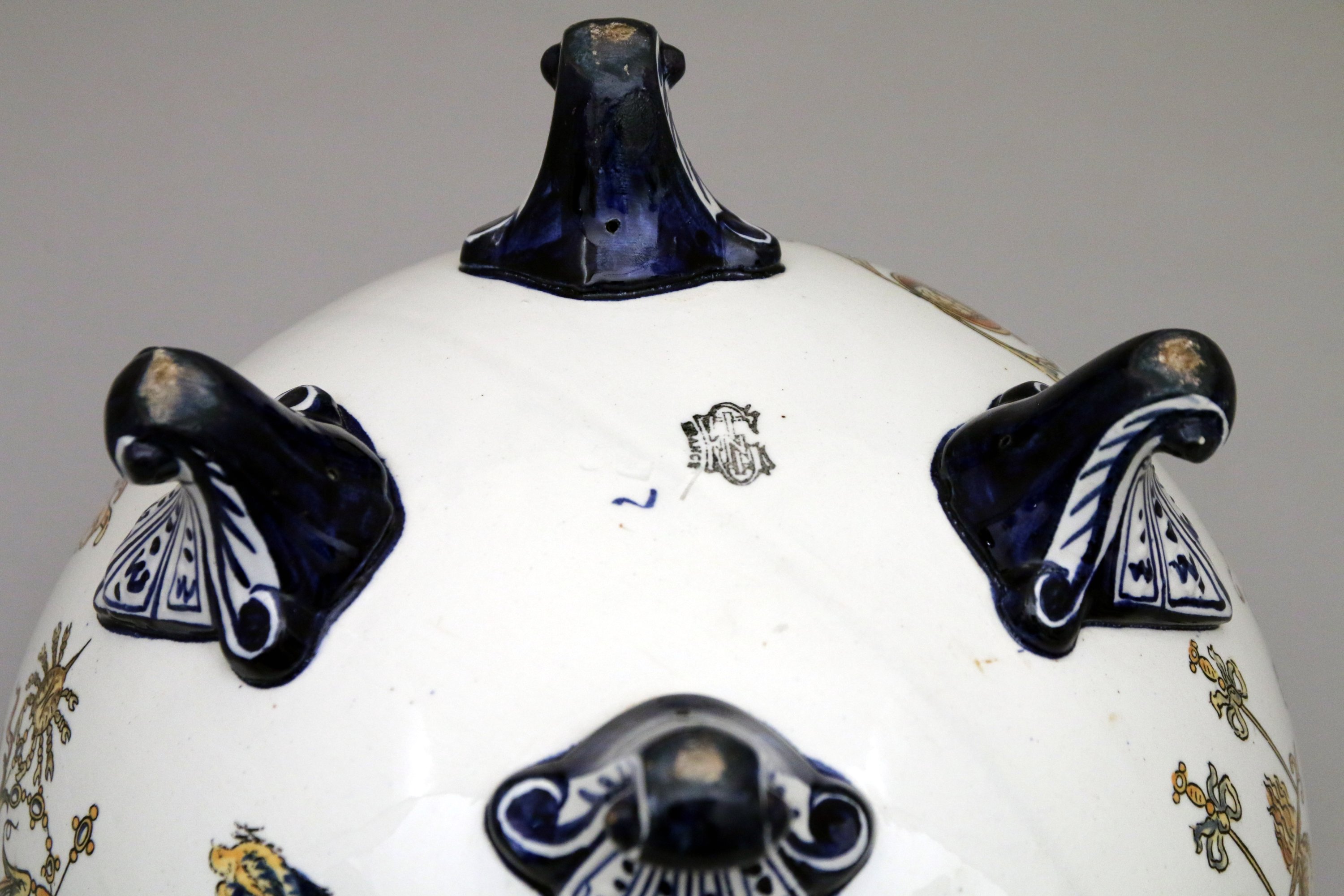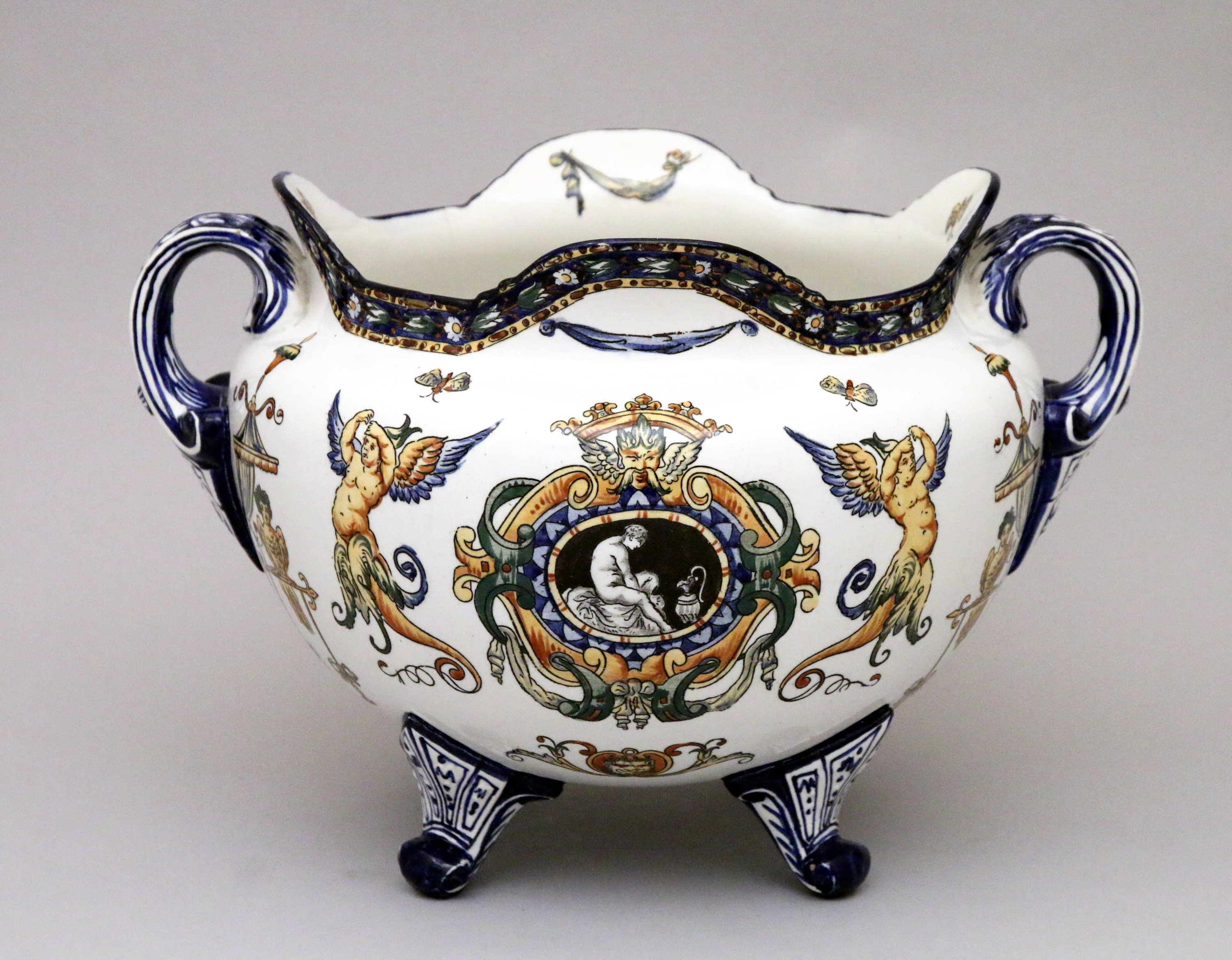 en céramique émaillée de forme ventrue dite " BERNARD " à décor de la Renaissance Italienne sur fond blanc de chimères et d'un cartouche figurant une femme à sa toilette surmontée d'une couronne de marquis.