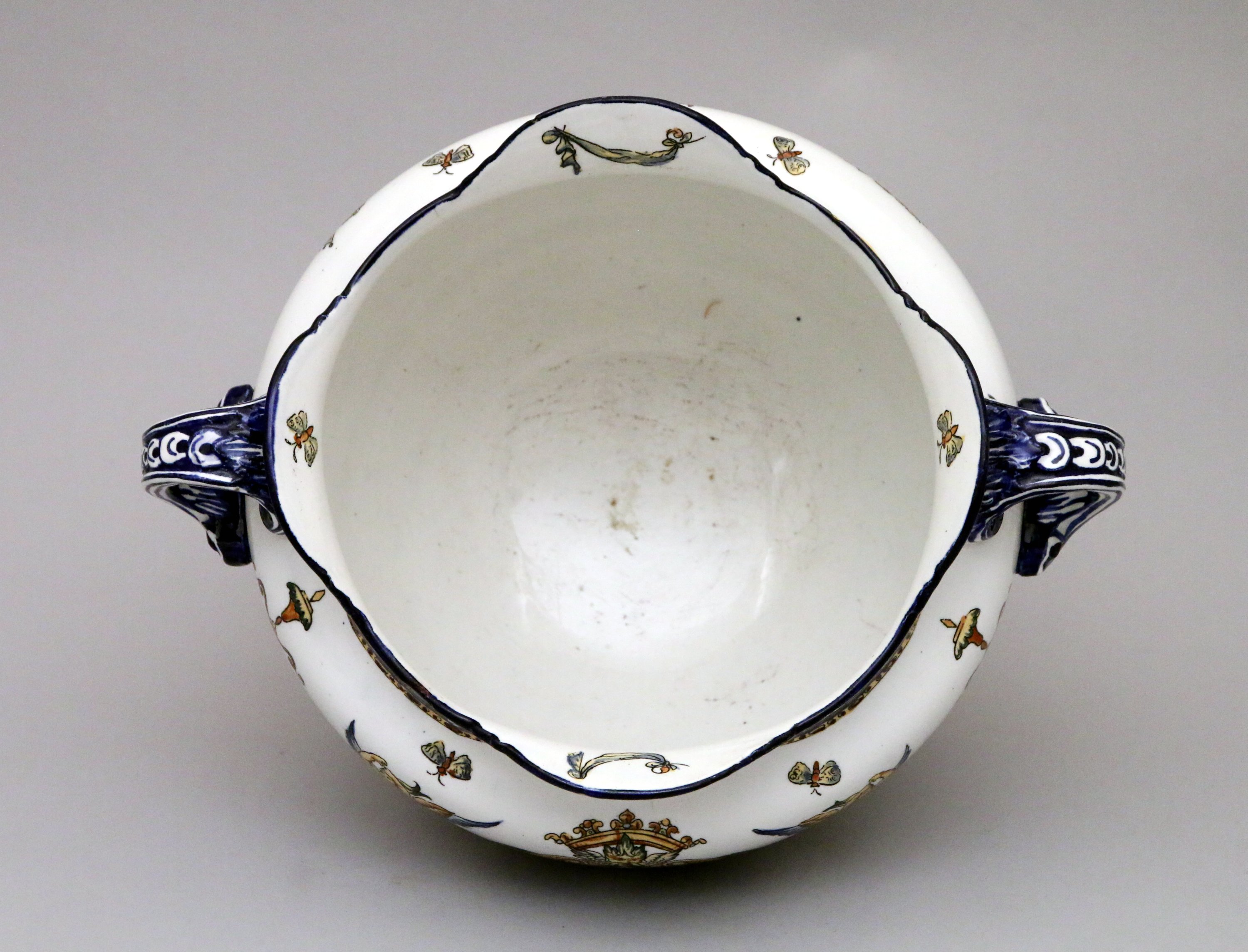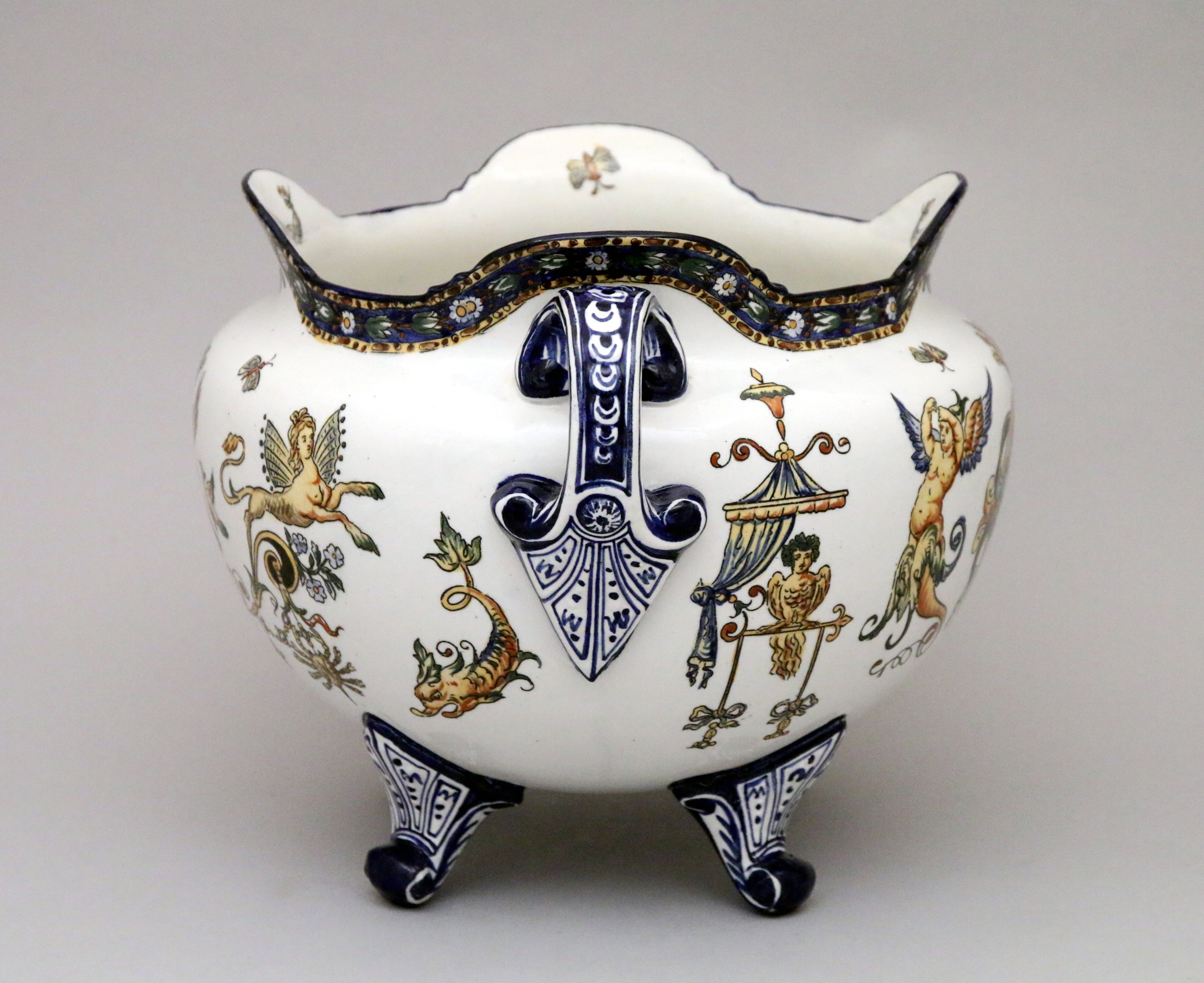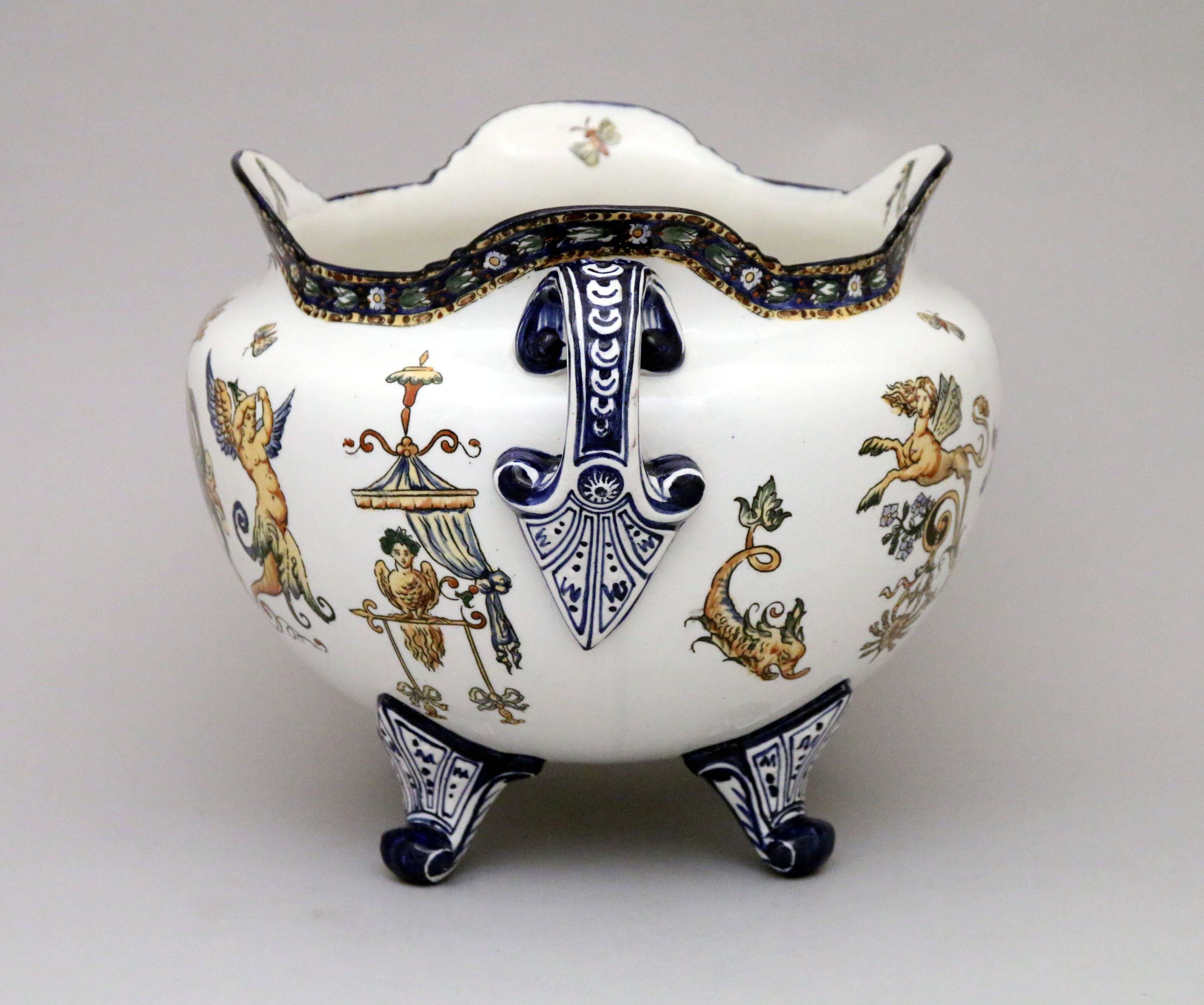 en céramique émaillée de forme ventrue dite " BERNARD " à décor de la Renaissance Italienne sur fond blanc de chimères et d'un cartouche figurant une femme à sa toilette surmontée d'une couronne de marquis.