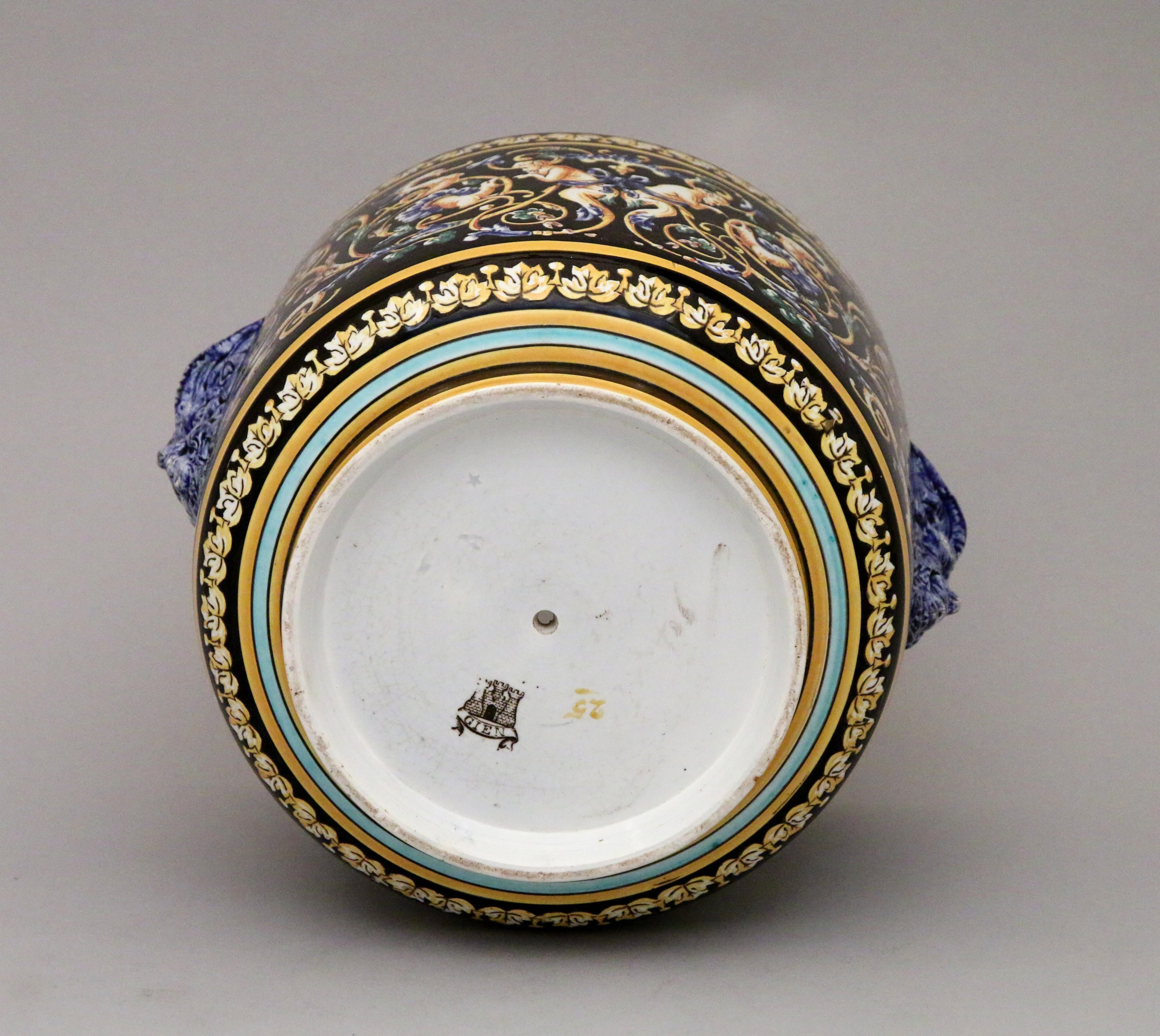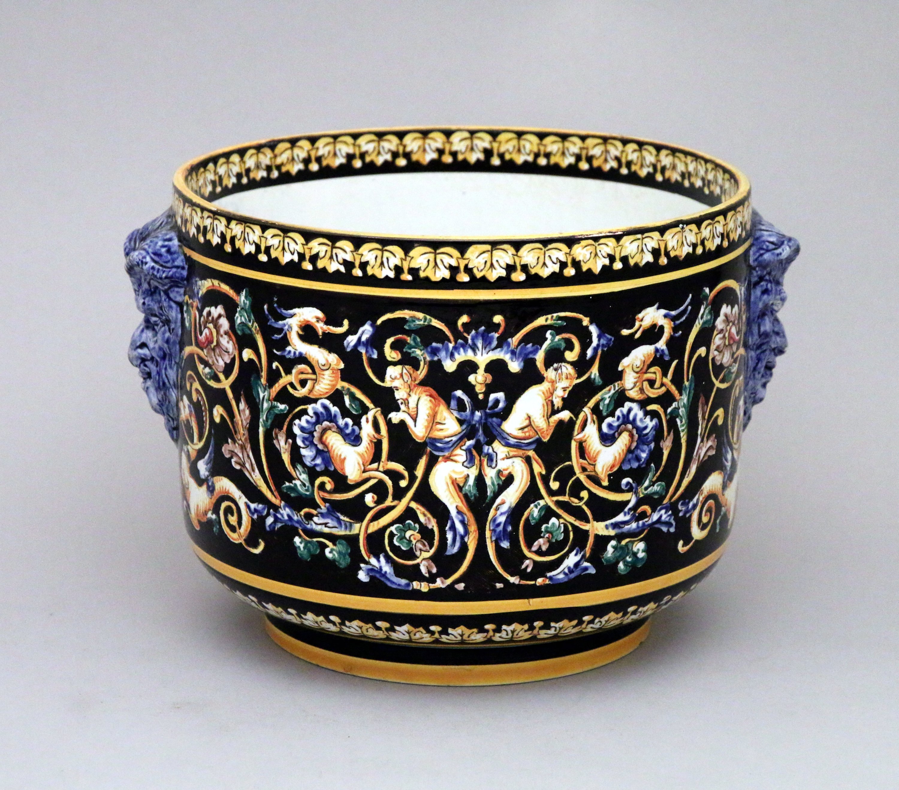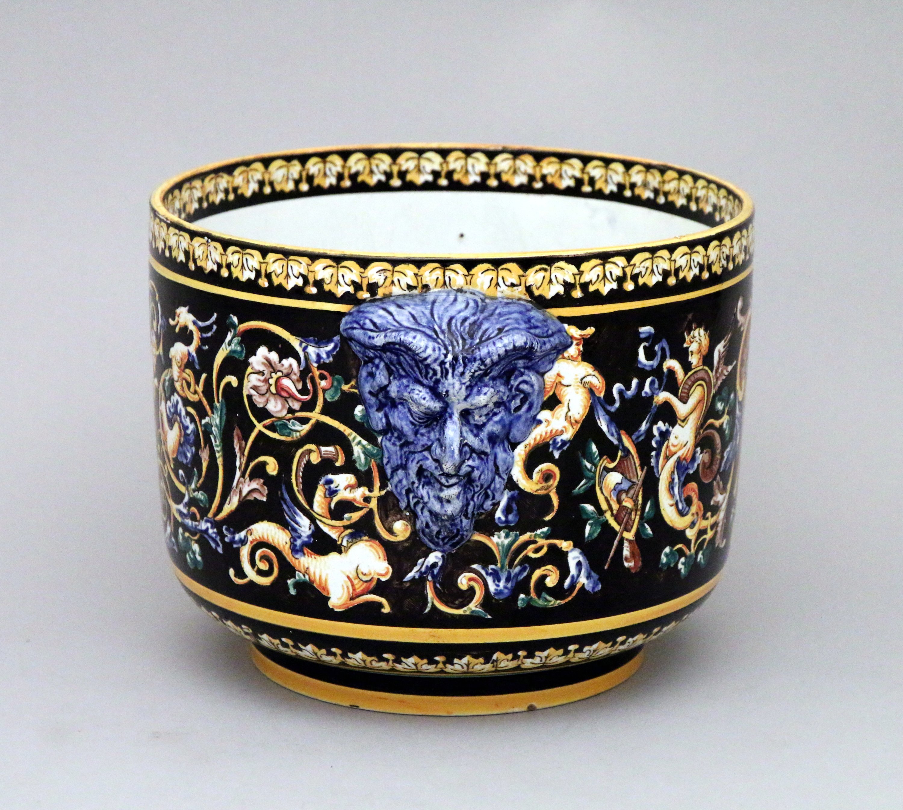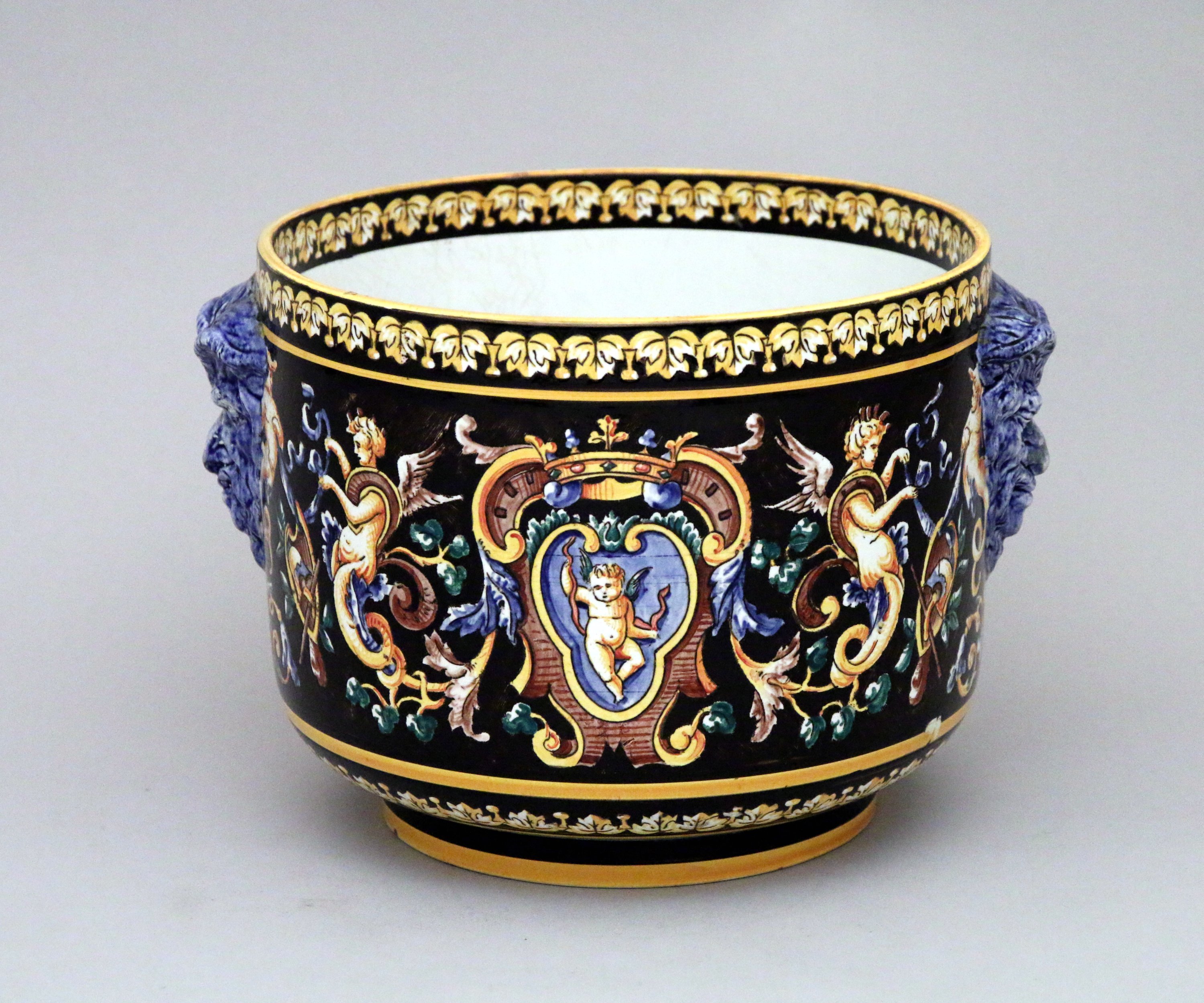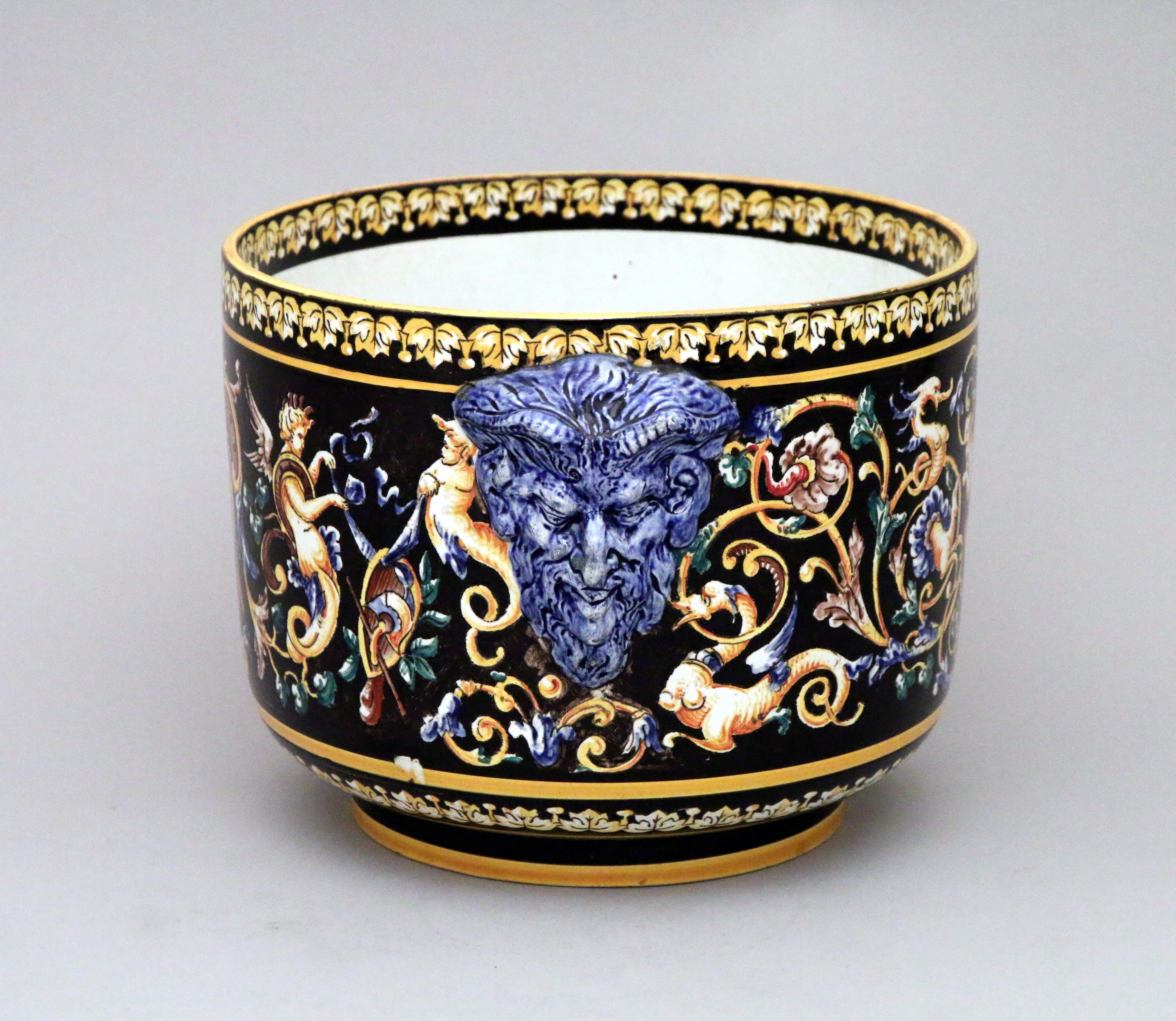 en céramique émaillée à décor de la Renaissance Italienne sur fond noir de chimères et d'un cartouche à motif de cuir découpé représentant un amour ailé tenant dans ses mains un ruban, surmonté d'une couronne de marquis. Prises à têtes de satyres.