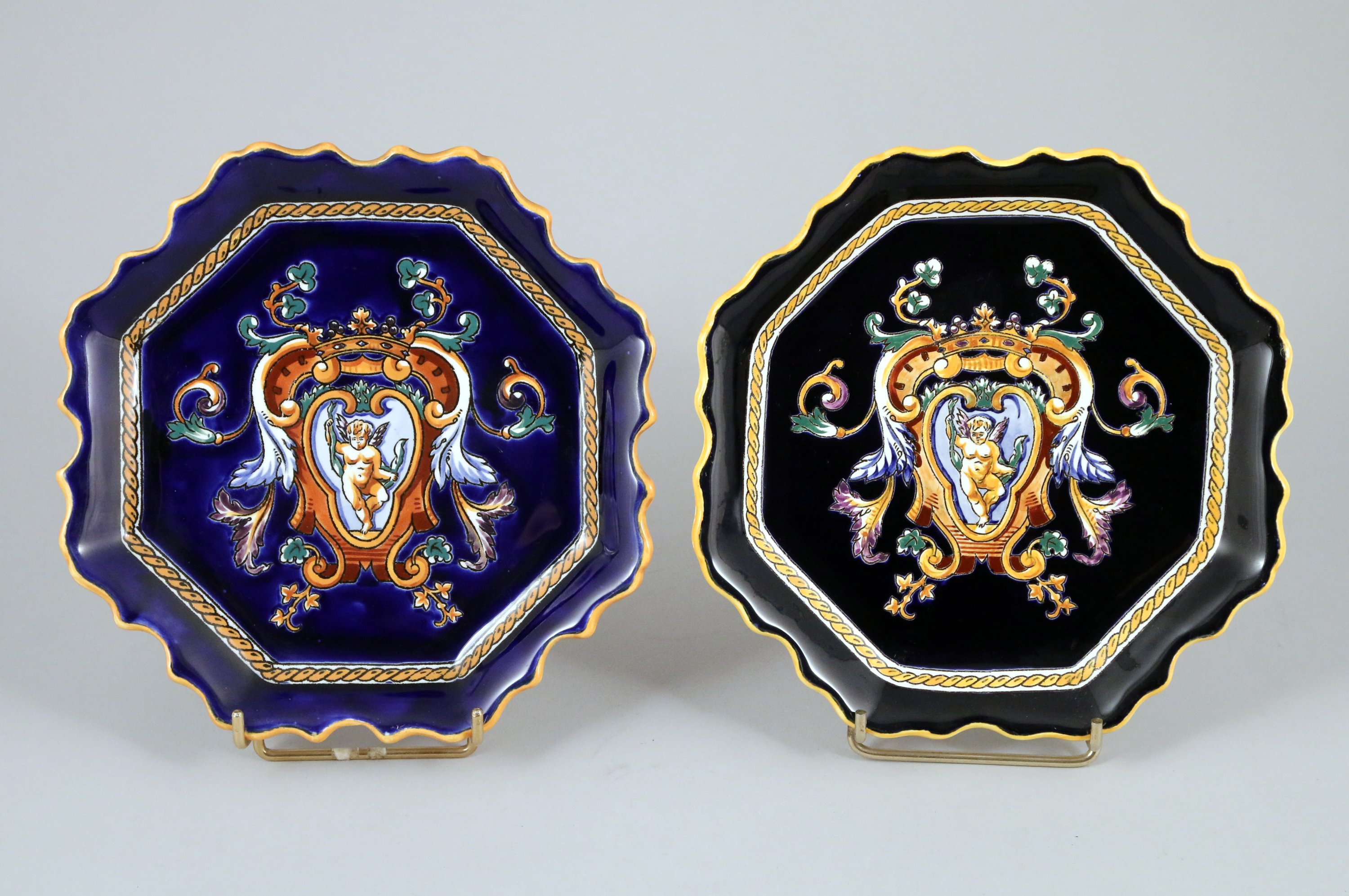 en céramique émaillée à décor au centre d'un cartouche à motif de cuir découpé et feuillagé d'un amour ailé tenant dans ses mains un ruban surmonté d'une couronne de marquis. L'un sur fond bleu et l'autre sur fond noir.